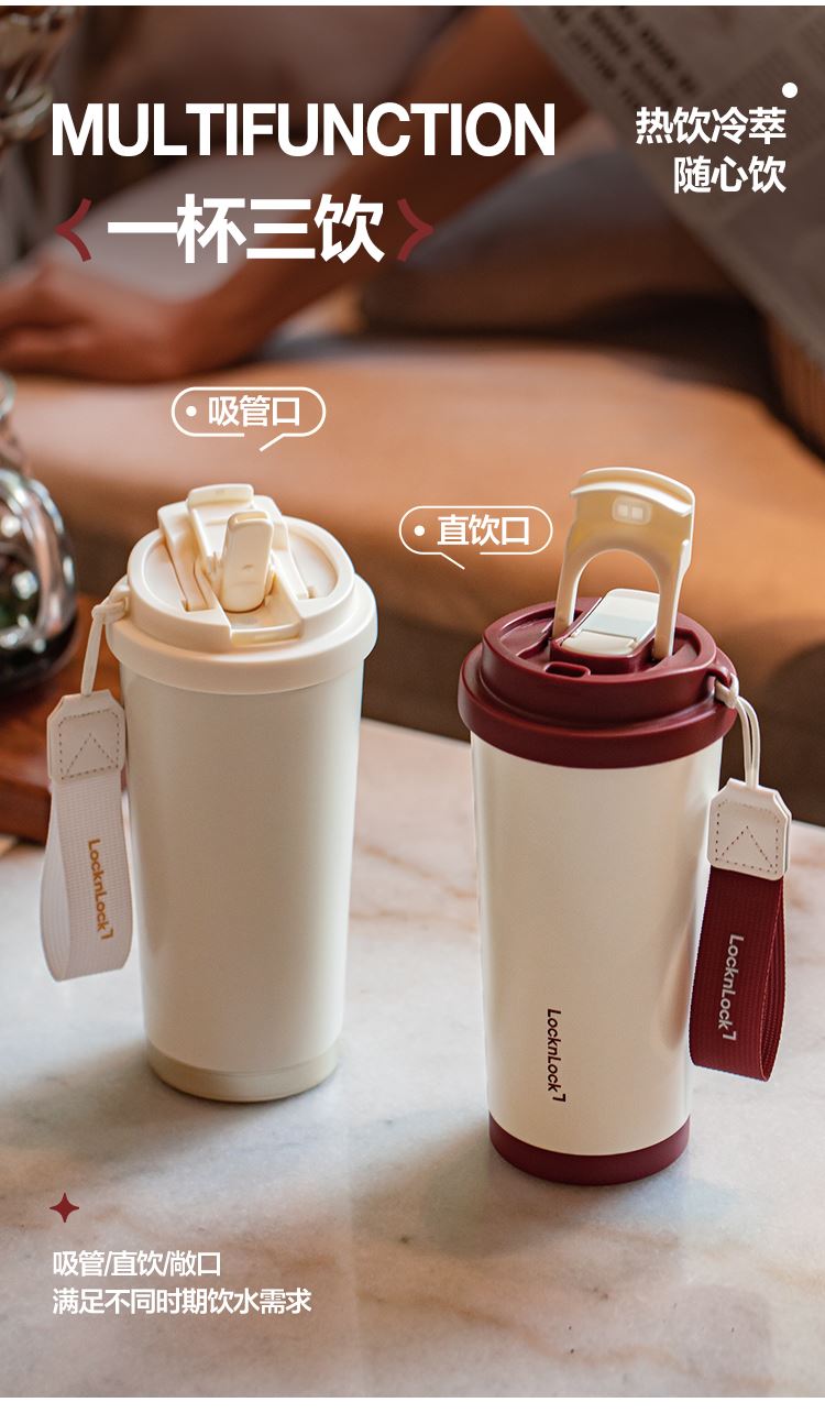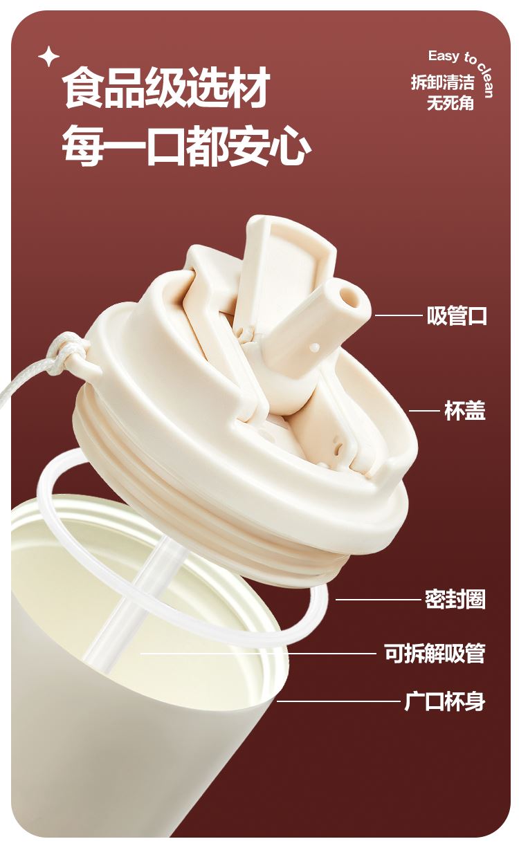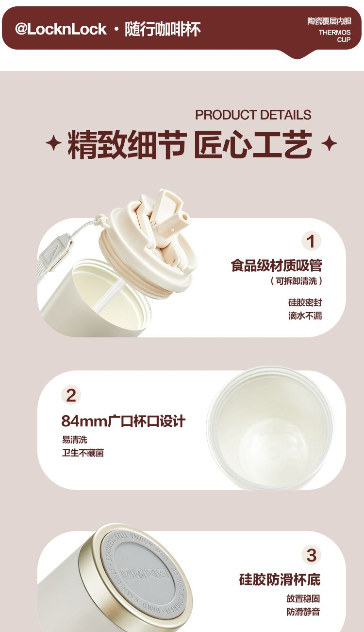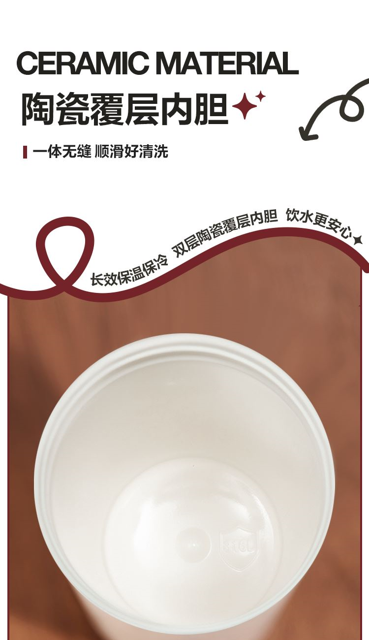 产品特点: 1.升级陶瓷覆层内胆,光滑不沾,一冲即净 2.一盖双饮(吸管口、直饮口) 3.全身可拆卸,大口径杯口方便清洗。 4.搭配同色系手提绳,实用性更强。 5.内胆:316L不锈钢+陶瓷覆层,杯盖:PP材质,吸管嘴、密封圈、气阀:硅胶