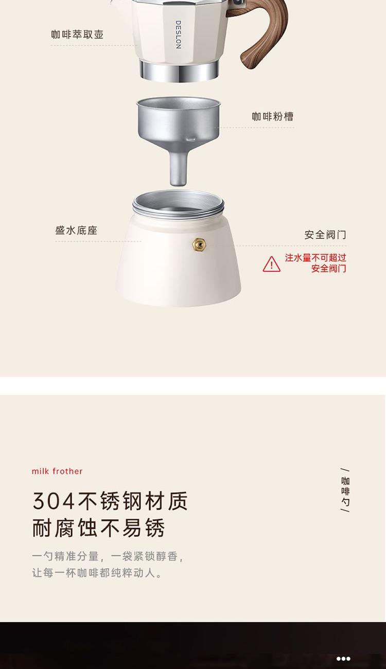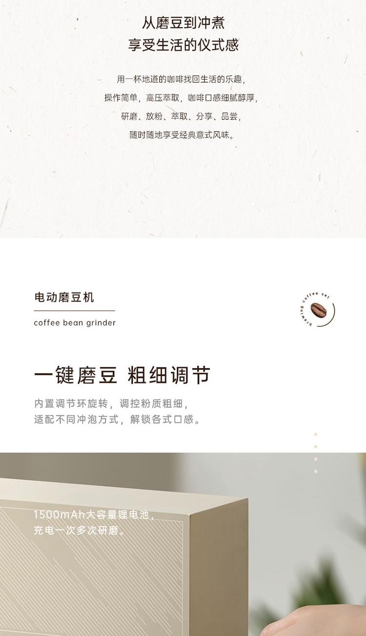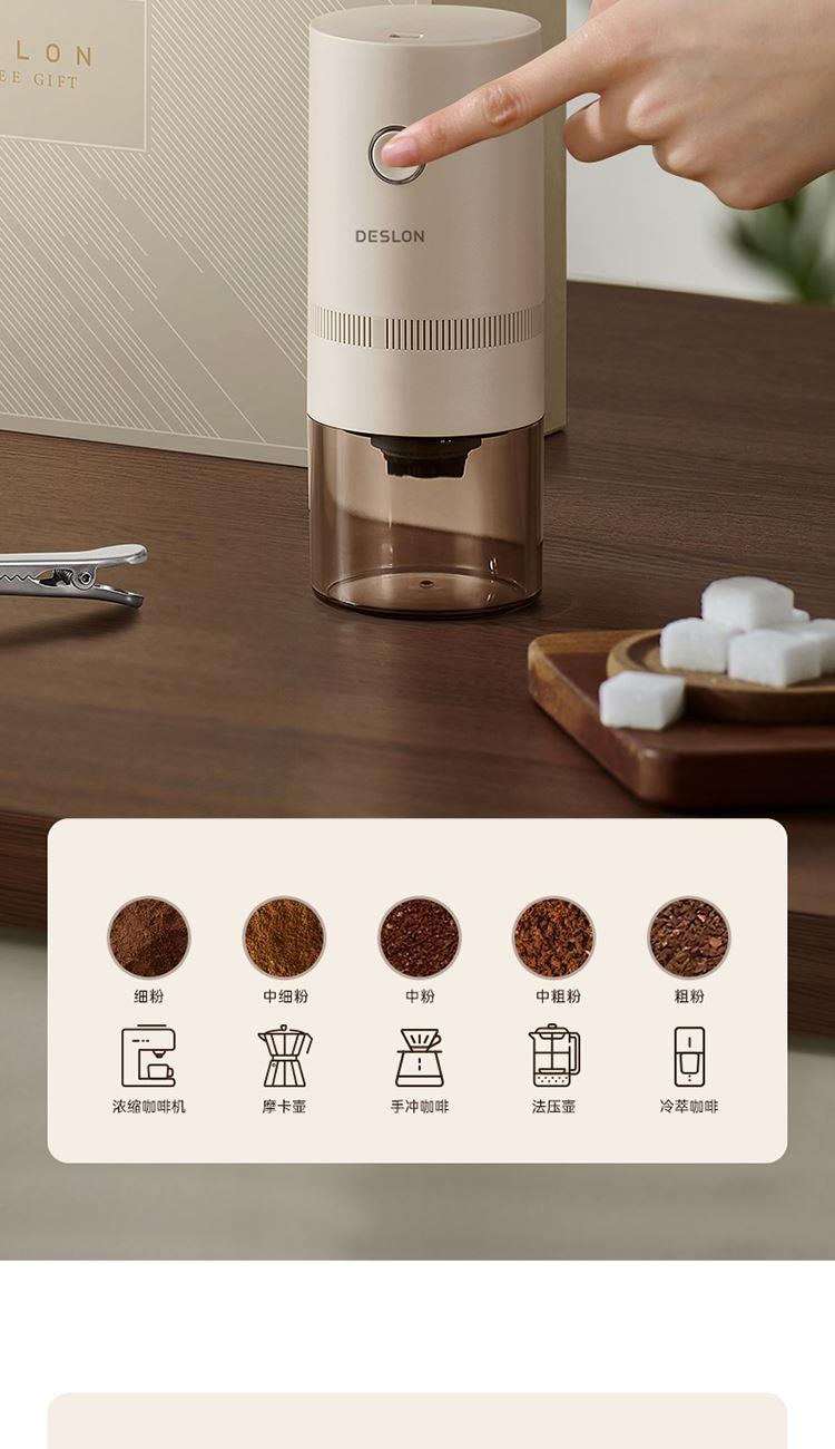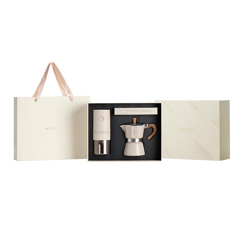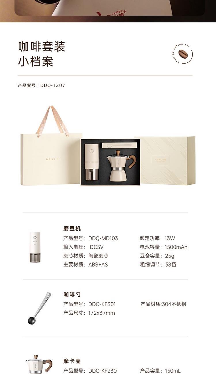 磨豆机 产品型号:DDQ-MD103 输入电压:DC5V 额定功率:13W 电池容量:1500mAh 磨芯材质:陶瓷磨芯 豆仓容量:25g 主要材质:ABS+AS 粗细调节:内置调节 摩卡壶 产品型号:DDQ-KF230 产品容量:150mL 主要材质:铝合金 咖啡勺 产品型号:DDQ-KFS01 产品材质:304不锈钢 产品尺寸:172*37mm