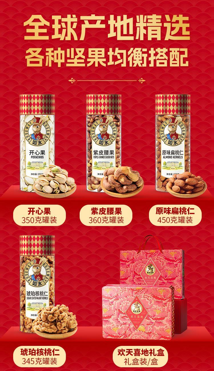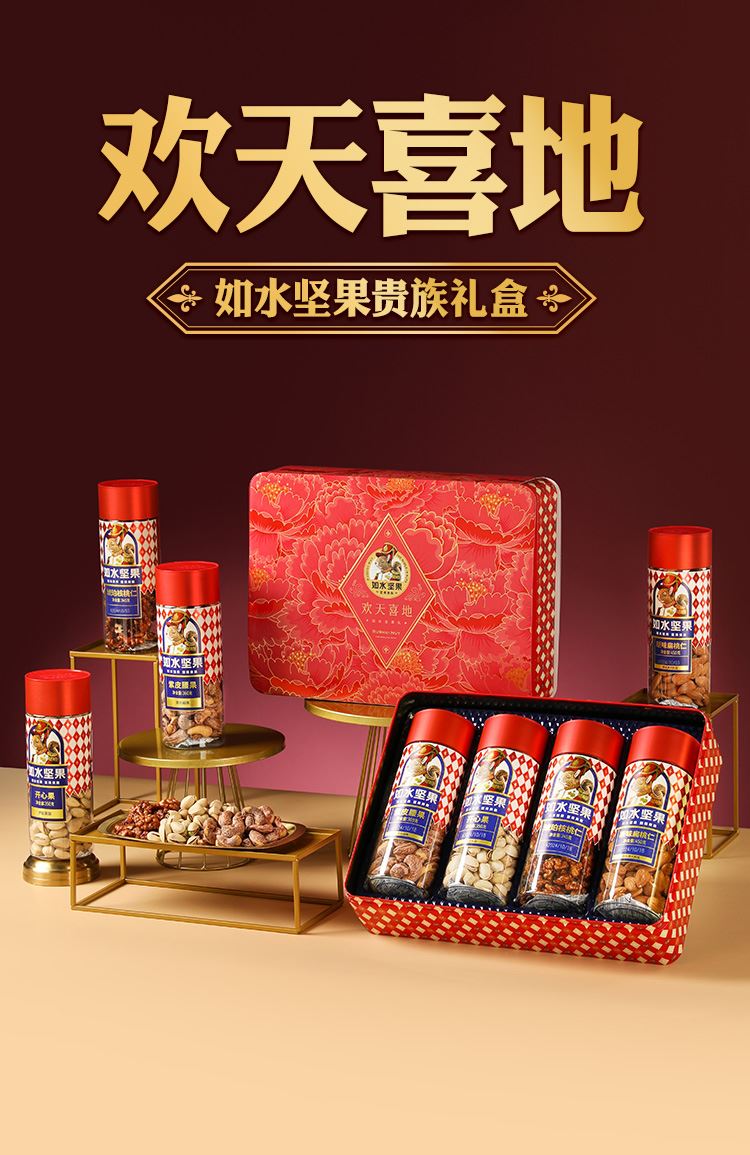 如水欢天喜地礼盒 净含量:1505g 如水开心果350g 如水紫皮腰果360g 如水原味扁桃仁450g 如水琥珀核桃仁345g