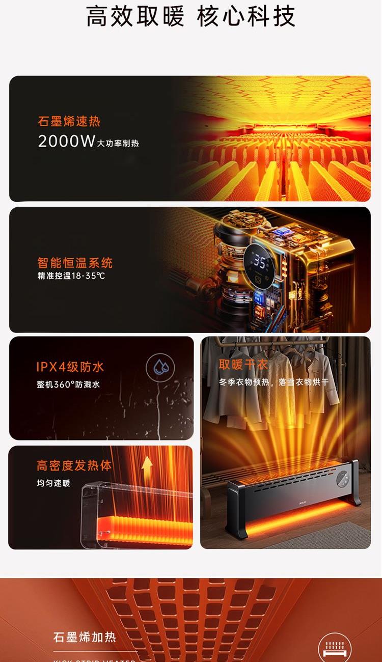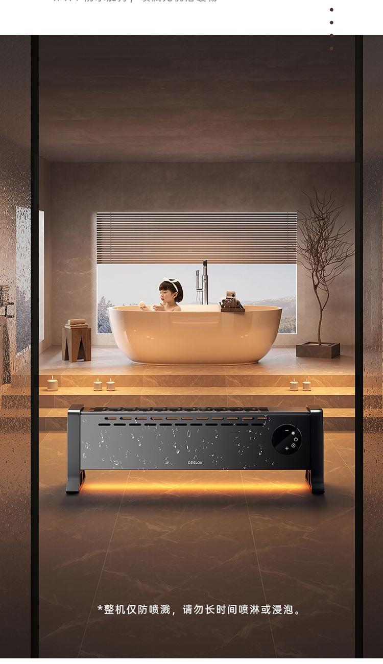 额定电压:220V~ 额定频率:50Hz 额定功率:2000W 控制方式:触摸控制+遥控器 加热方式:石墨烯加热 主要材质:ABS+SPCC冷轧板+喷高温粉 产品尺寸:865*170*265mm 1、轻音低噪,无光无风,打造地暖般的温暖冬季; 2、2000W 大功率,石墨烯加热,升温迅速; 3、IPX4级防水,暖享冬浴,安全可靠; 4、自下而上,地暖式快速供暖,平行铝翅片双管加热,制热稳定; 5、多重安全防护:过热保护,倾倒断电,防火阻燃材料,使用放心;