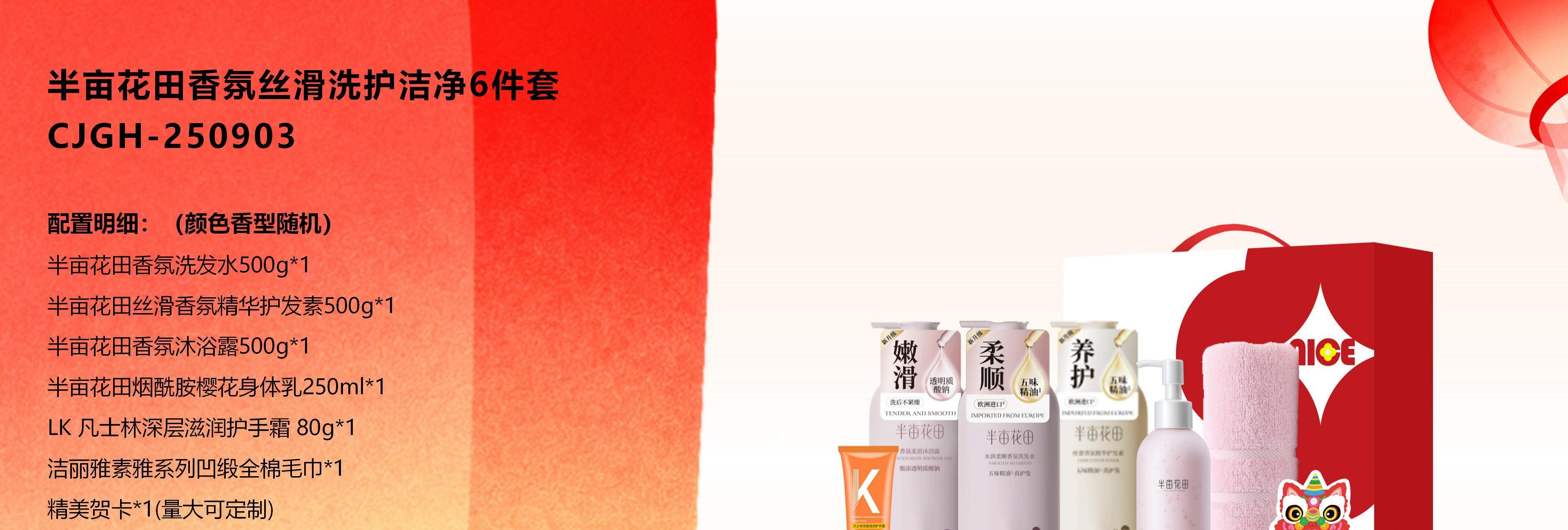 配置明细:(颜色香型随机) 半亩花田香氛洗发水500g*1 半亩花田丝滑香氛精华护发素500g*1 半亩花田香氛沐浴露500g*1 半亩花田烟酰胺樱花身体乳250ml*1 LK 凡士林深层滋润护手霜 80g*1 洁丽雅素雅系列凹缎全棉毛巾*1 精美贺卡*1(量大可定制) 缤果Nice小礼盒ZS177*1