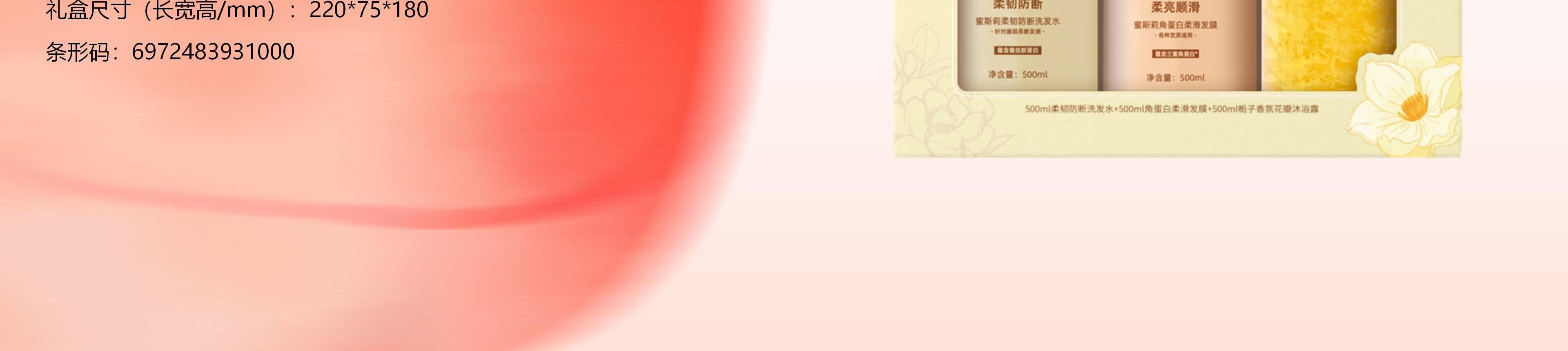 配置明细: MISS LILLY蜜斯莉柔韧防断洗发水500g*1 MISS LILLY蜜斯莉角蛋白柔滑发膜500g*1 MISS LILLY栀子香氛花瓣沐浴露500g*1 精美礼盒(含提手)*1 礼盒尺寸(长宽高/mm):220*75*180