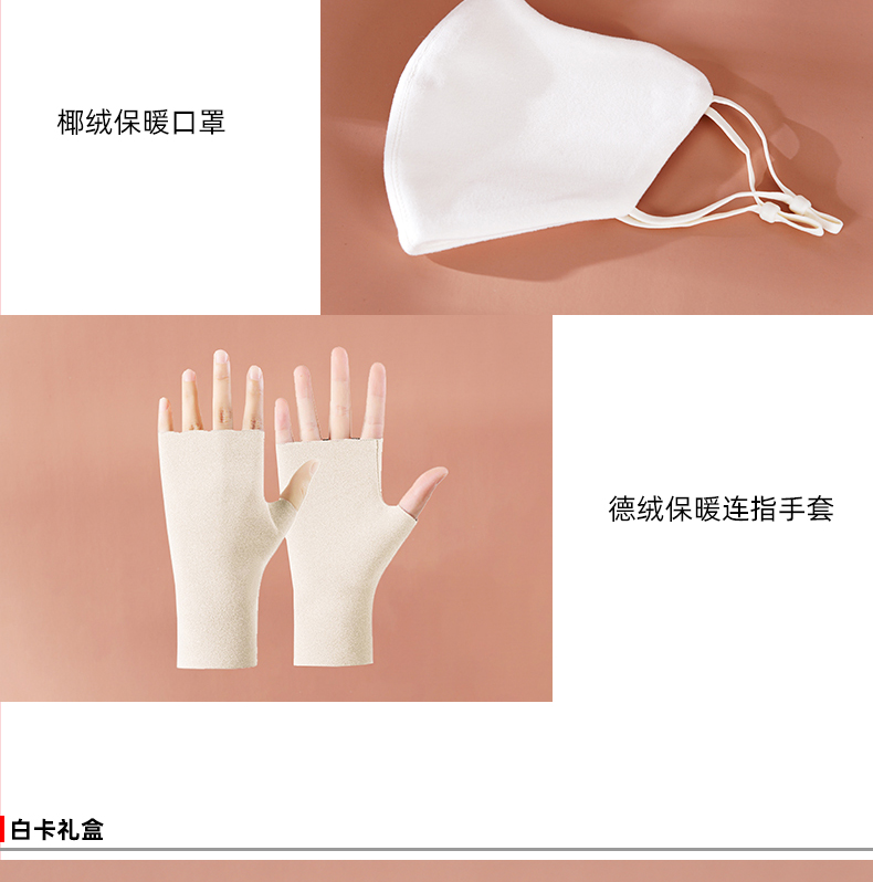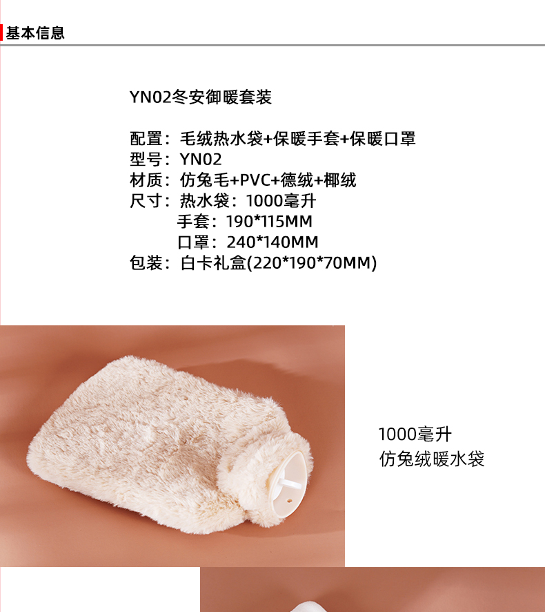 配置:毛绒热水袋+保暖手套+保暖口罩 型号:YN02 材质:仿兔毛+PVC+德绒+椰绒 尺寸:热水袋:1000毫升 手套:190*115mm 口罩:240*140mm 包装:白卡礼盒(220*190*70mm)