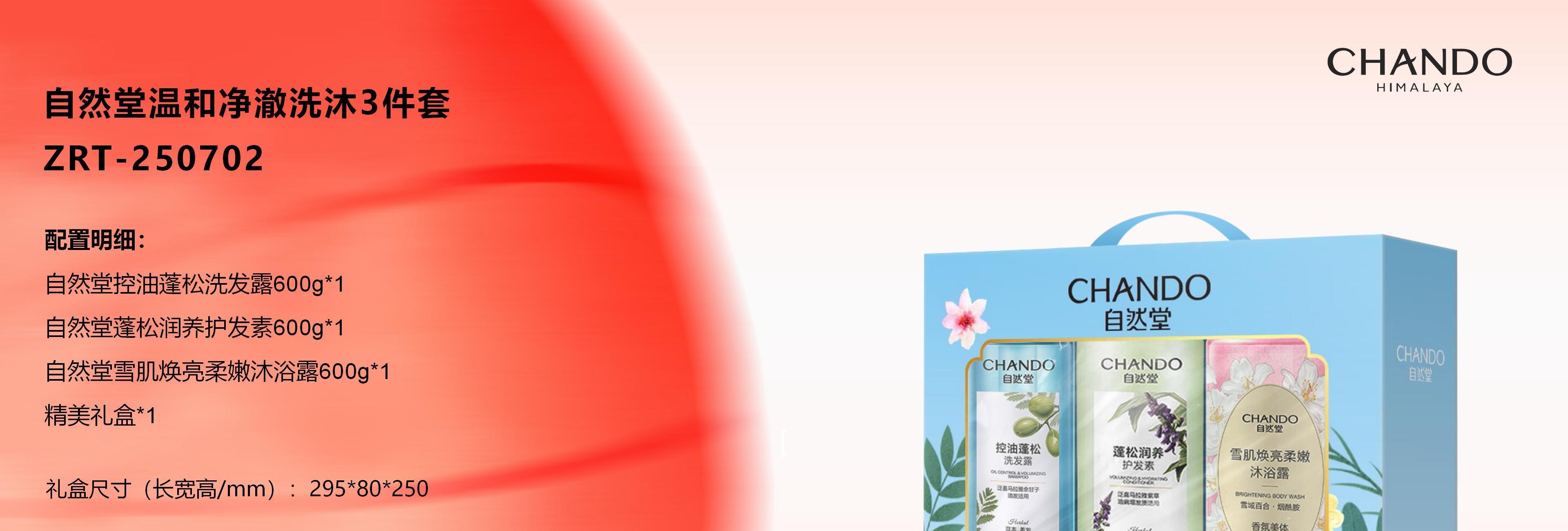 配置明细: 自然堂控油蓬松洗发露600g*1 自然堂蓬松润养护发素600g*1 自然堂雪肌焕亮柔嫩沐浴露600g*1 精美礼盒*1 礼盒尺寸(长宽高/mm):295*80*250