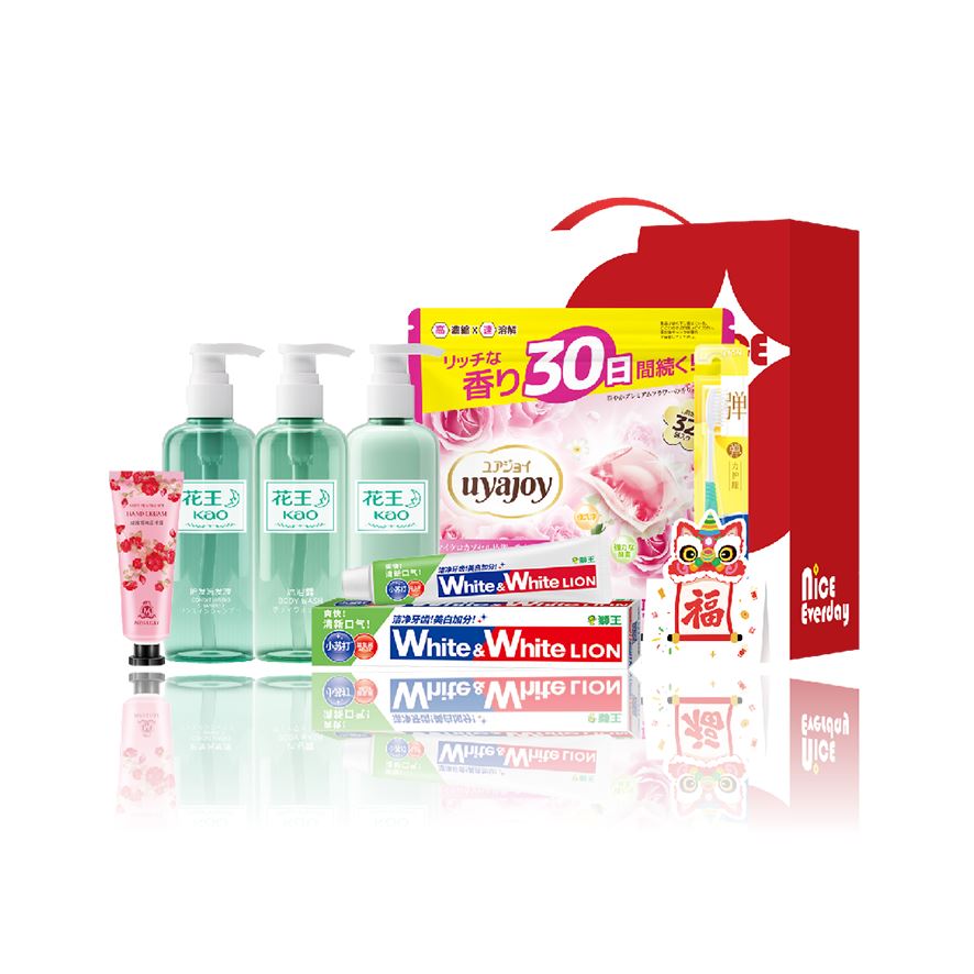 配置明细:(颜色香型随机) 花王(KAO)护发洗发液300g*1 花王(KAO)沐浴露300g*1 花王(KAO)润肤乳300g*1 MissLilly蜜斯莉玫瑰香氛润手霜50g*1 UYAJOY亚乐花香洗衣凝珠8g*32颗*1 狮王(Lion)小苏打牙膏100g*1 狮王(Lion)细齿洁弹力护龈牙刷1支装*1 精美贺卡*1(量大可定制) 缤果Nice小号礼盒ZS177*1