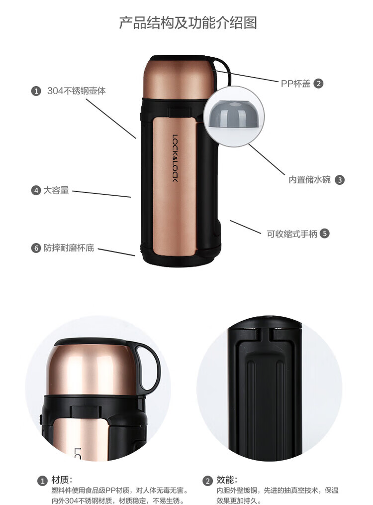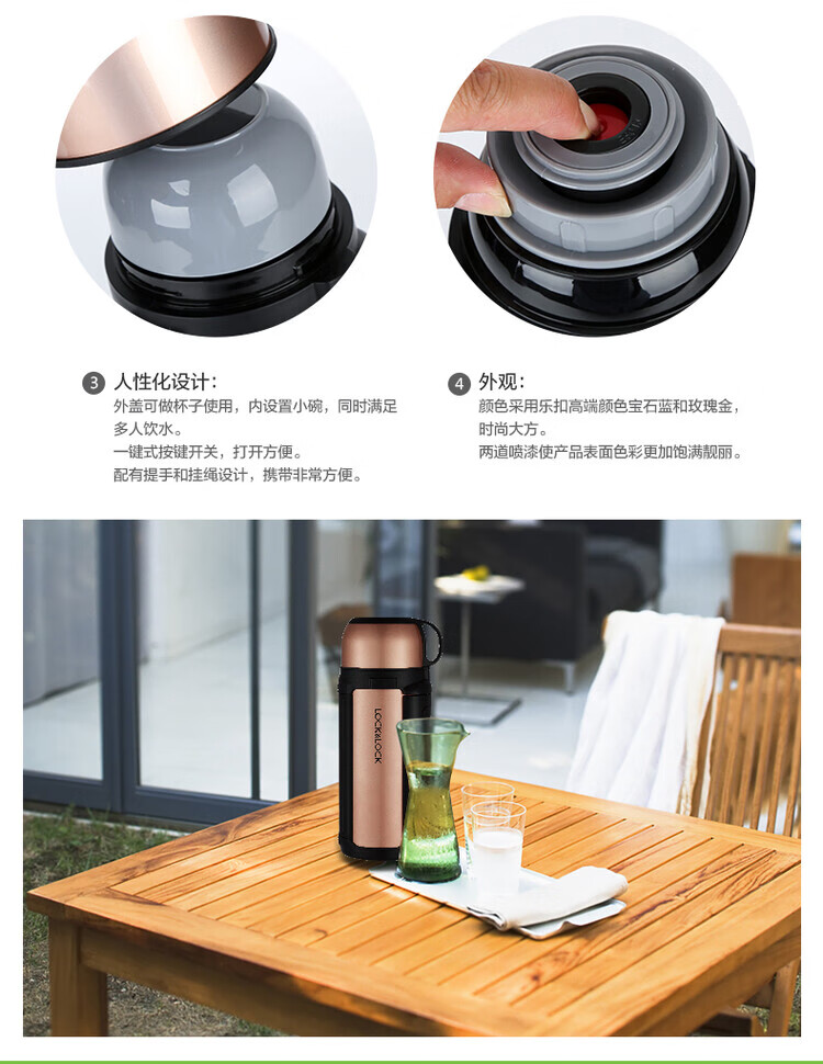 产品特点: 内外304不锈钢材质,高效持久保温 壶身可收缩手柄,舒适防滑 一键式按键,使用方便 实用性配置,多种规格,满足您的日常需求