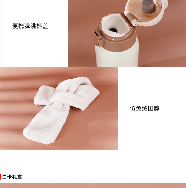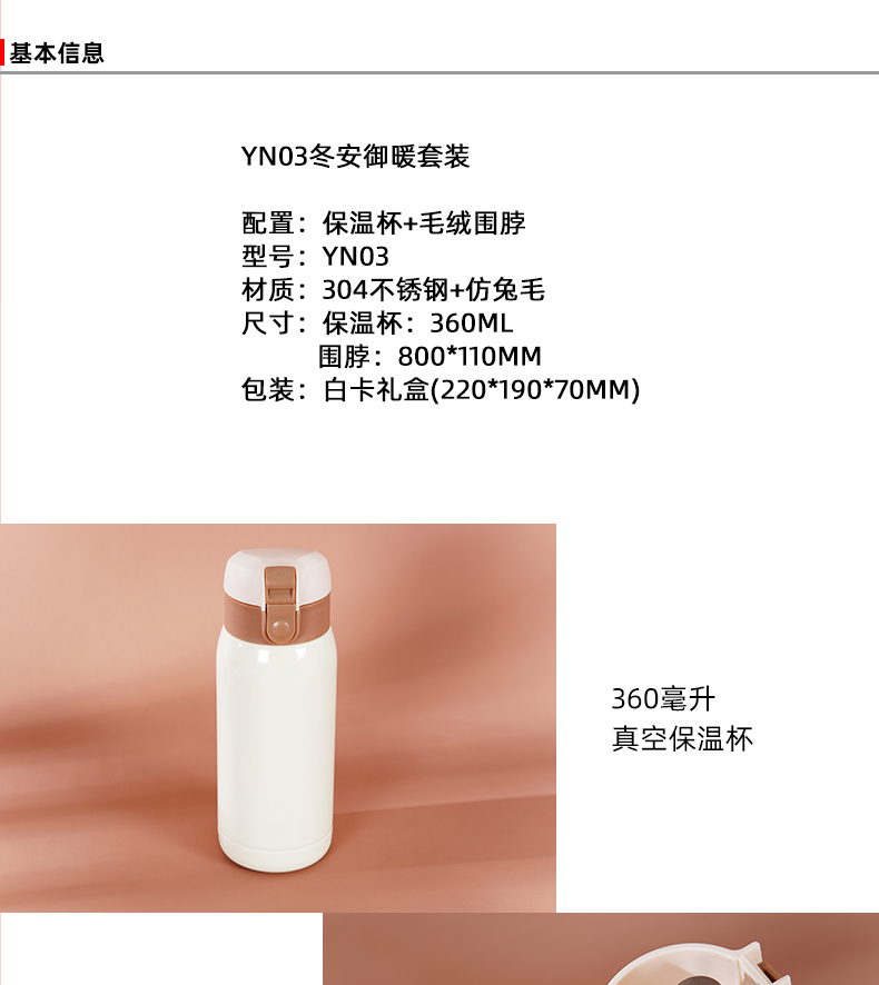 配置:保温杯+毛绒围脖 型号:YN03 材质:304不锈钢+仿兔毛 尺寸:保温杯:360ml 围脖:800*110mm 包装:白卡礼盒(220*190*70mm)