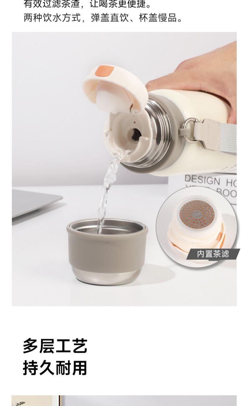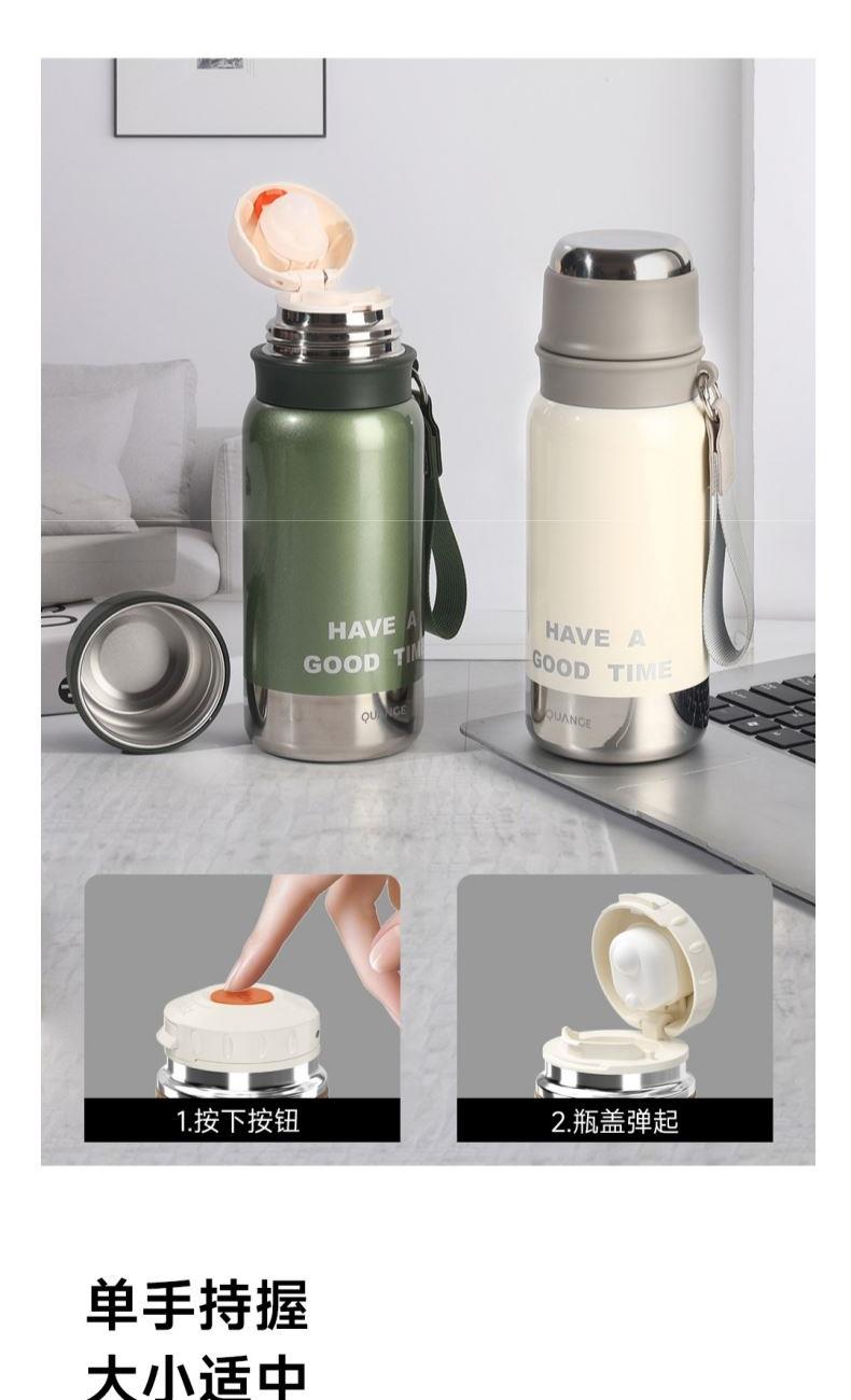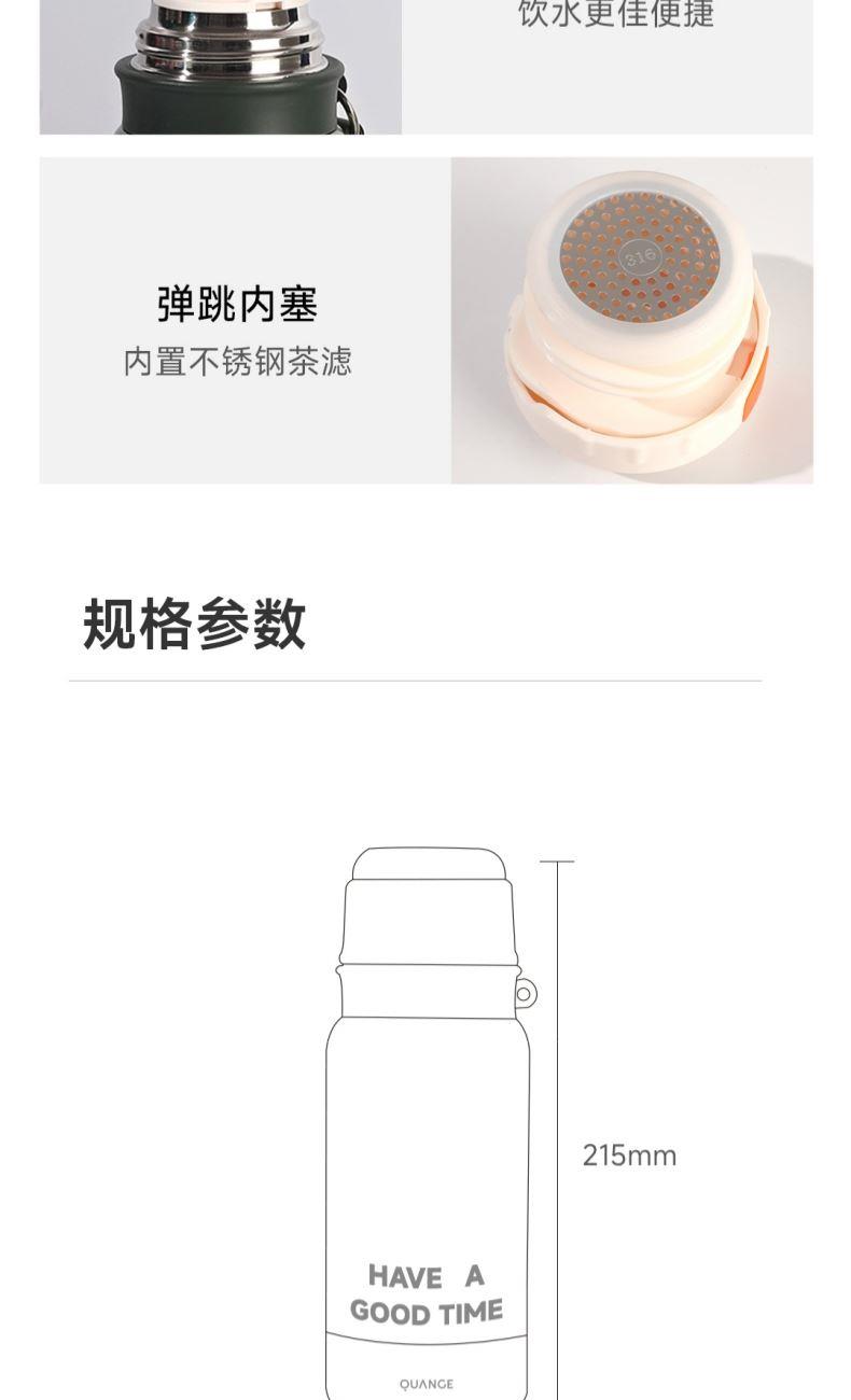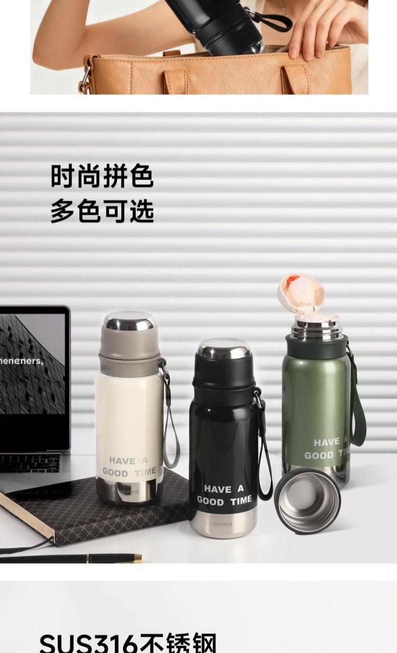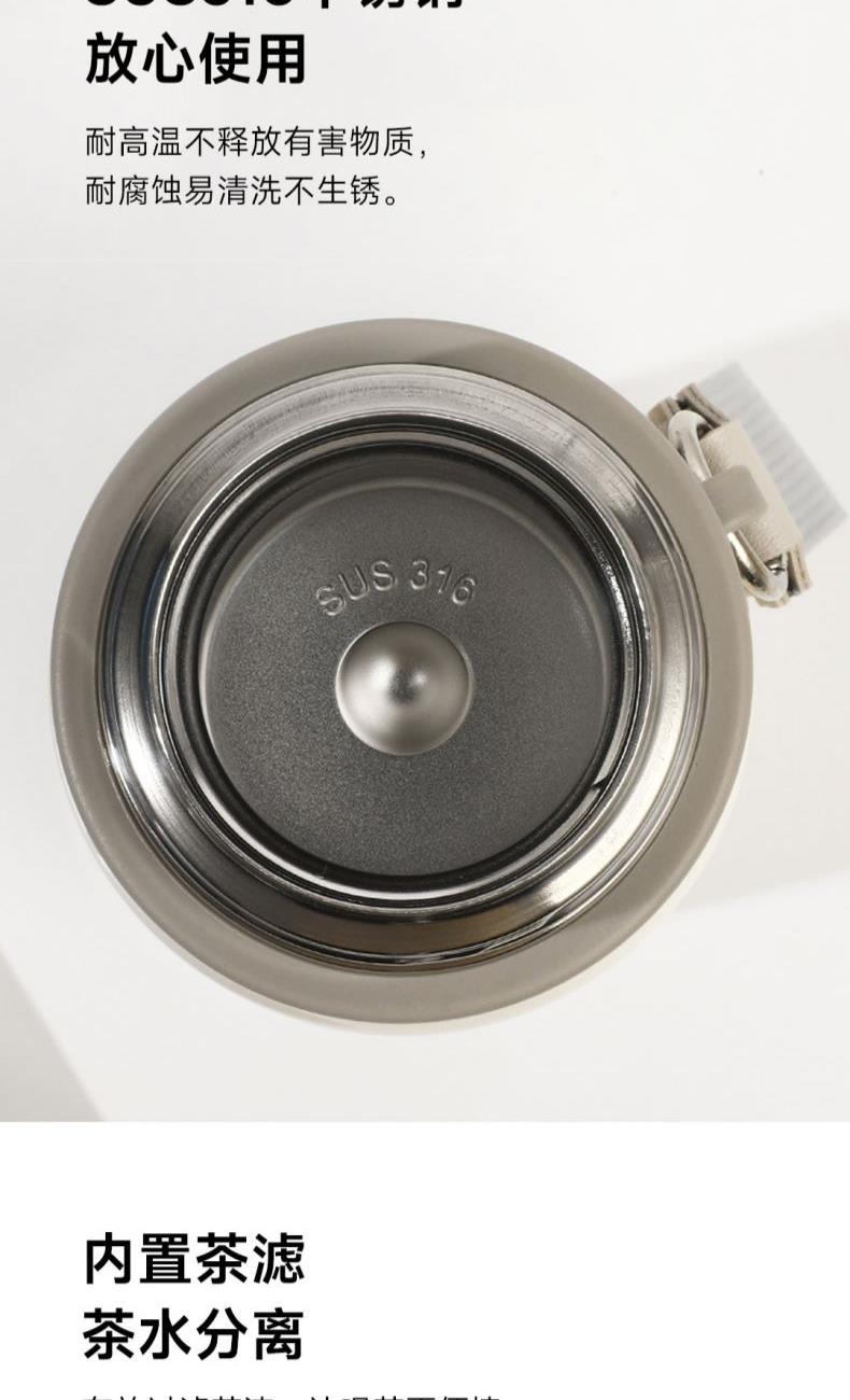 颜色:白色、绿色、黑色 容量:580mL 材质:内胆底:SUS316,外杯盖/茶滤:SUS304,内杯盖:PP,密封件:硅橡胶 产品尺寸:φ7.5*21.5cm 彩盒尺寸:8.5*23.5cm 毛重:0.39kg 1.580ml大容量 2.内置茶隔,茶水分离,可焖可泡; 3.一键弹盖,外杯盖小碗,一盖两用,便携提绳出行方便。