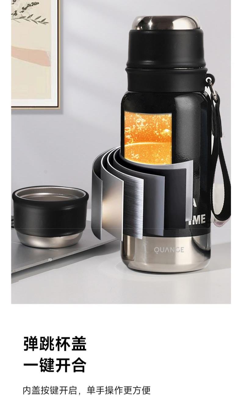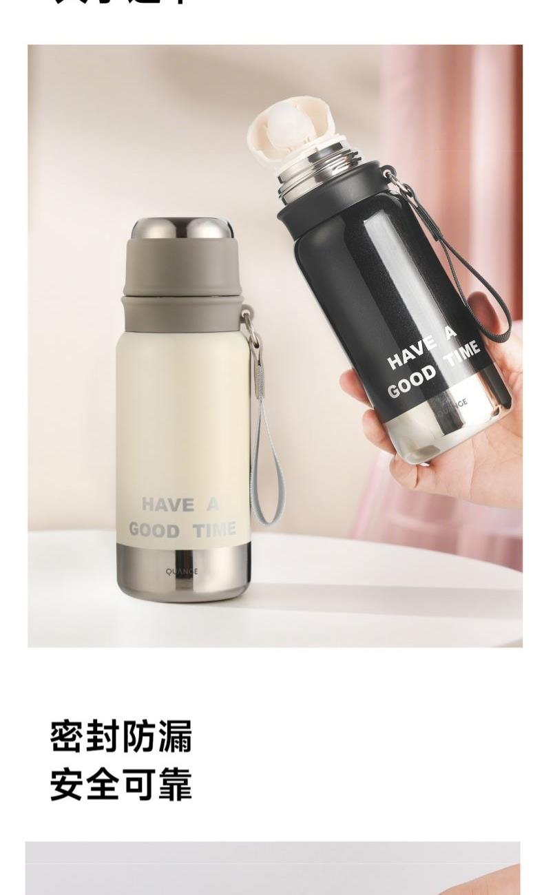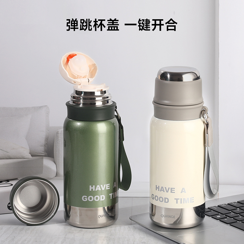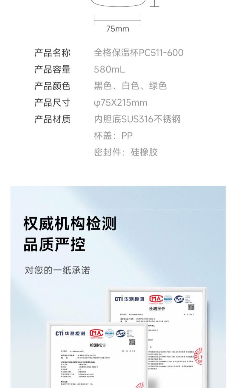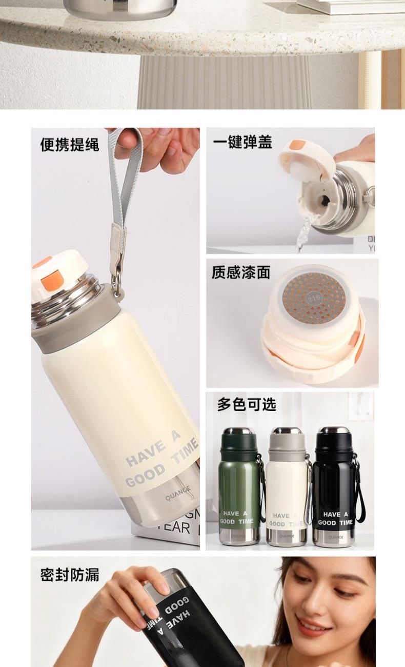 颜色:白色、绿色、黑色 容量:580mL 材质:内胆底:SUS316,外杯盖/茶滤:SUS304,内杯盖:PP,密封件:硅橡胶 产品尺寸:φ7.5*21.5cm 彩盒尺寸:8.5*23.5cm 毛重:0.39kg 1.580ml大容量 2.内置茶隔,茶水分离,可焖可泡; 3.一键弹盖,外杯盖小碗,一盖两用,便携提绳出行方便。