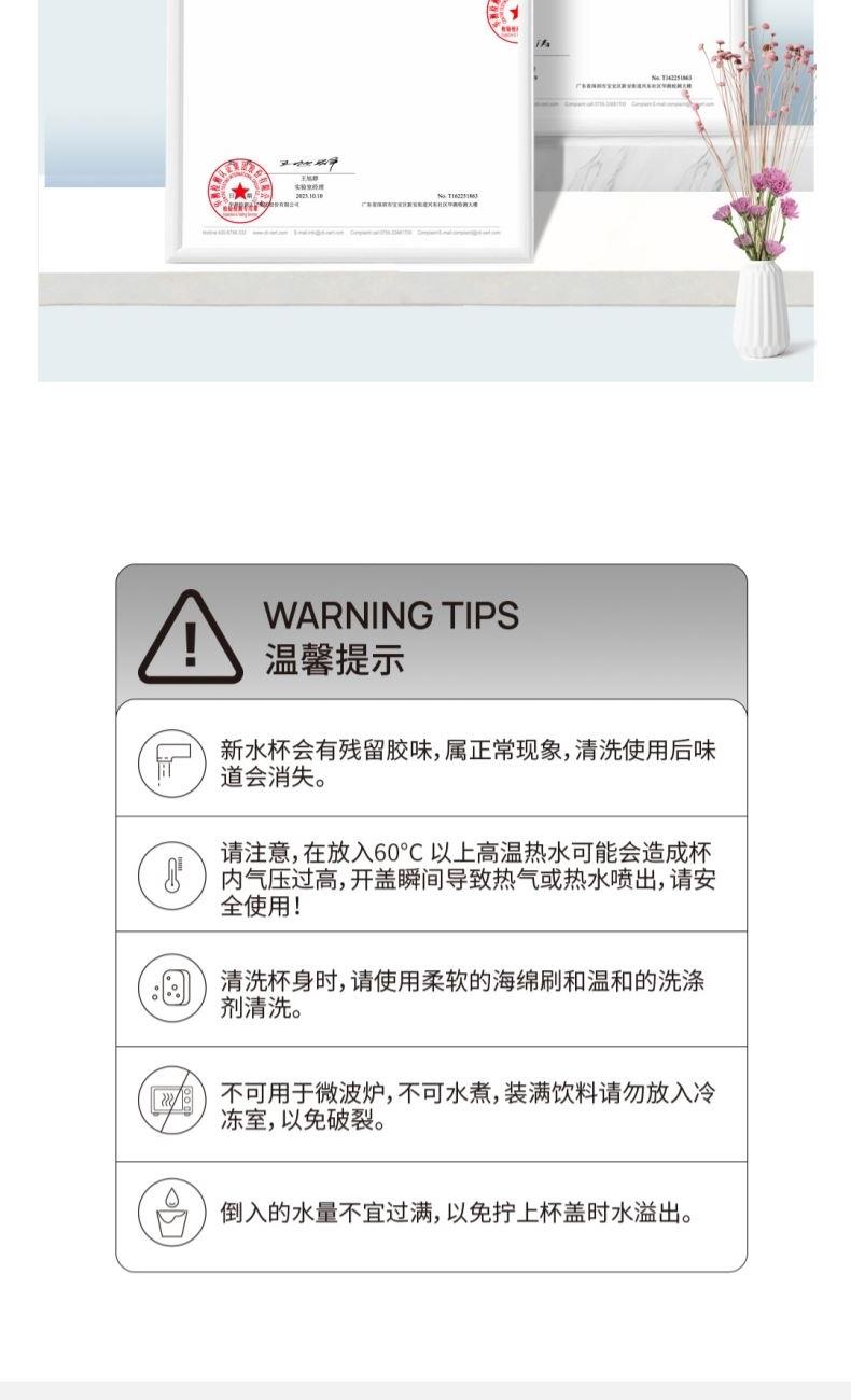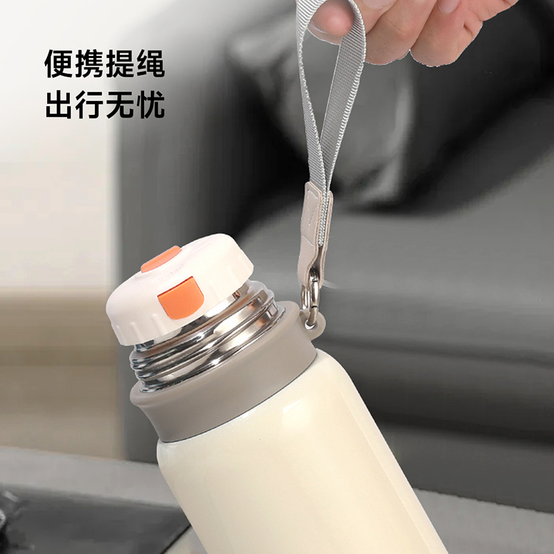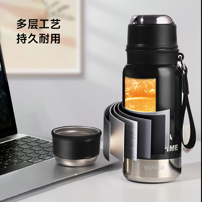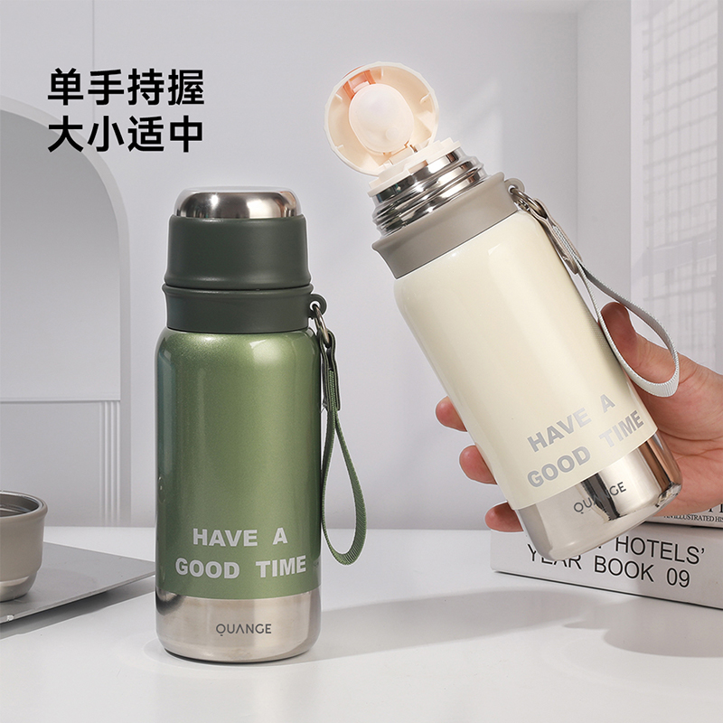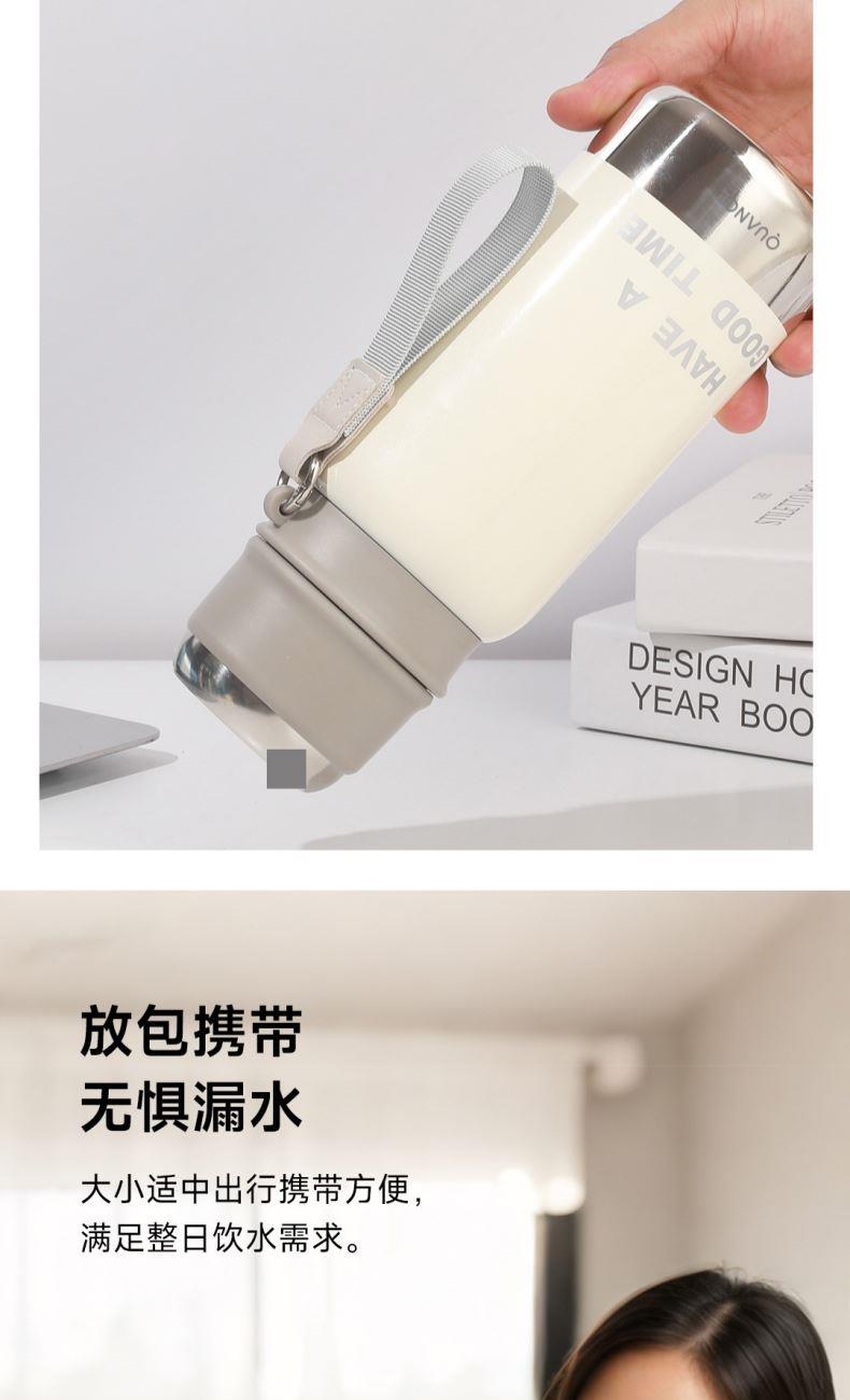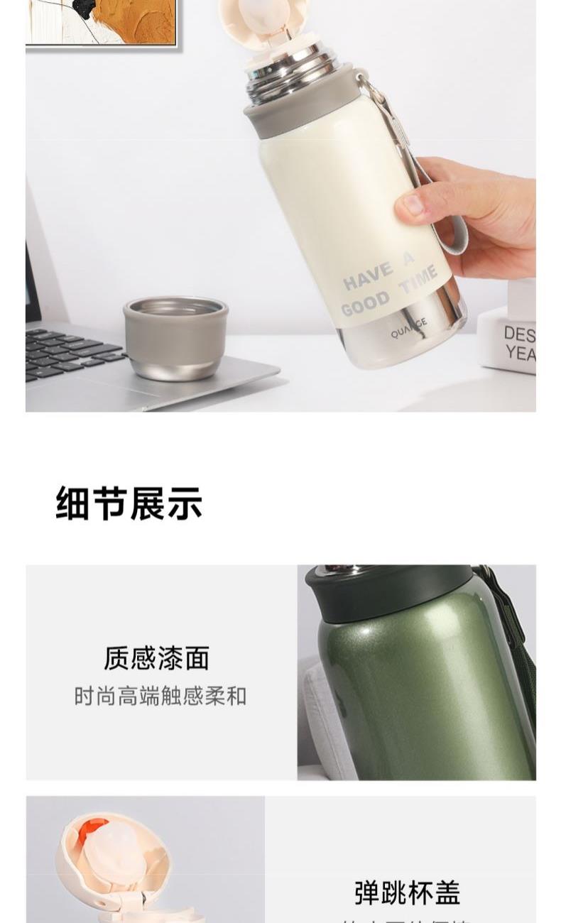 颜色:白色、绿色、黑色 容量:580mL 材质:内胆底:SUS316,外杯盖/茶滤:SUS304,内杯盖:PP,密封件:硅橡胶 产品尺寸:φ7.5*21.5cm 彩盒尺寸:8.5*23.5cm 毛重:0.39kg 1.580ml大容量 2.内置茶隔,茶水分离,可焖可泡; 3.一键弹盖,外杯盖小碗,一盖两用,便携提绳出行方便。