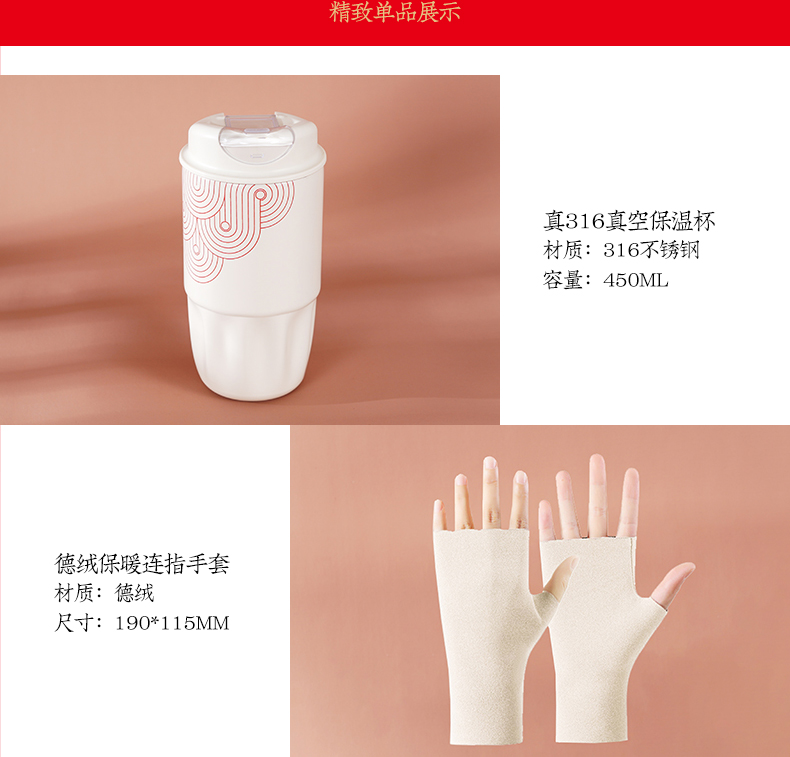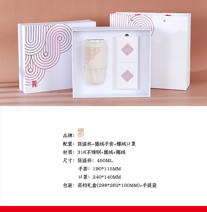配置:保温杯+德绒手套+椰绒口罩 材质:316不锈钢+德绒+椰绒 尺寸:保温杯:450ml 手套:190*115mm 口罩:240*140mm 包装:礼盒(298*262*100mm)+手提袋
