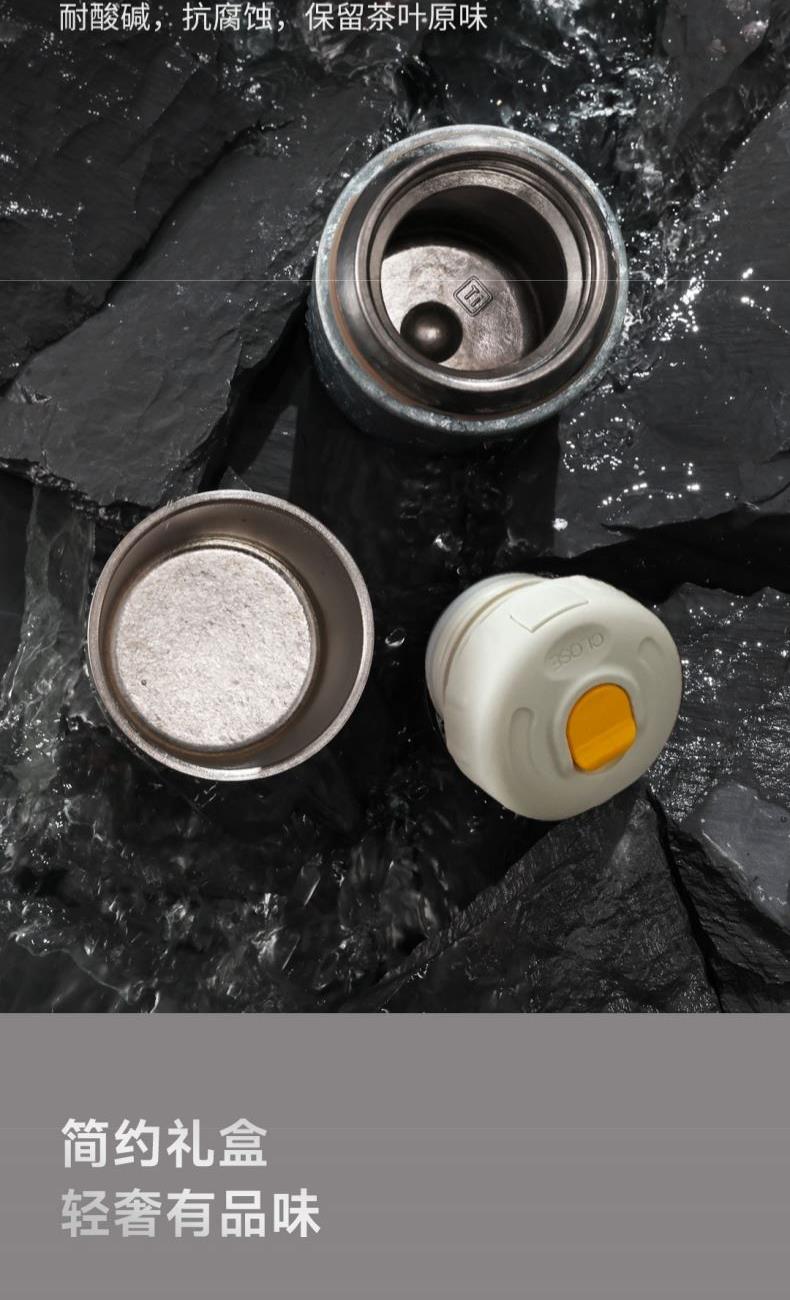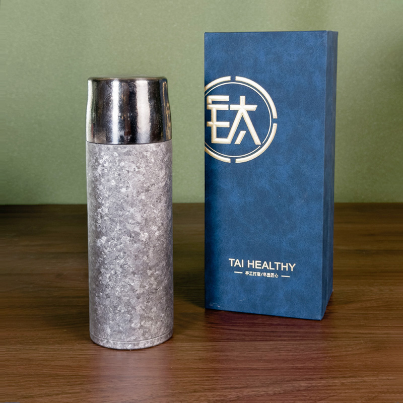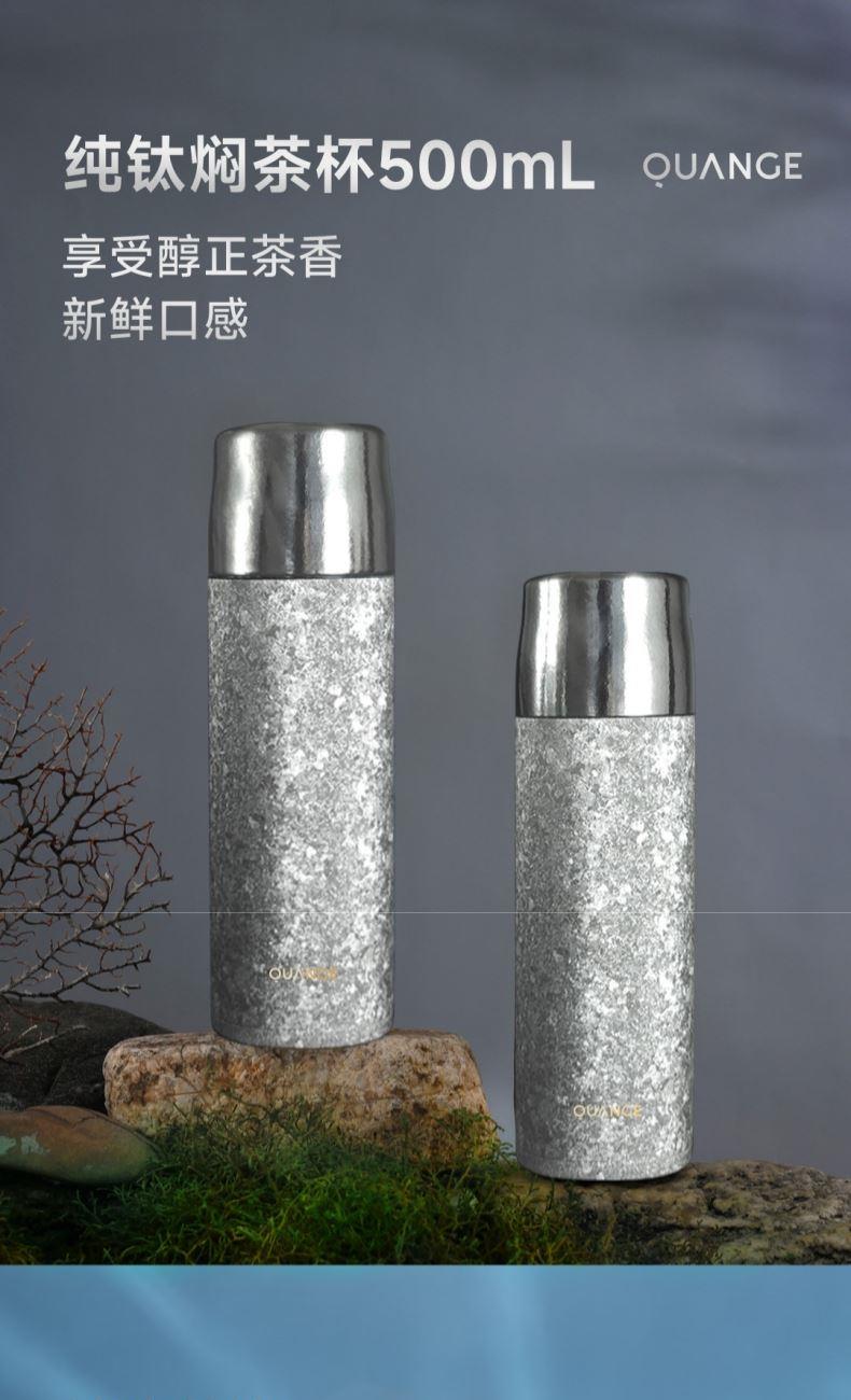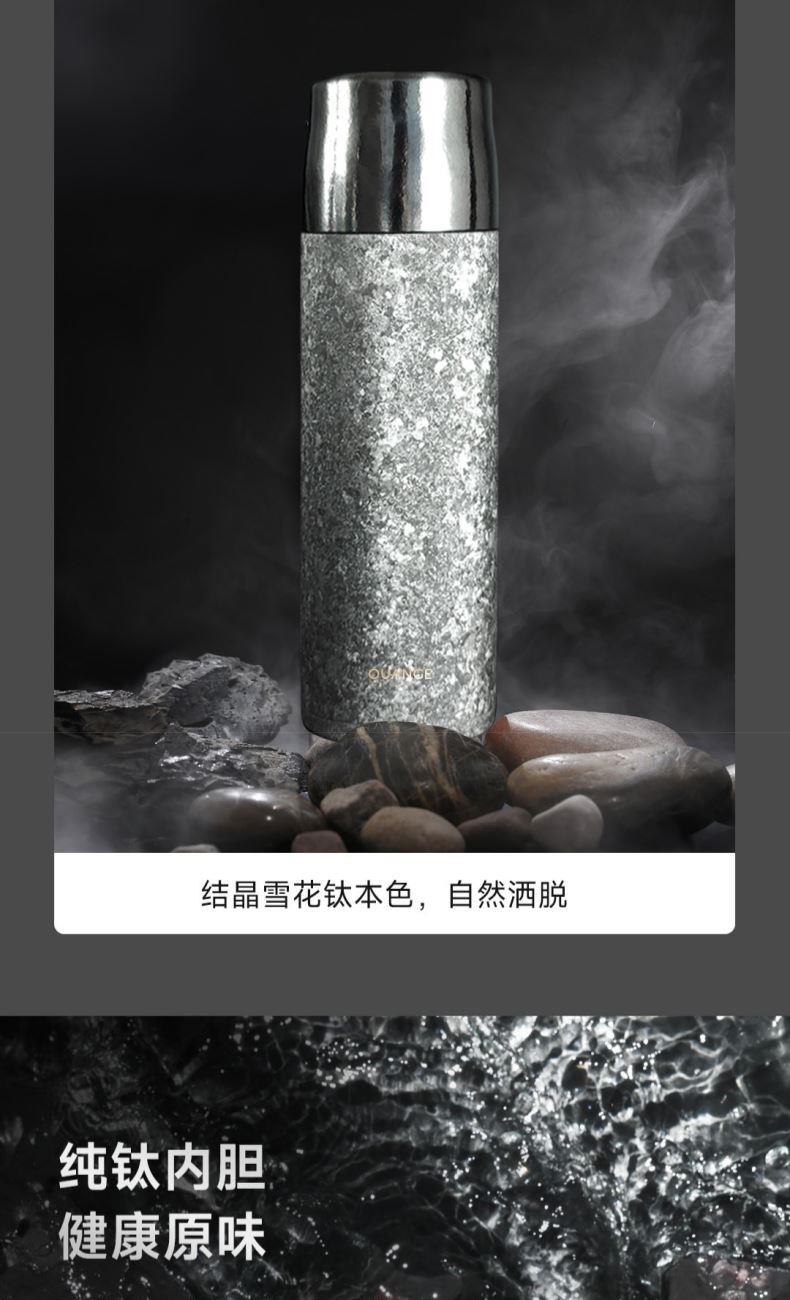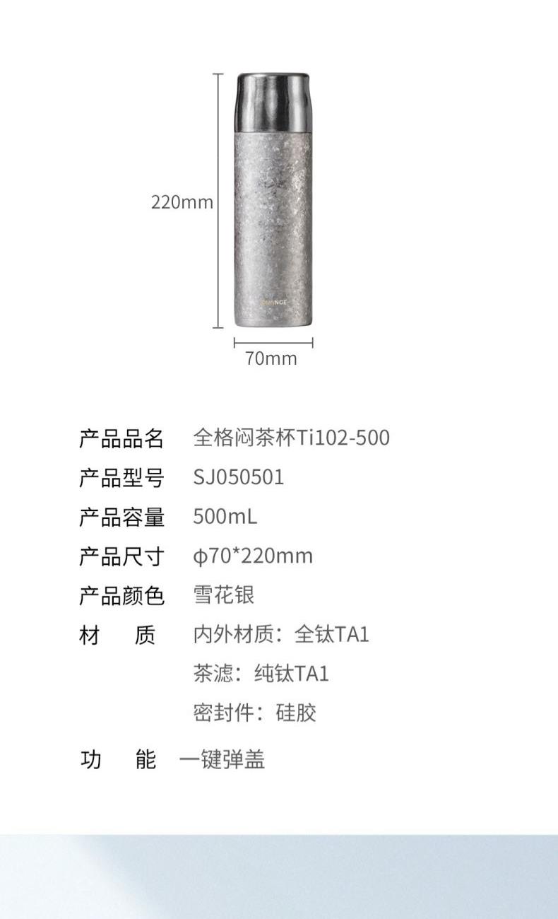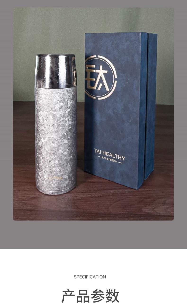 颜色:晶花钛 容量:500mL 材质:内胆、外壳、杯盖、茶漏:钛TA1 塑料件:PP;密封件:硅橡胶 配置:纯钛茶滤 工艺:本色结晶 产品尺寸:φ70*220mm 包装:礼盒 1、500ml,纯钛材质,安心看的到, 2、隐藏式茶滤,一键弹盖,杯盖两用。 3、轻奢礼盒装