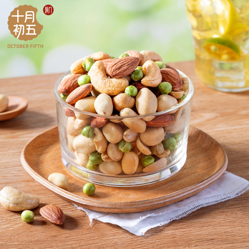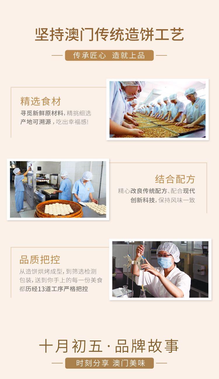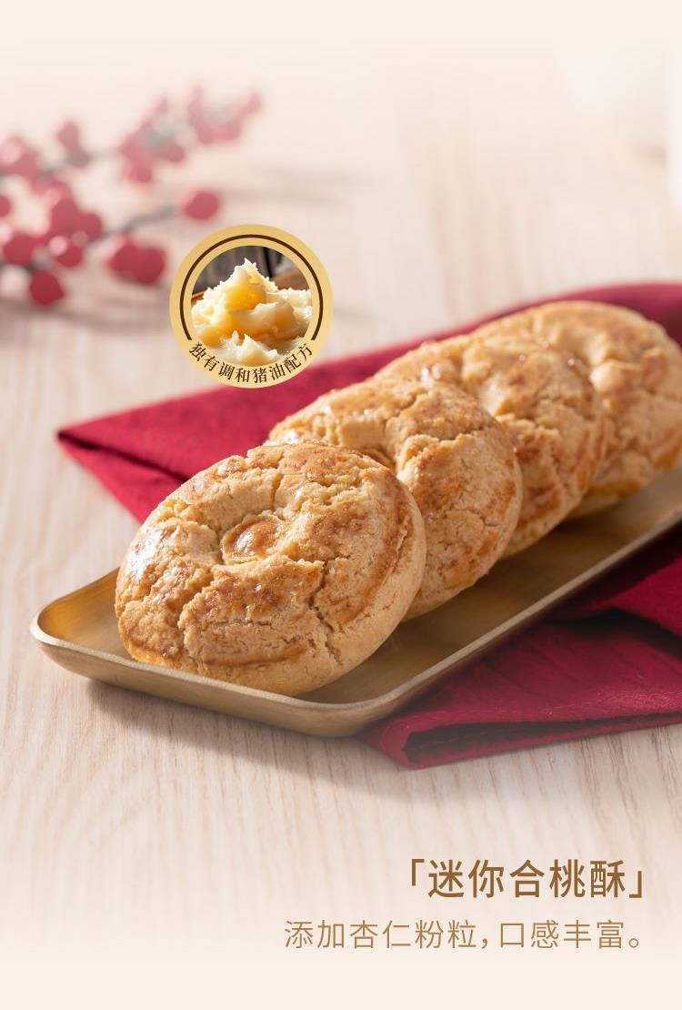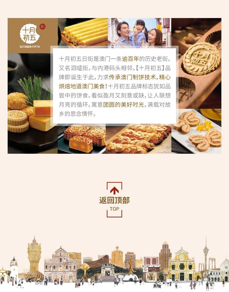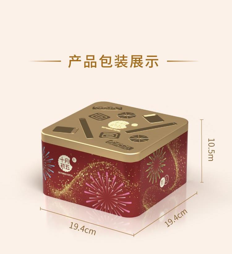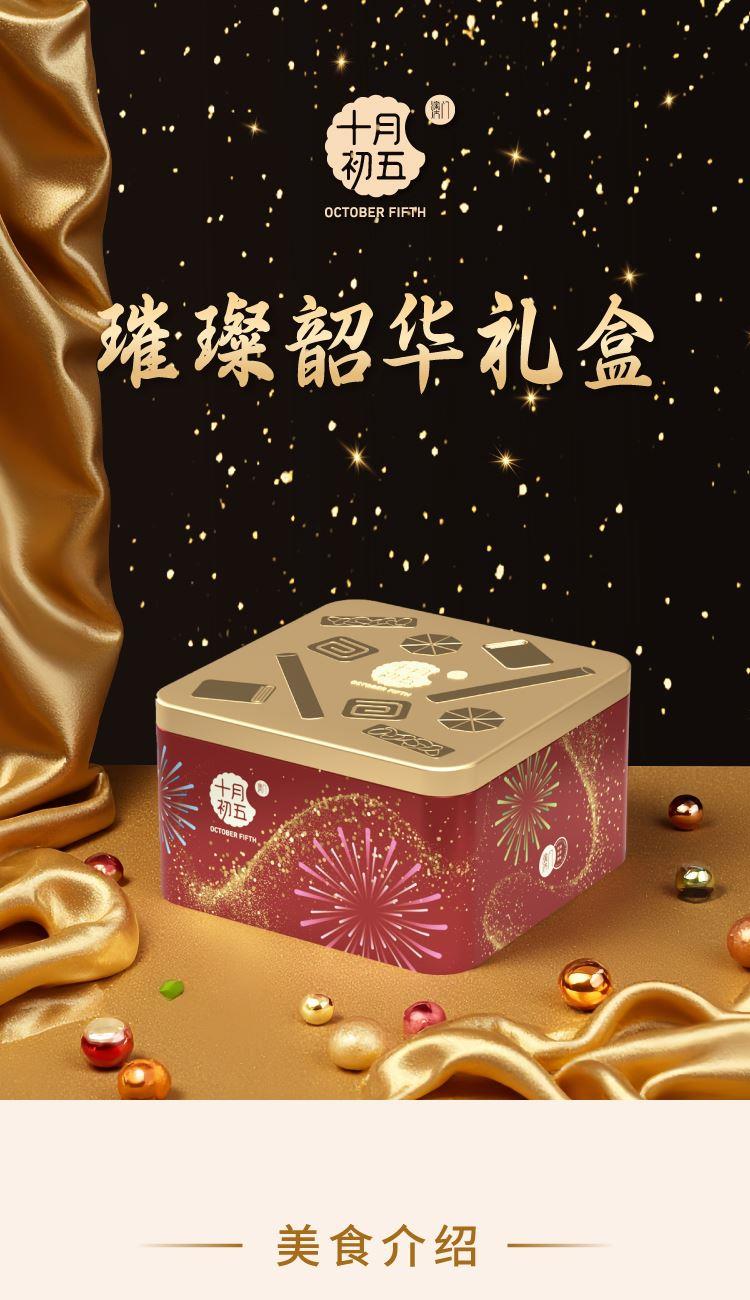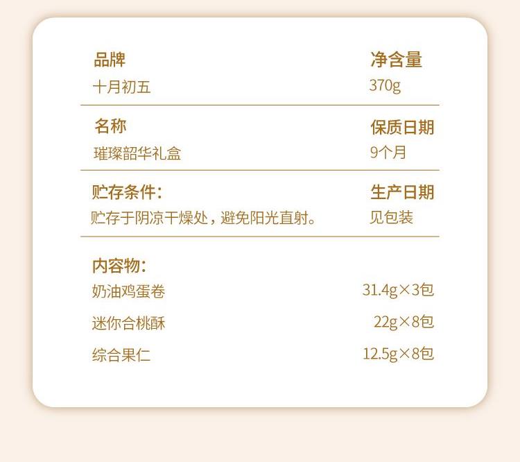 十月初五璀璨韶华礼盒 净含量:370g 31.4g奶油鸡蛋卷X3 22g迷你合桃酥X8 12.5g综合果仁X8