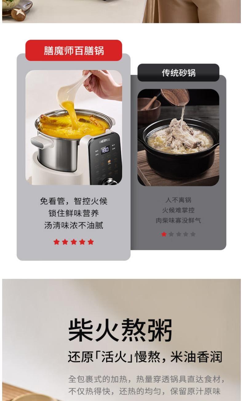 1.不巴不溢:烹饪过程无需看管,同时充分的沸腾萃取食材营养。