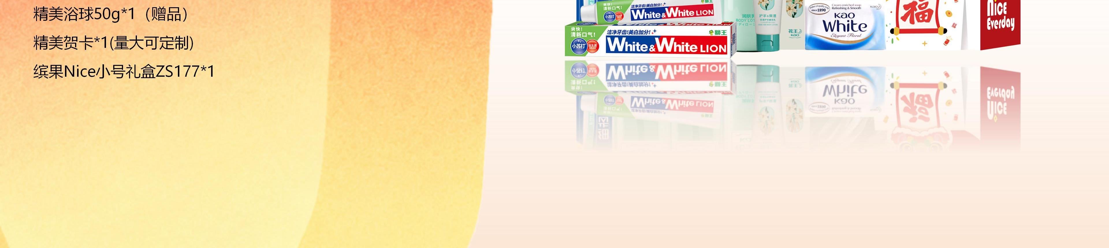配置明细:(颜色香型随机) 花王(KAO)护发洗发液500g*1 花王(KAO)沐浴露500g*1 花王(KAO)润肤乳300g*1 花王(KAO)护手保湿霜50g*1 花王(KAO)white护肤香皂牛奶130g*1 狮王(Lion)小苏打美白清新牙膏100g*1 狮王(Lion)细齿洁弹力护龈牙刷1支装*1 精美浴球50g*1(赠品) 精美贺卡*1(量大可定制) 缤果Nice小号礼盒ZS177*1