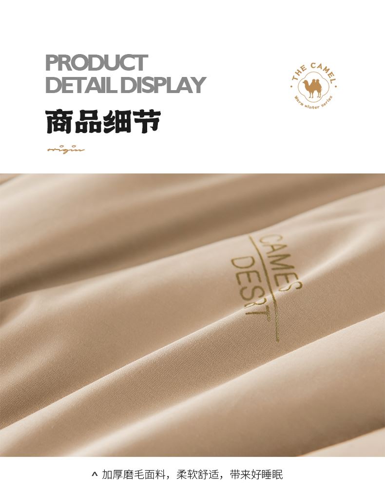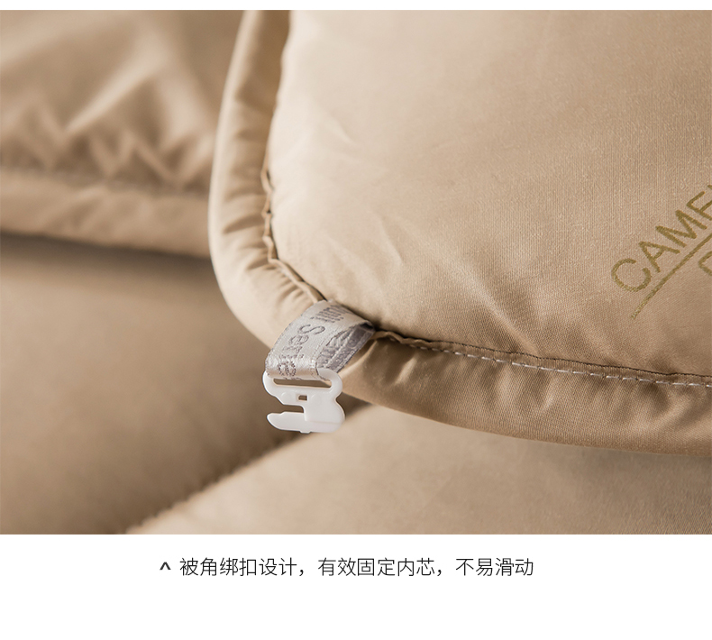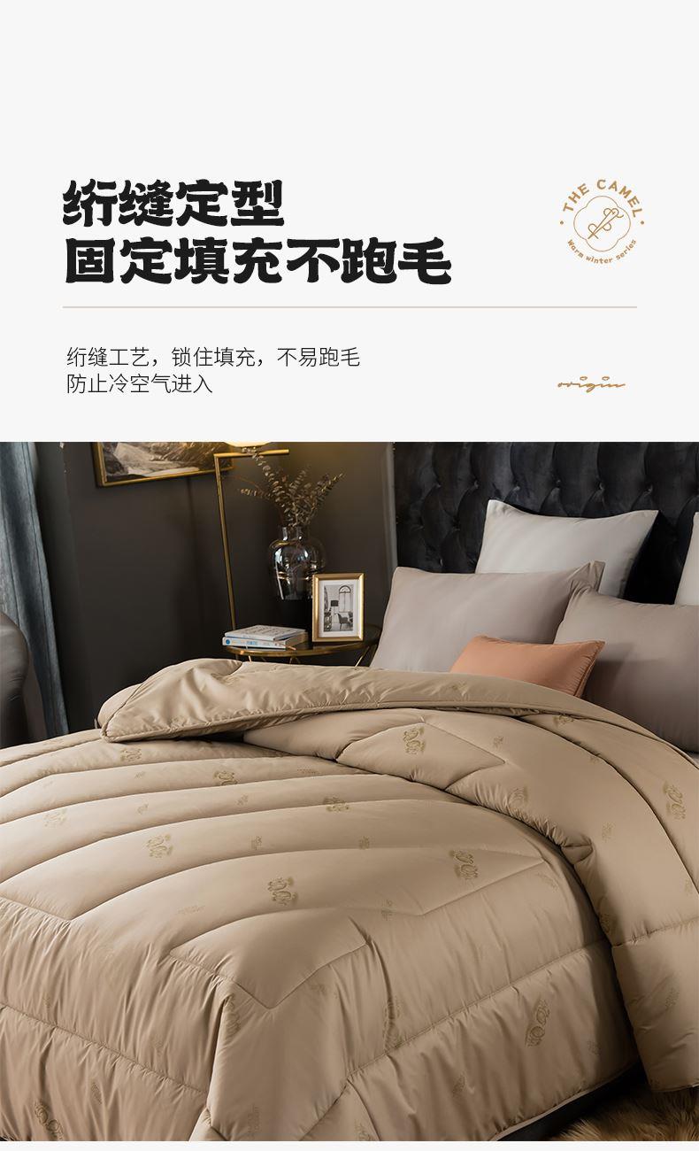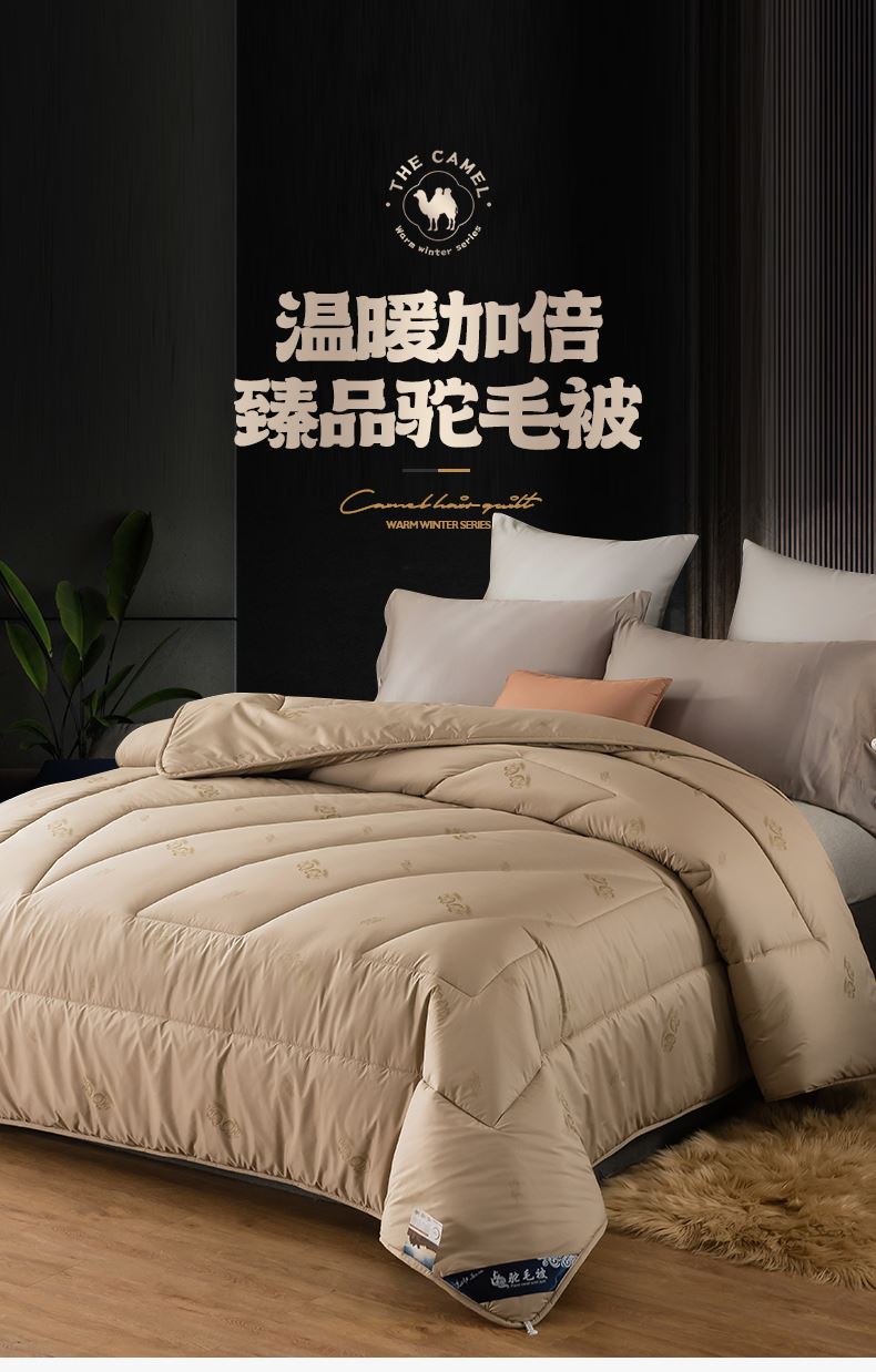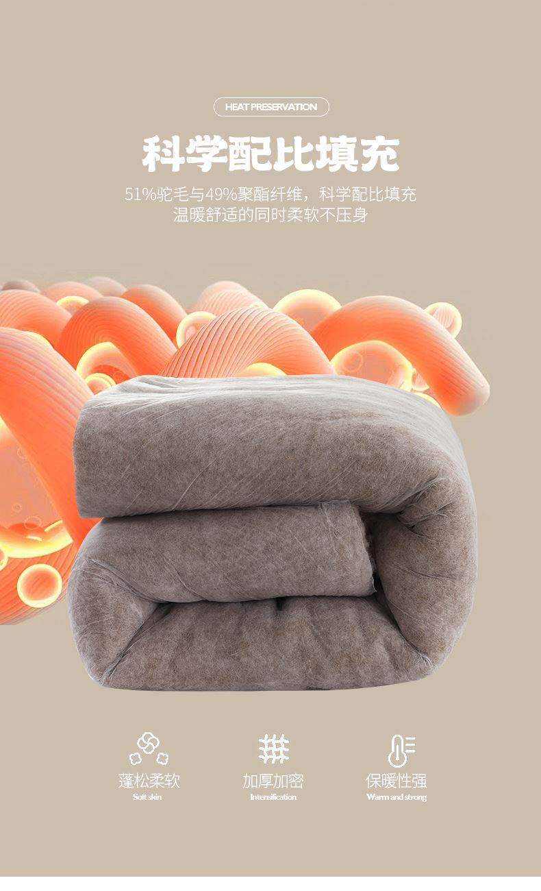 面料:防羽布(聚酯纤维) 规格:200×230cm 填充:51%驼毛+49%聚酯纤维 总重:3000g 包装:精美软包 臻品驼毛被,加厚保暖·柔软蓬松·透气恒温黄金比例,蓬松柔软的混纺技术,创新超细纤维与优质驼毛混纺,51%优质驼毛配比49%聚酯纤维让驼毛被贴身又保暖。