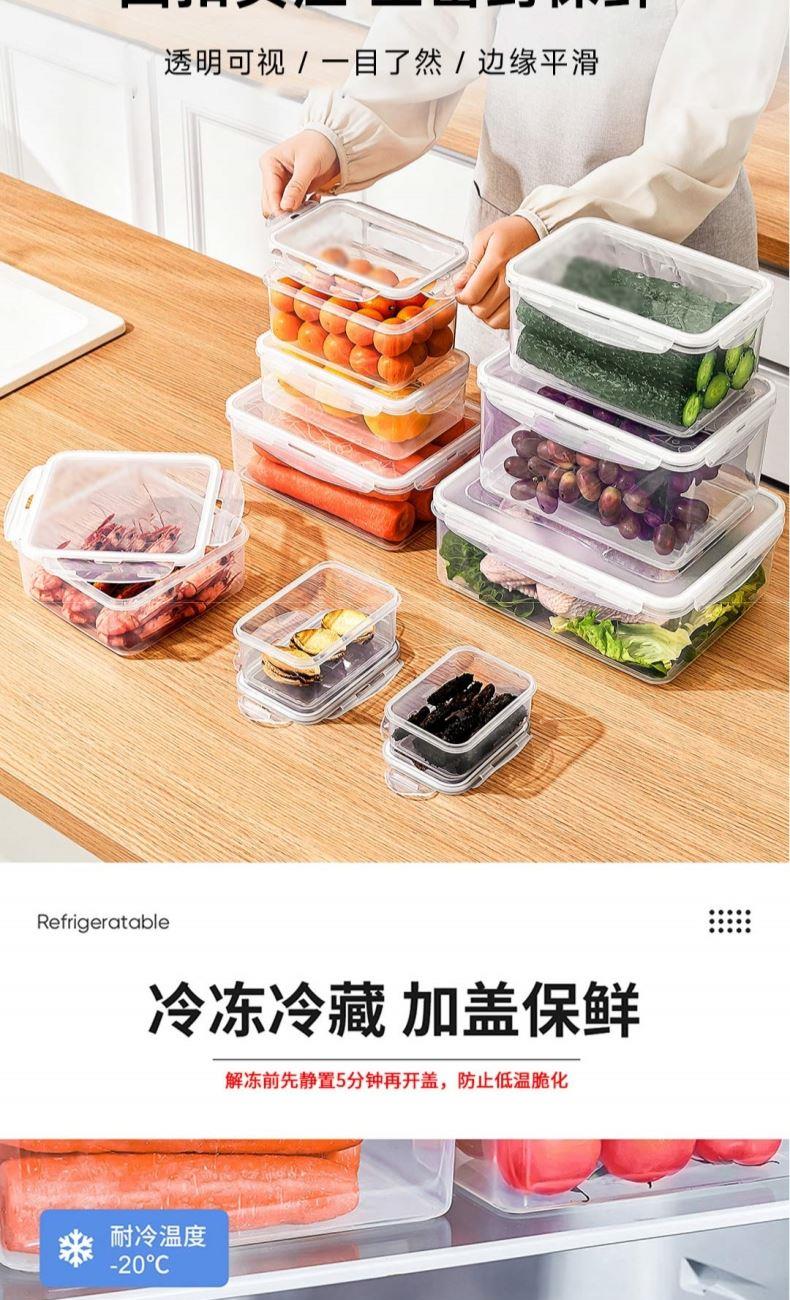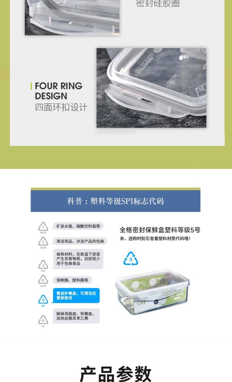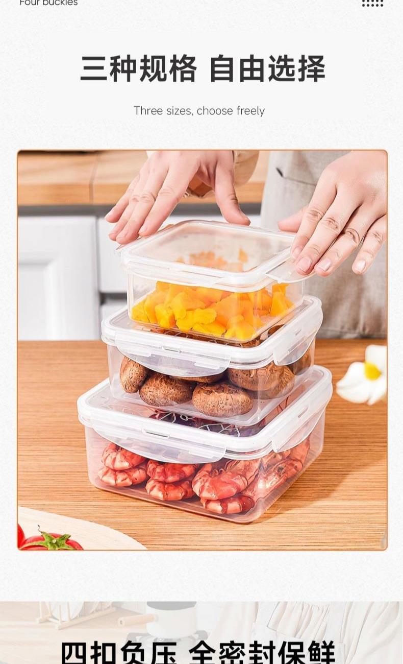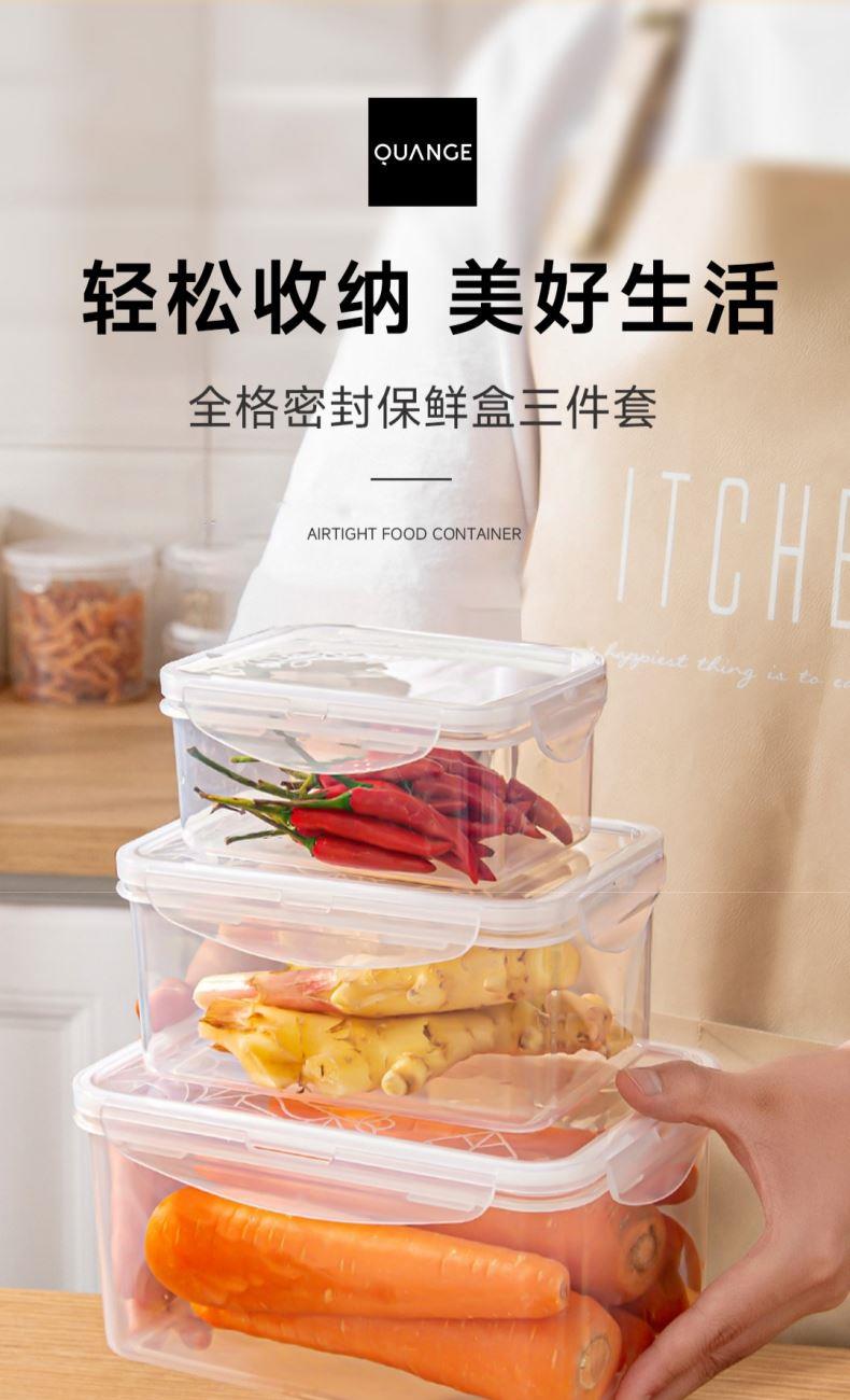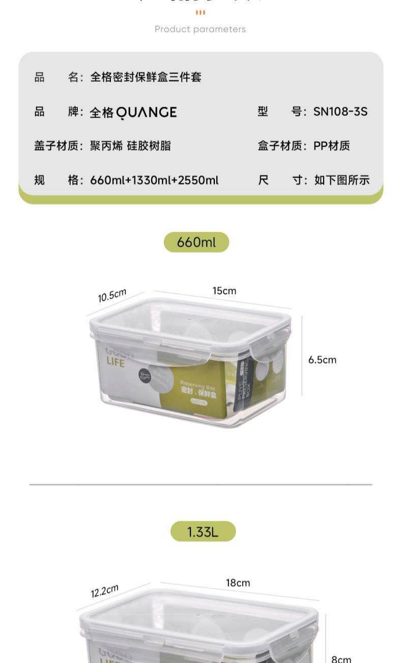 颜色:透明色 容量:660ml+1330ml+2550ml 材质:盖子材质:聚丙烯 硅胶树脂,盒子材质:PP材质 产品尺寸:0.66L:15*10.5*6.5cm,1.33L:18*12.2*8cm,2.55L:22*15.5*10.8cm 包装尺寸:22.5*16*11.5cm 毛重:0.607kg 1、660ml+1330ml+2550ml三个规格,分类收纳 2、四面锁扣,全密封不渗漏; 3、优选pp材质; 4、适用冰箱、微波炉加热; 5、可叠加堆放