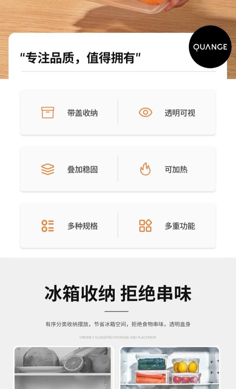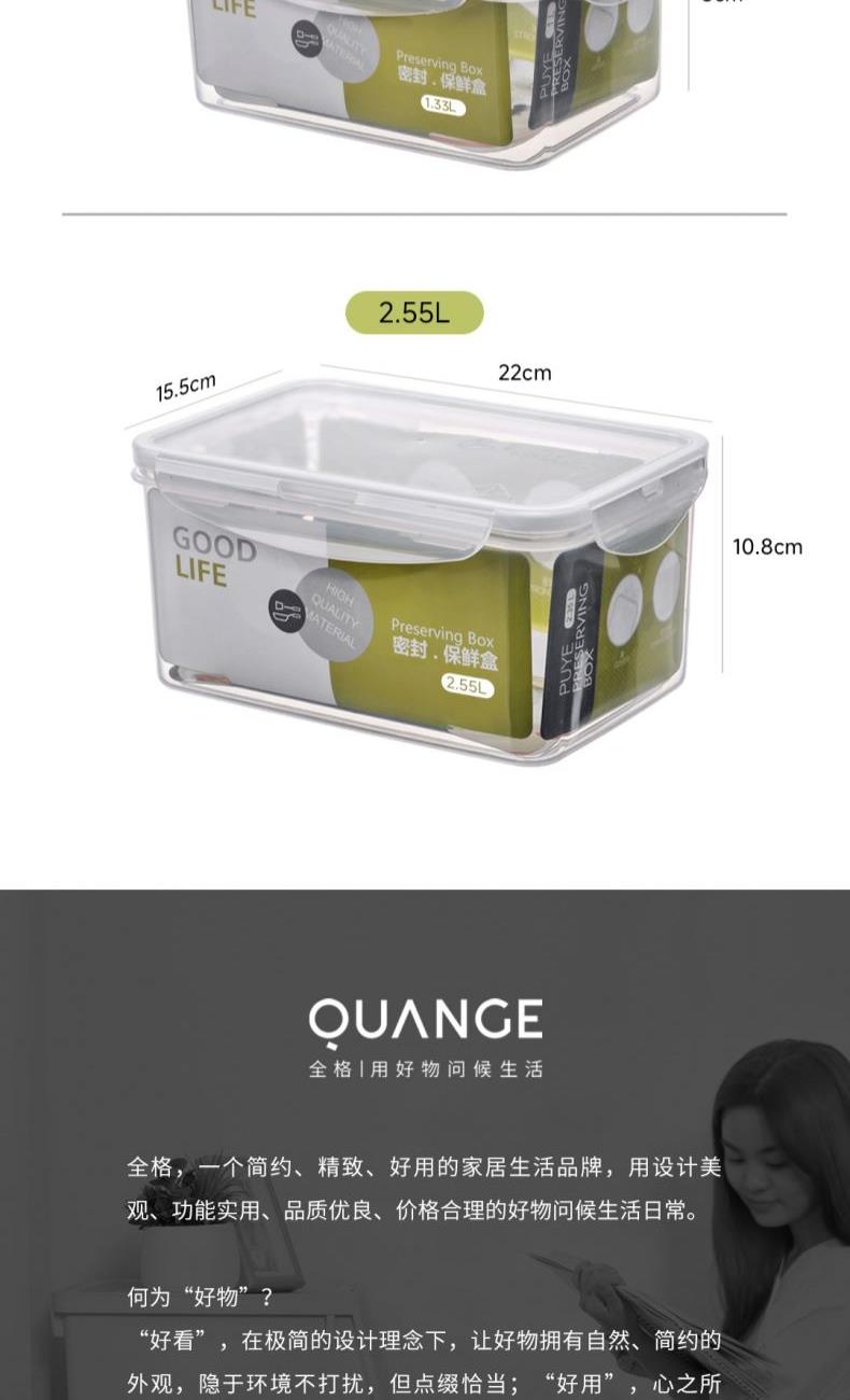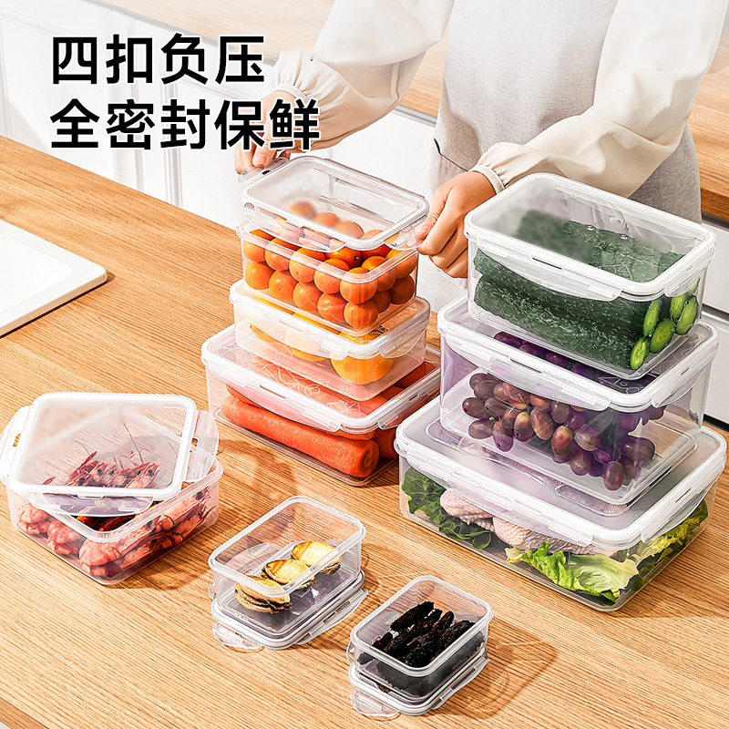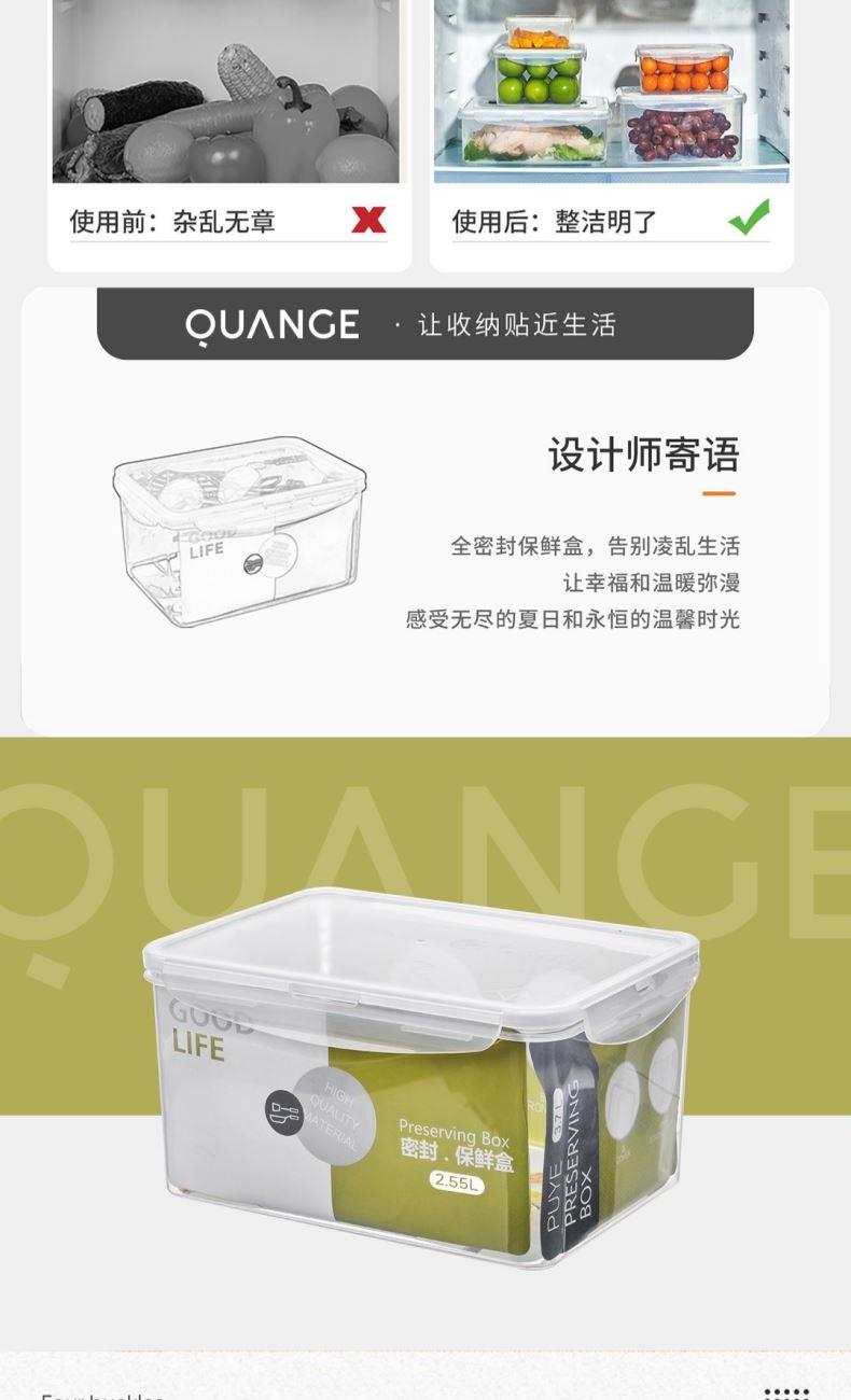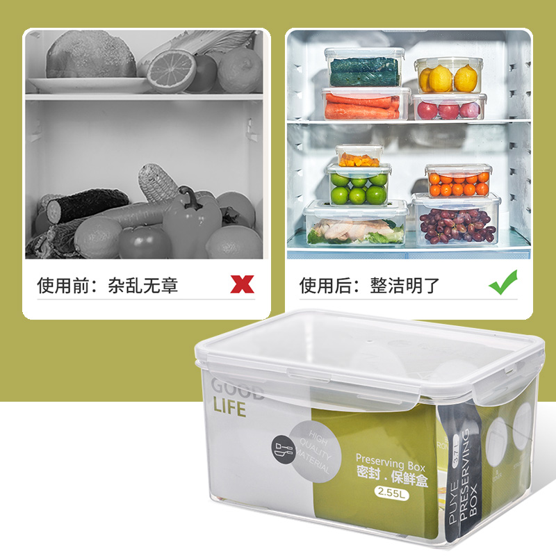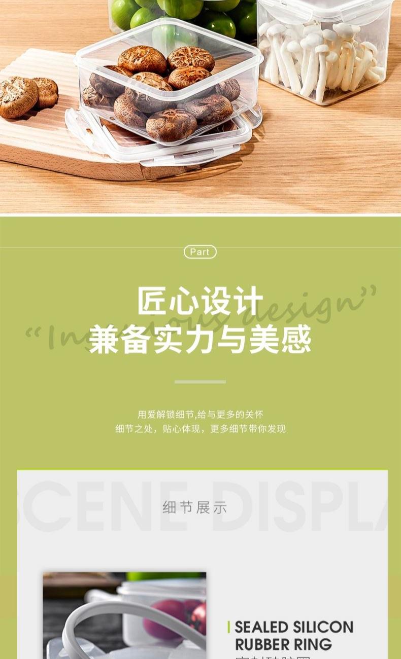 颜色:透明色 容量:660ml+1330ml+2550ml 材质:盖子材质:聚丙烯 硅胶树脂,盒子材质:PP材质 产品尺寸:0.66L:15*10.5*6.5cm,1.33L:18*12.2*8cm,2.55L:22*15.5*10.8cm 包装尺寸:22.5*16*11.5cm 毛重:0.607kg 1、660ml+1330ml+2550ml三个规格,分类收纳 2、四面锁扣,全密封不渗漏; 3、优选pp材质; 4、适用冰箱、微波炉加热; 5、可叠加堆放
