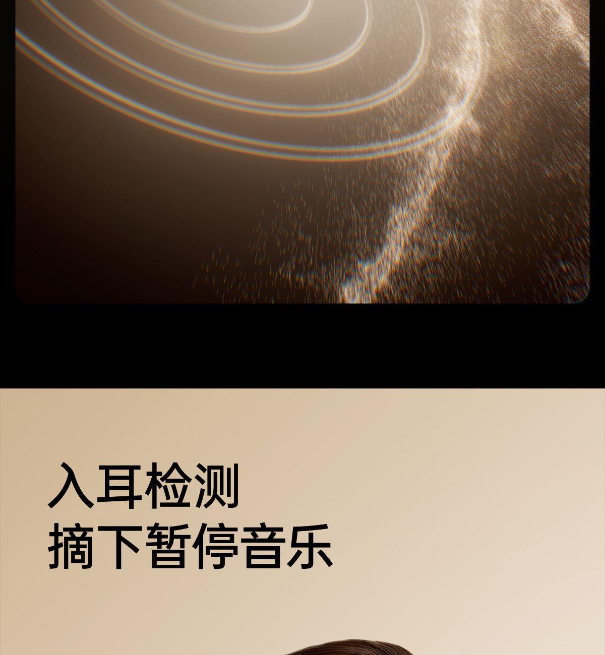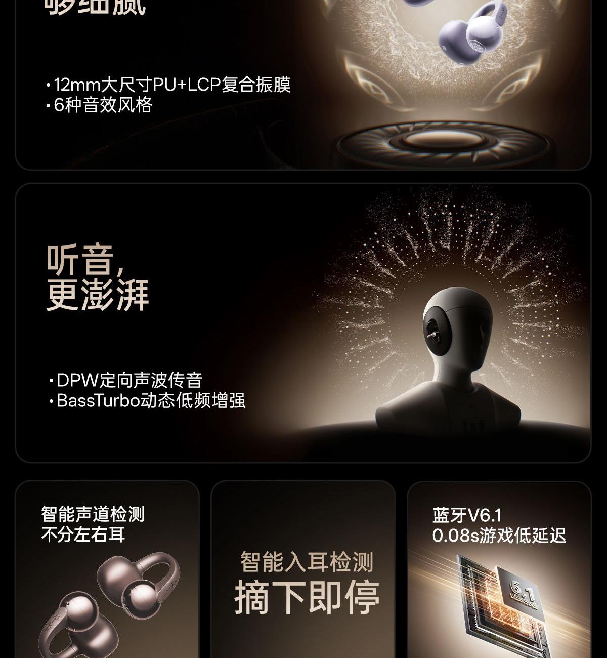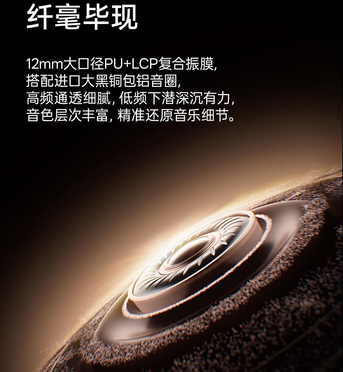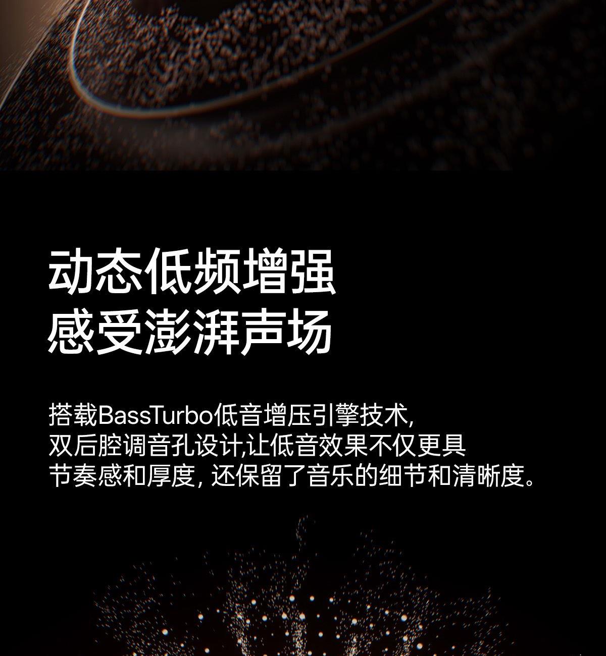 电镀流光美学,上耳更时尚 12mm大尺寸复合振膜,解析更细腻 DPW定向声波传音,BassTurbo动态低频增强 智能声道检测,不分左右耳 APP功能扩展 IP56级防尘防水