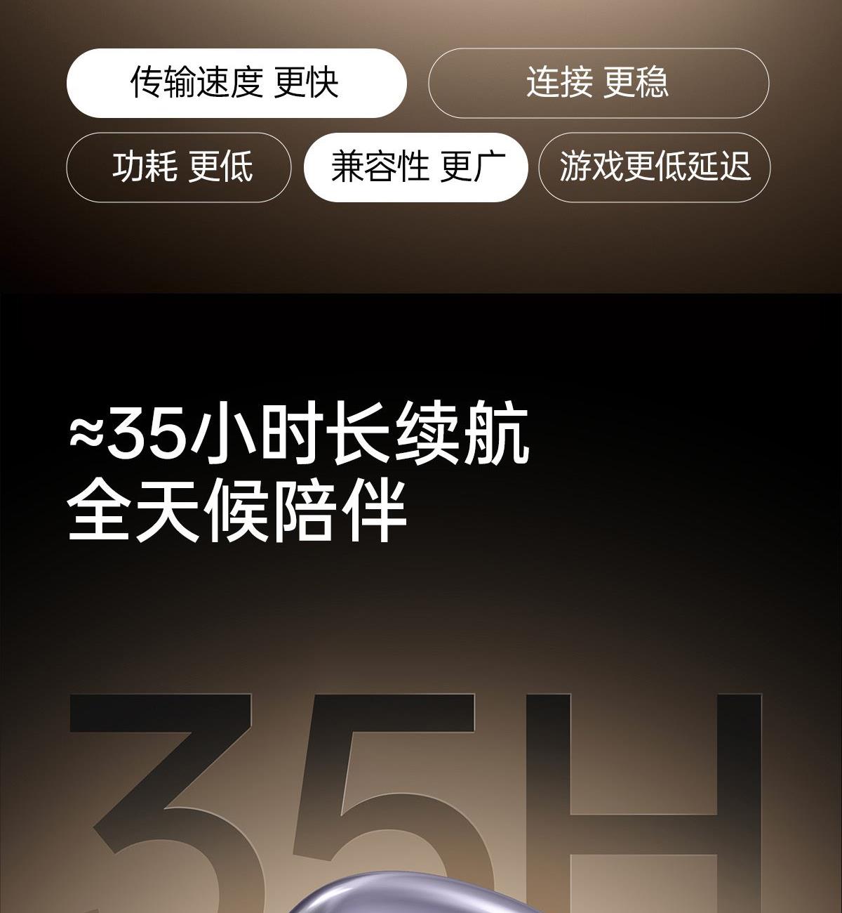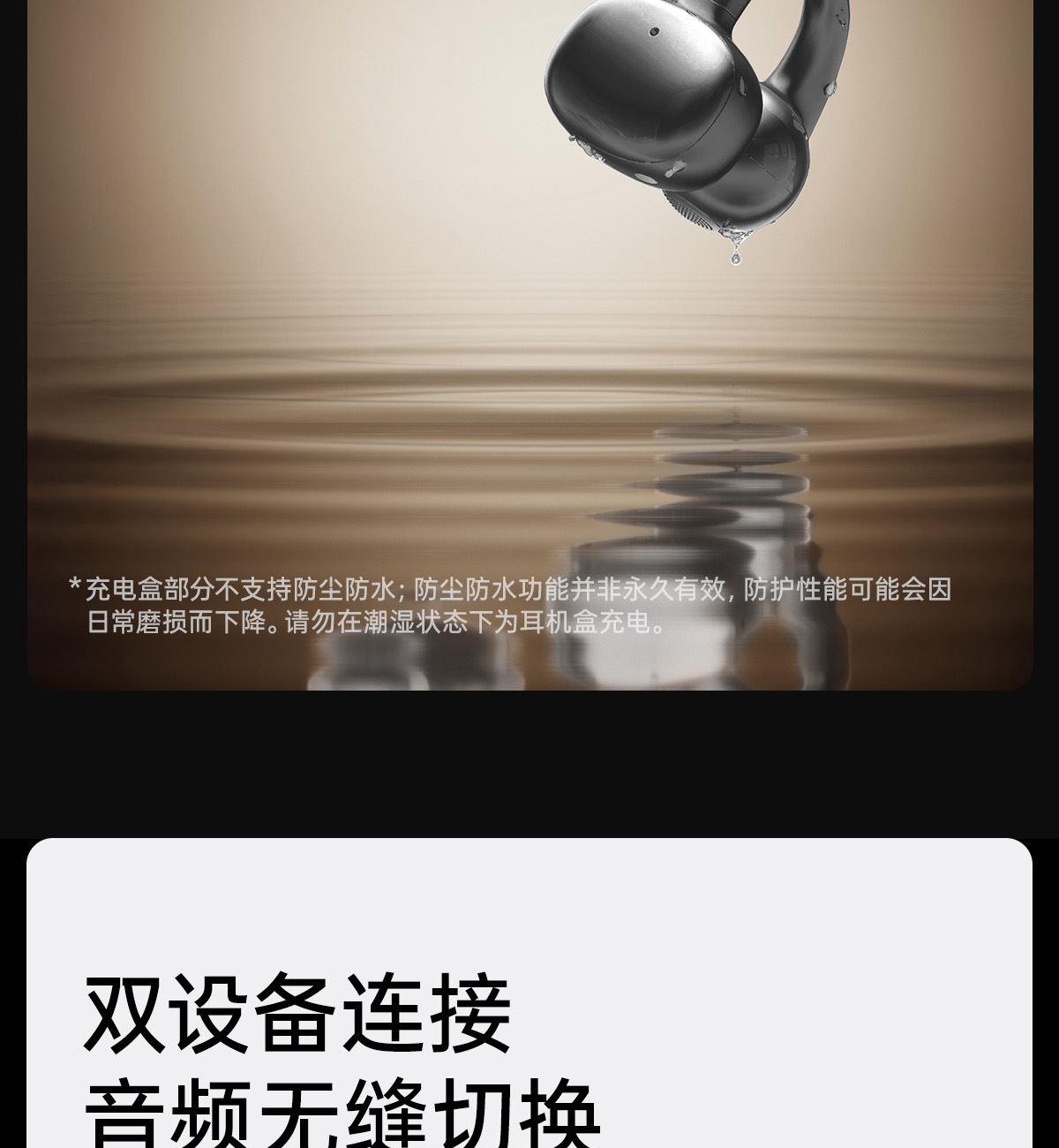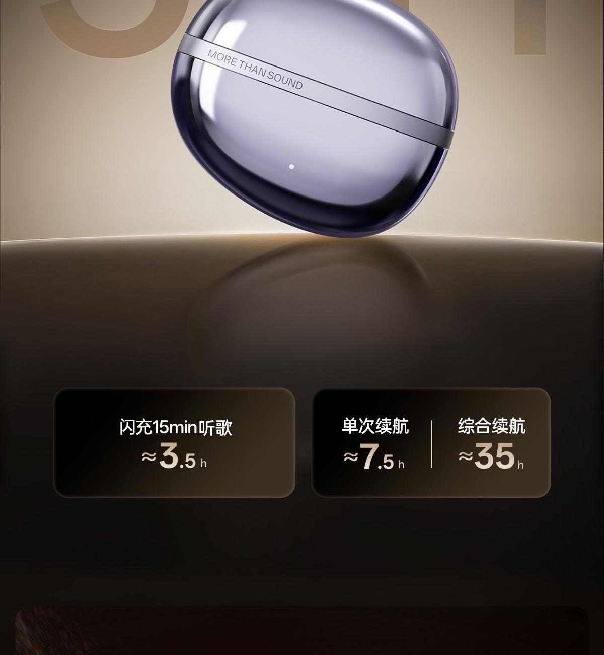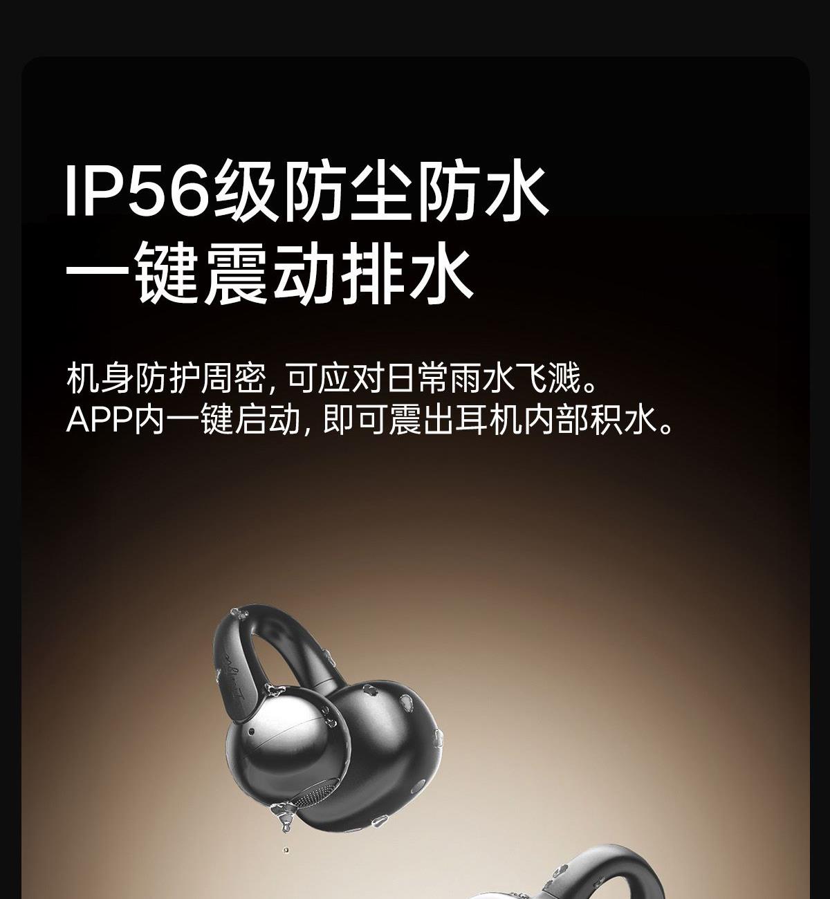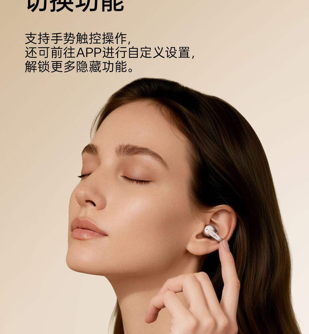 电镀流光美学,上耳更时尚 12mm大尺寸复合振膜,解析更细腻 DPW定向声波传音,BassTurbo动态低频增强 智能声道检测,不分左右耳 APP功能扩展 IP56级防尘防水