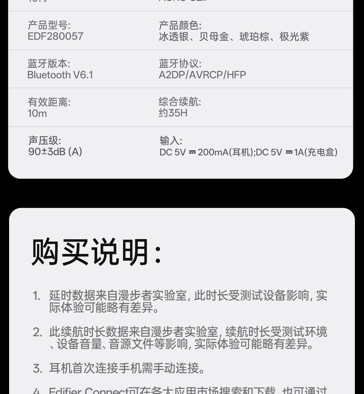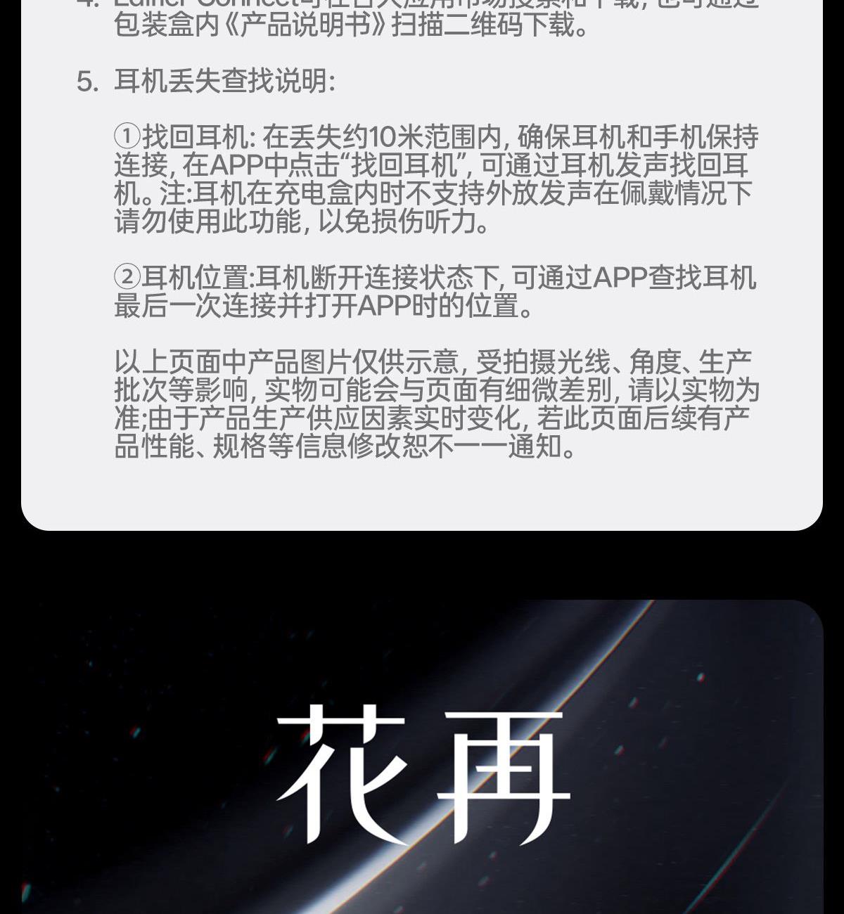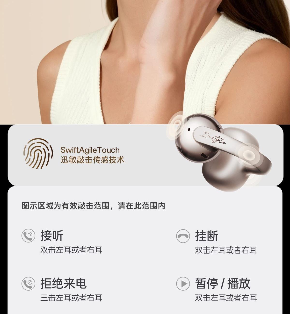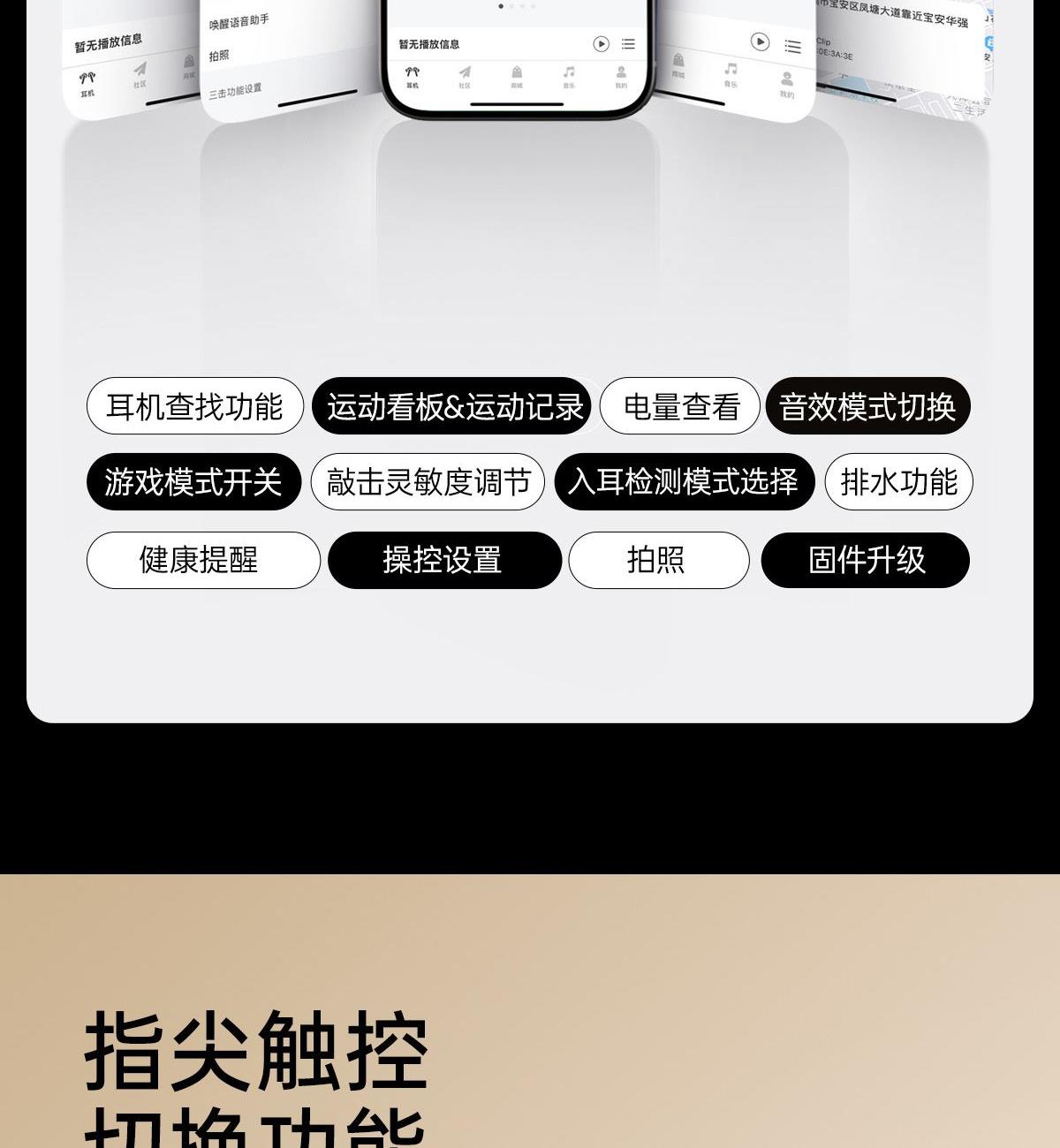 电镀流光美学,上耳更时尚 12mm大尺寸复合振膜,解析更细腻 DPW定向声波传音,BassTurbo动态低频增强 智能声道检测,不分左右耳 APP功能扩展 IP56级防尘防水