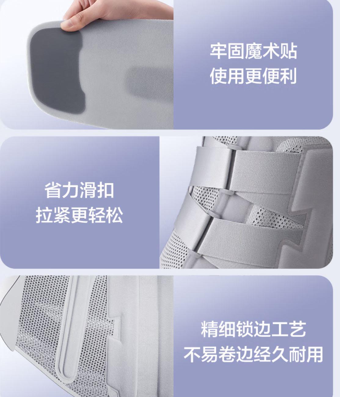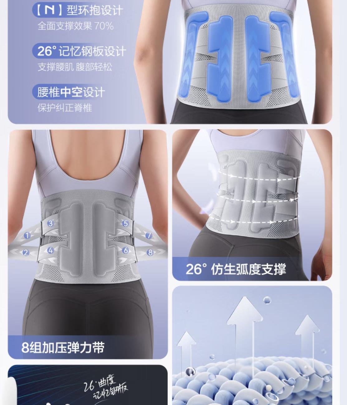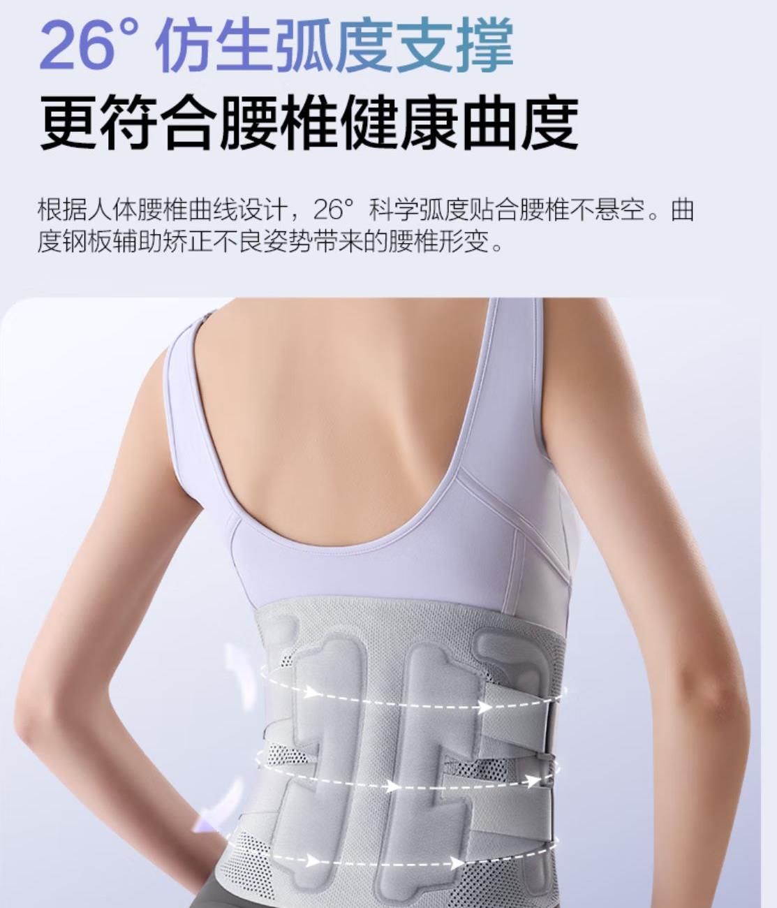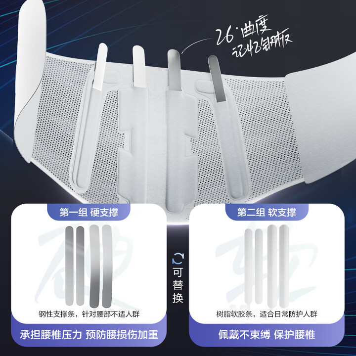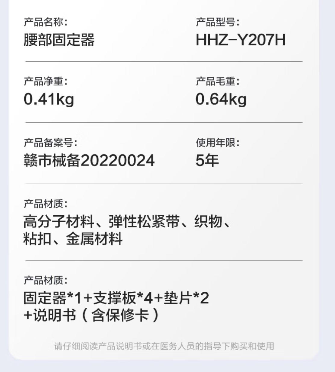 产品净重:0.64kg 产品尺寸:长235mm;宽1070mm;高10mm 包装清单:固定器*1+支撑板*4+垫片*2+说明书(含保修卡) 精细锁边工艺,不易卷边,经久耐用 8组加压弹力带,二次加压撑力更足 26度仿生弧度支持,更符合腰椎健康曲度