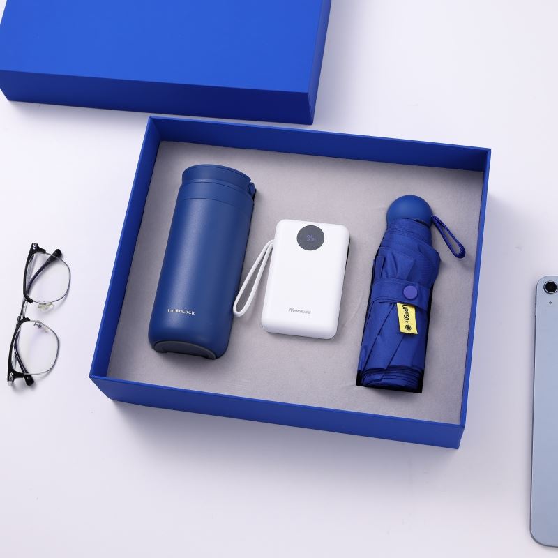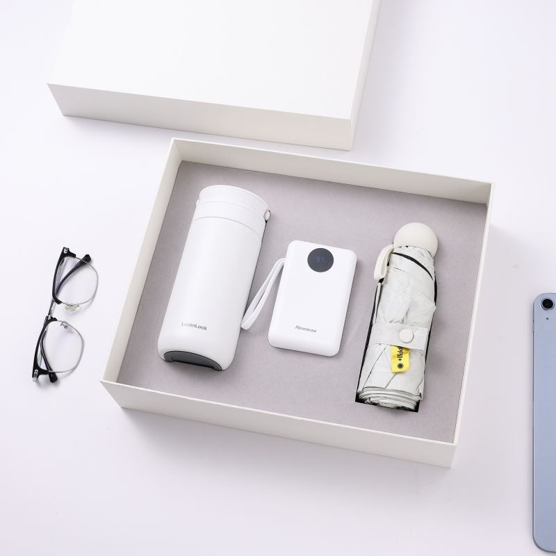 配 置:乐扣杯+纽曼充电宝+雨伞+礼盒手提袋广告方式:乐扣杯+充电宝激光logo,雨伞丝印logo 礼盒+手提袋烫金/烫银 乐扣杯:乐扣杯:175*73mm(380ML) 雨 伞:190*50mm(5折8骨防晒黑胶布) 充电宝:纽曼PM229#原装正品20000mAh 礼 盒:330*270*80mm(塑封) 手提袋:340*290*80mm 14套-箱(585*550*375mm)箱