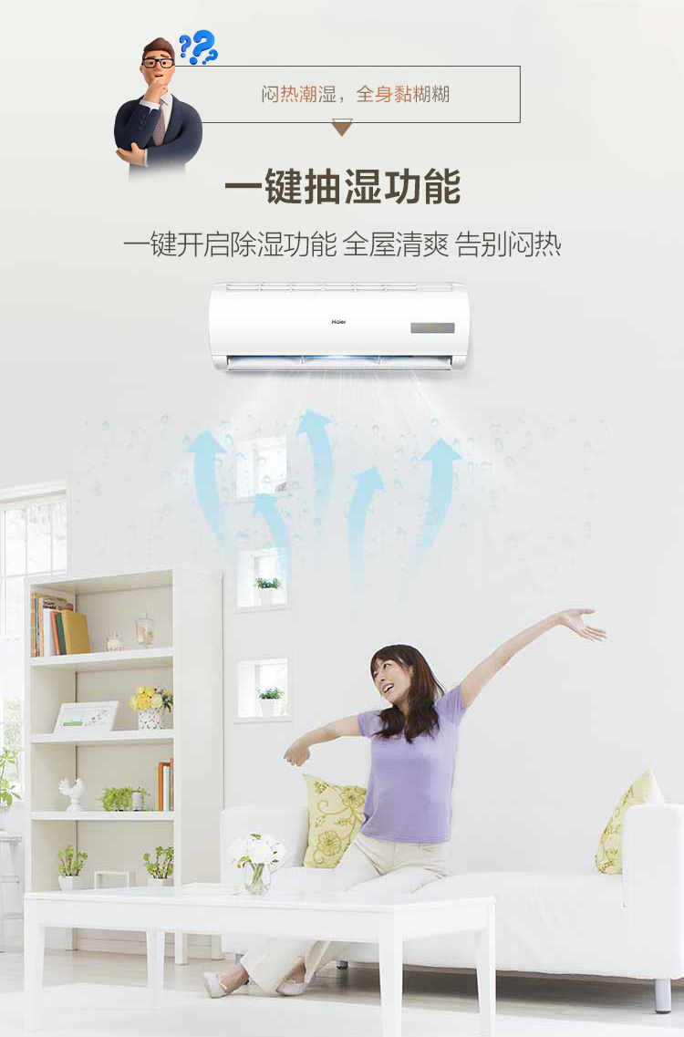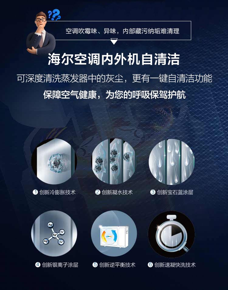 自清洁功能:配备自清洁功能,通过冷凝水结霜、化霜的过程,自动清洁空调内部蒸发器,有效去除污垢和细菌,保证出风清新干净。