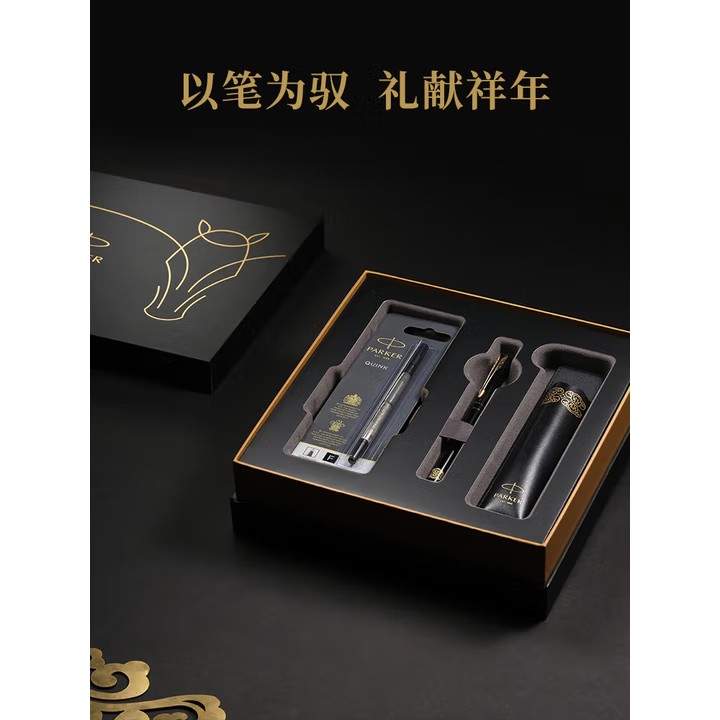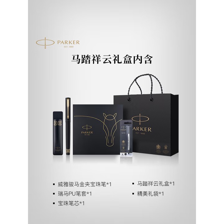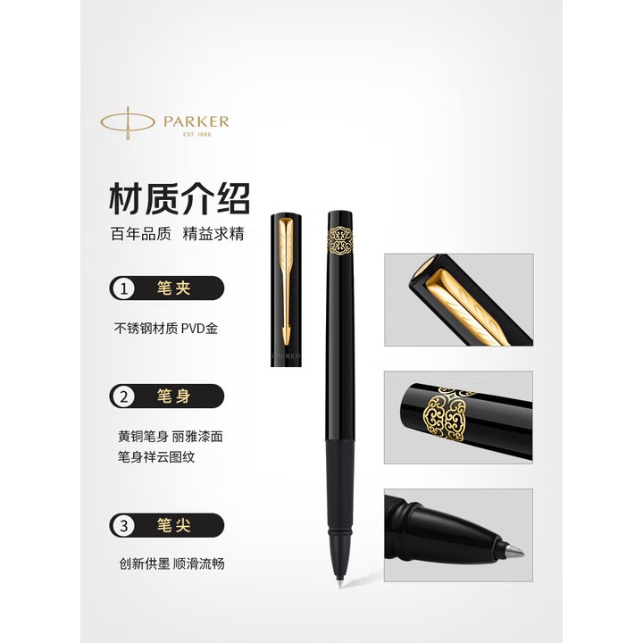 规格:含威雅骏马宝珠笔、悬挂装宝珠笔芯、PU笔套 笔夹:不锈钢材质PVD金 笔基:黑色树脂 笔身:黄铜材质,丽雅漆面,笔身祥云图纹 派克威雅骏马宝珠笔款,经典再造 流畅曲线搭配镀金细节,迸发进取之力
