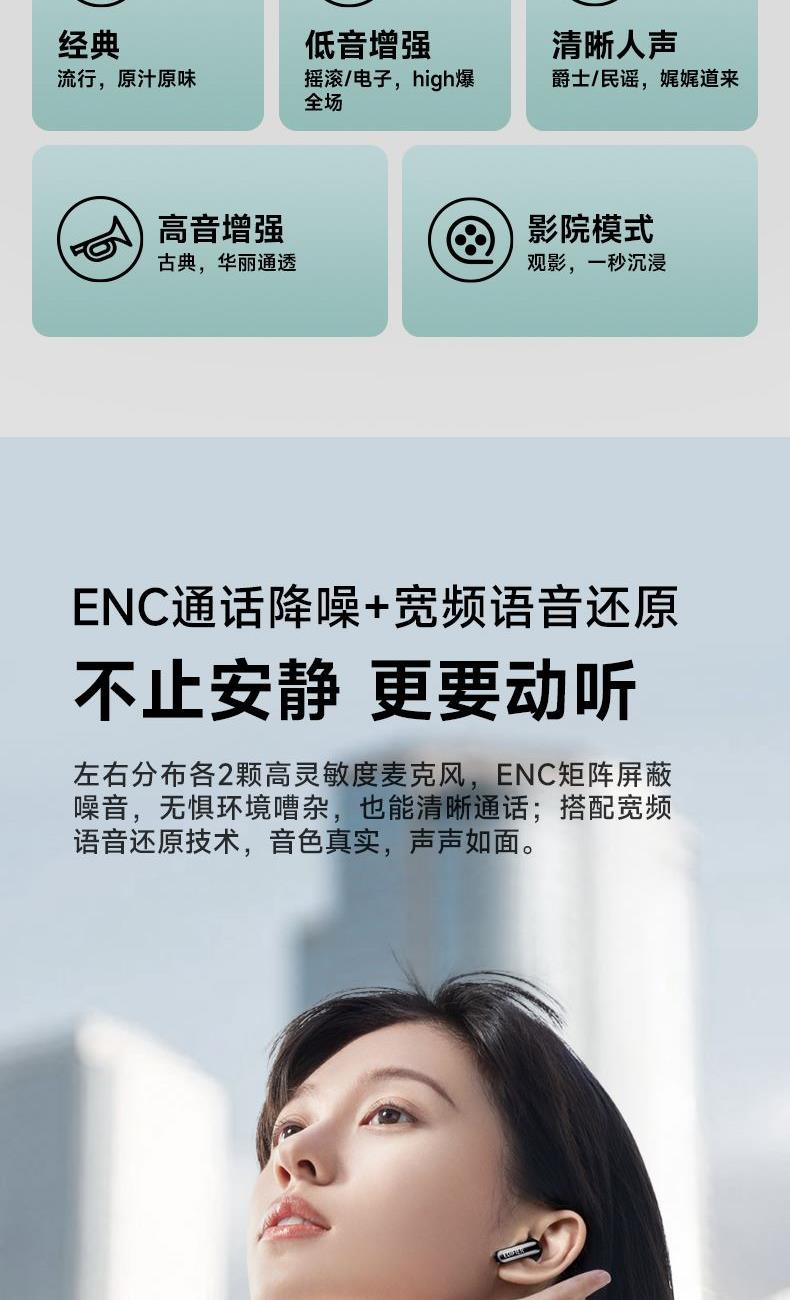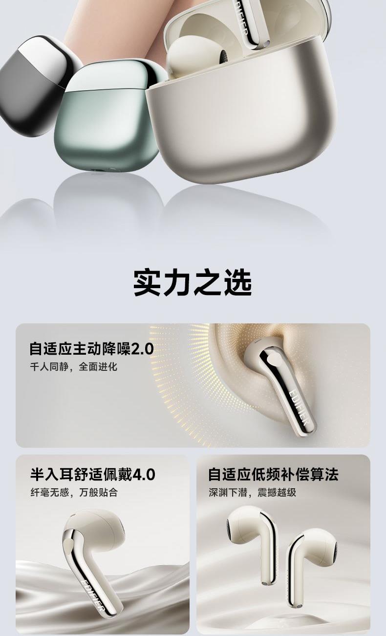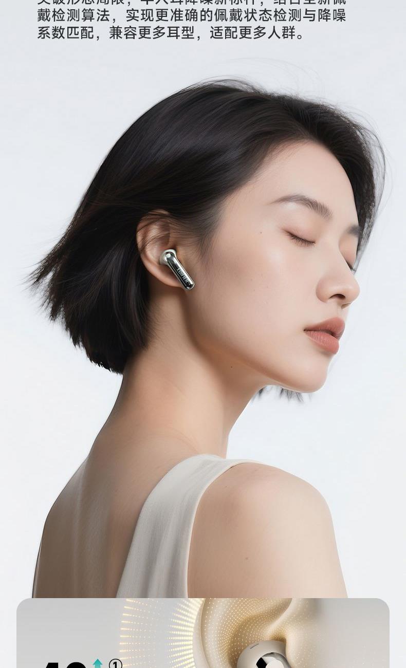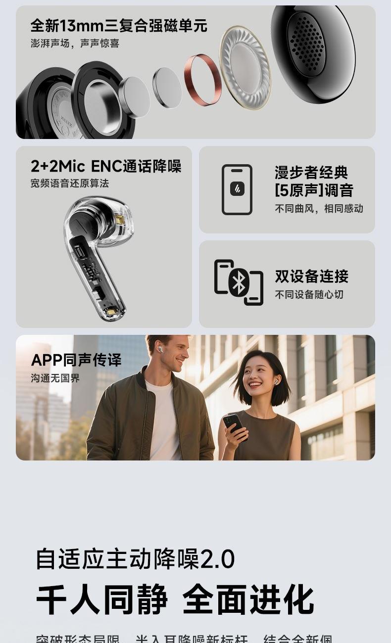 自适应主动降噪2.0,半入耳舒适佩戴4.0 自适应低频补偿算法 全新13mm三复合强磁单元 2+2Mic ENC通话降噪,经典[5原声]调音 支持双设备连接,APP同声传译