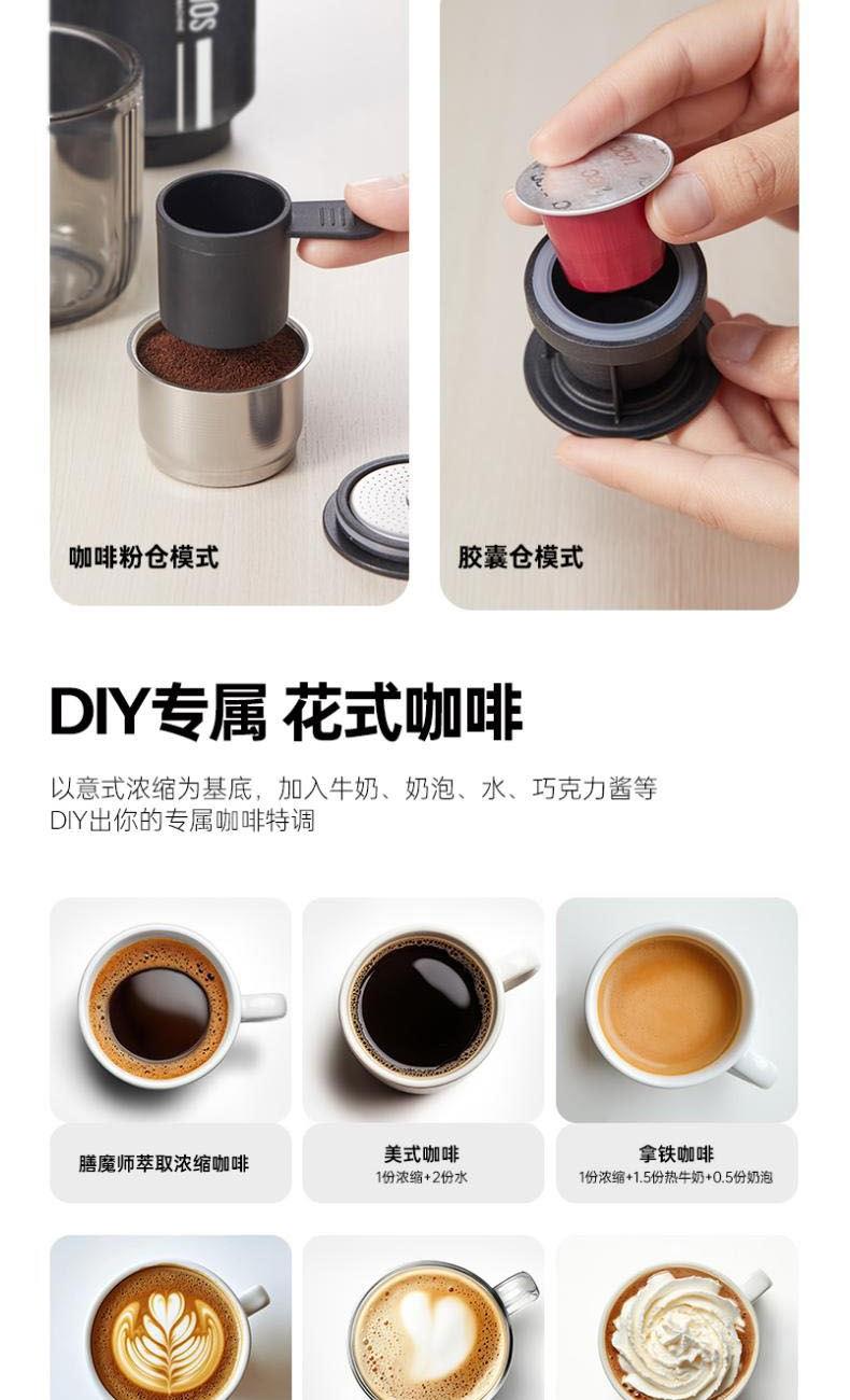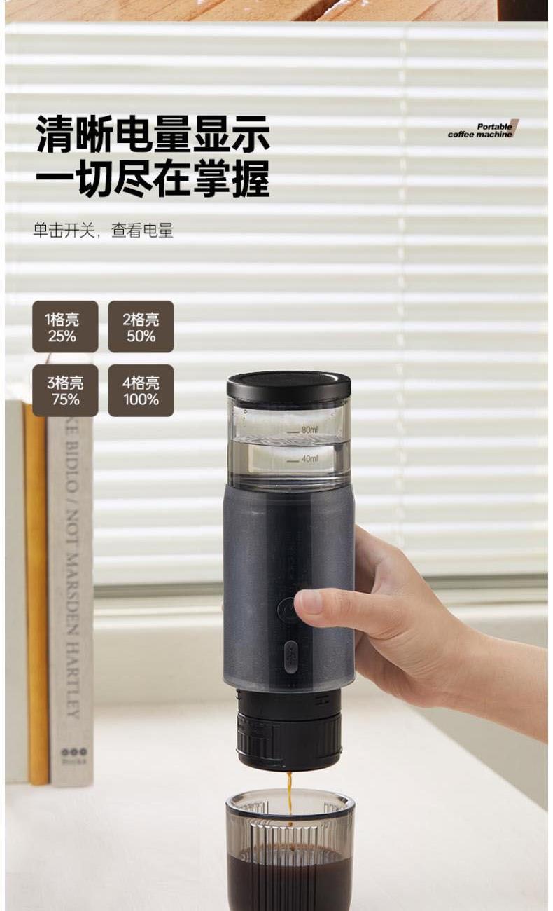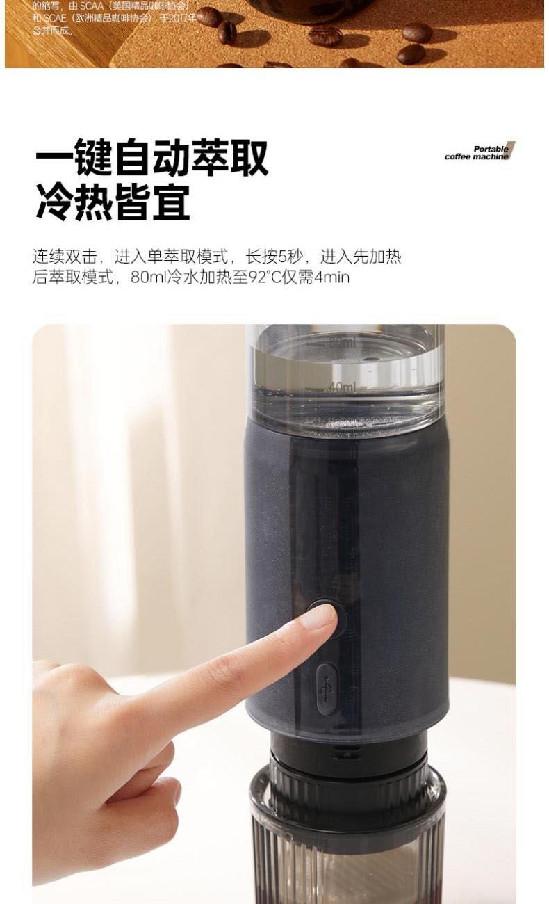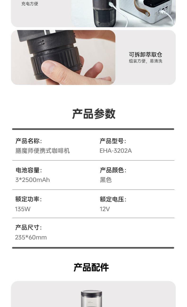 产品颜色:黑色 额定功率:135W 电池容量:3*2500mAh 净重:0.7kg 毛重:0.85kg 产品尺寸:235*60mm 外箱尺寸:310*190*100mm 1.15bar黄金泵压 轻松压出绵密油脂 2. 自加热黑科技 无需热水也能现煮 3. 一键傻瓜操作 自动停更显高 级感