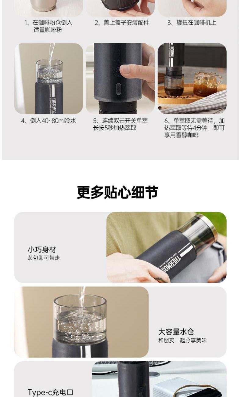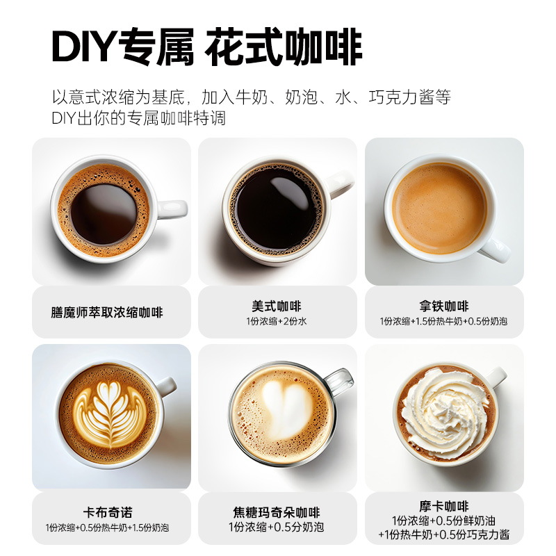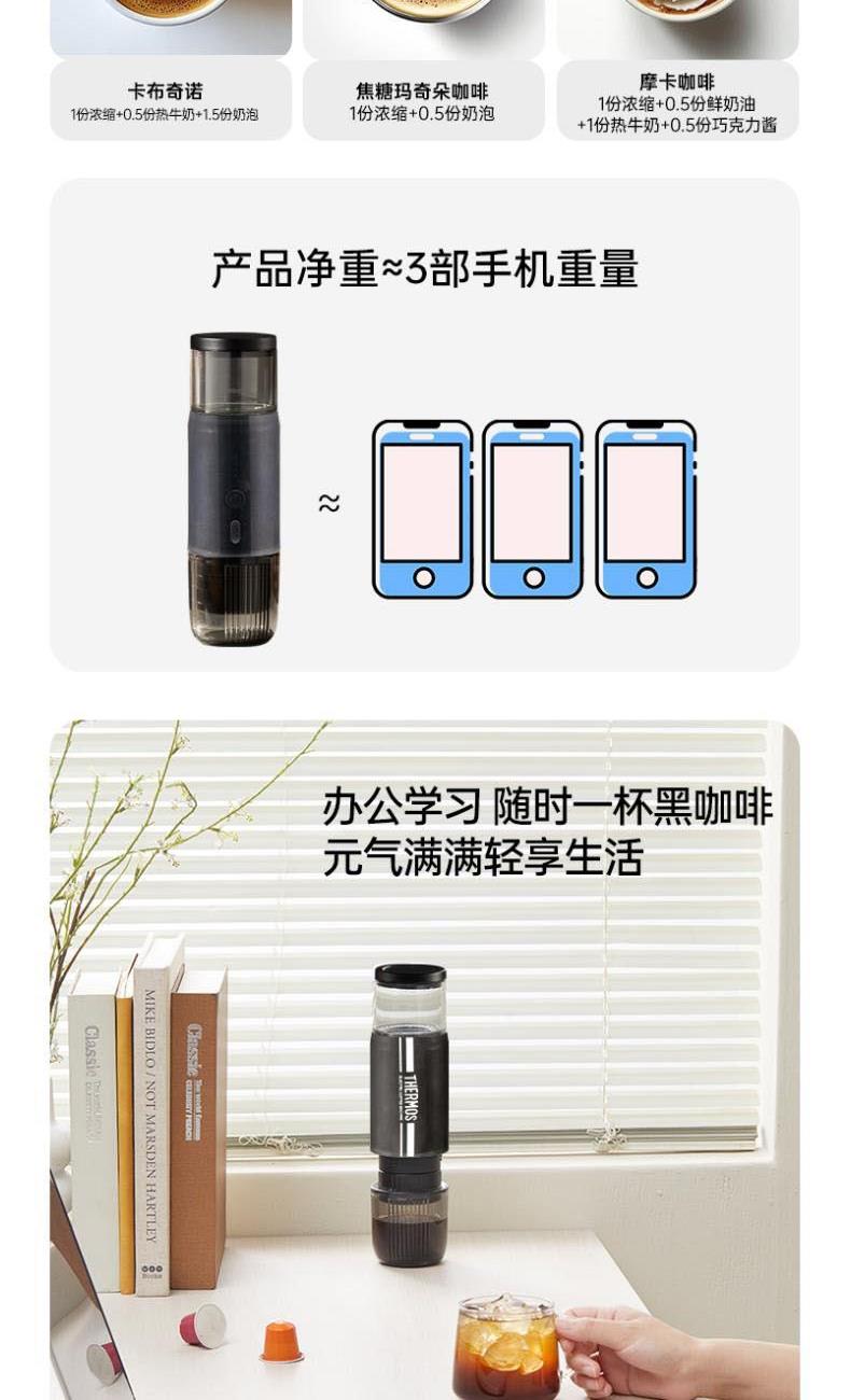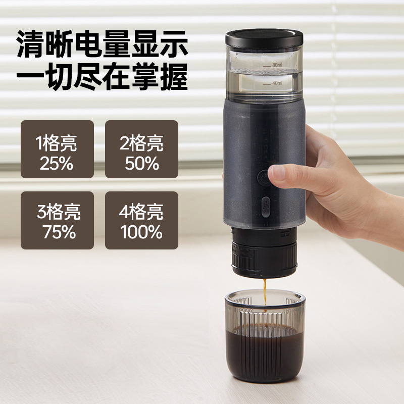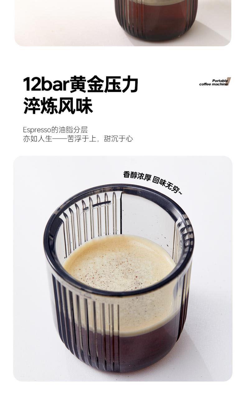 产品颜色:黑色 额定功率:135W 电池容量:3*2500mAh 净重:0.7kg 毛重:0.85kg 产品尺寸:235*60mm 外箱尺寸:310*190*100mm 1.15bar黄金泵压 轻松压出绵密油脂 2. 自加热黑科技 无需热水也能现煮 3. 一键傻瓜操作 自动停更显高 级感