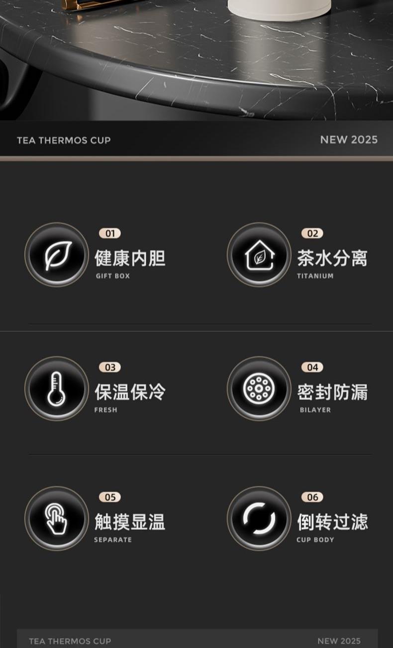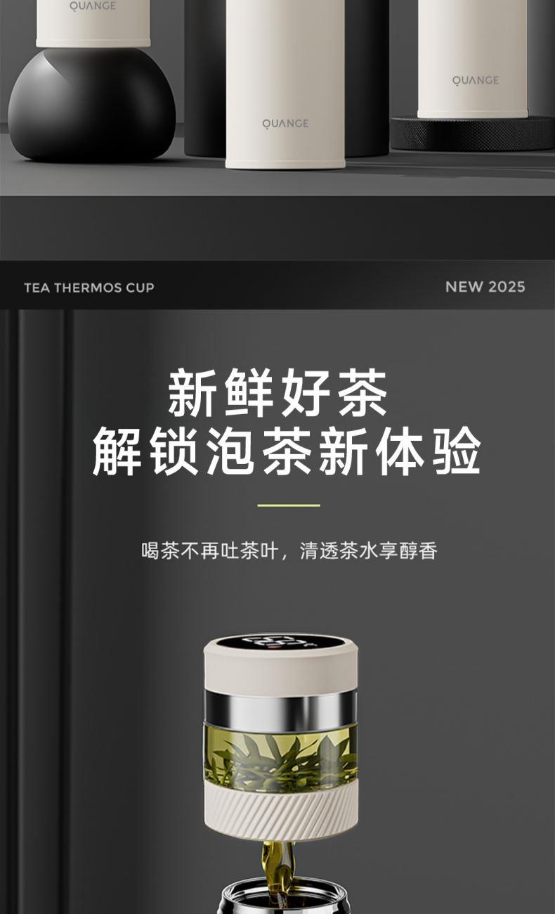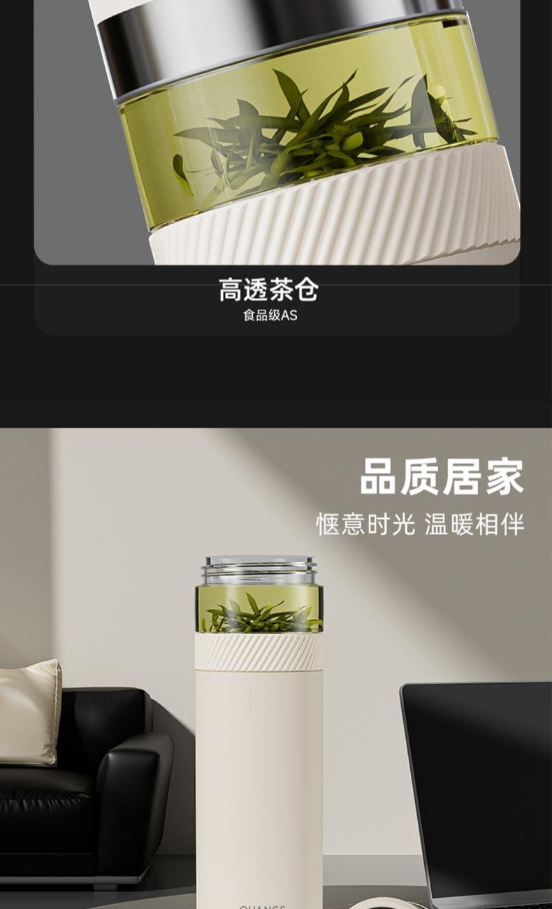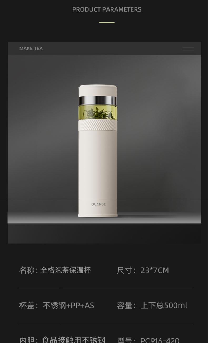 颜色:白色 容量:420ml+80ml(茶仓) 材质:内胆底SUS316,茶仓:AS 配置:独立茶仓,温度显示 包装:彩盒 1、容量420ml+80ml(茶仓),独立茶仓 2、智能测温,轻触显温,一目了然 3、轻量便携,暖心出行