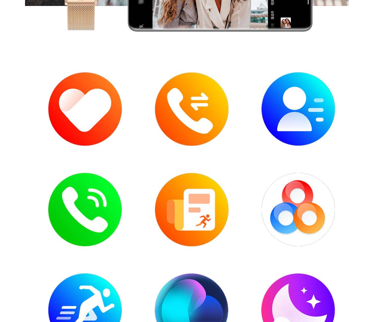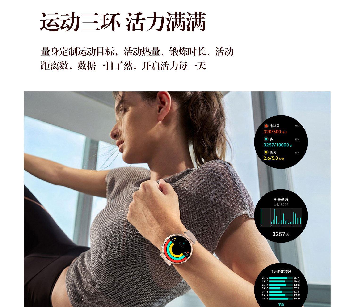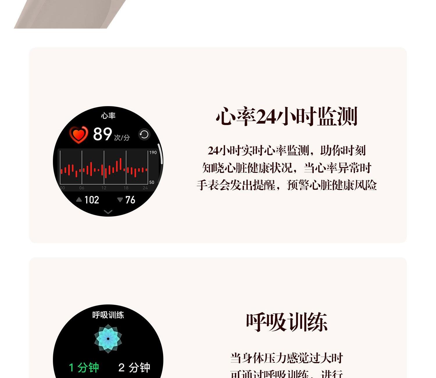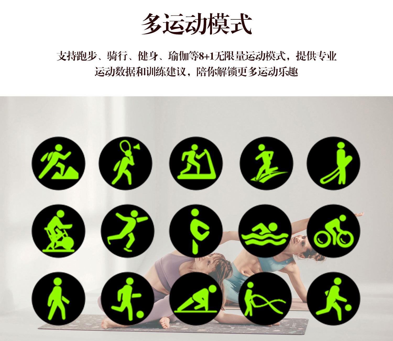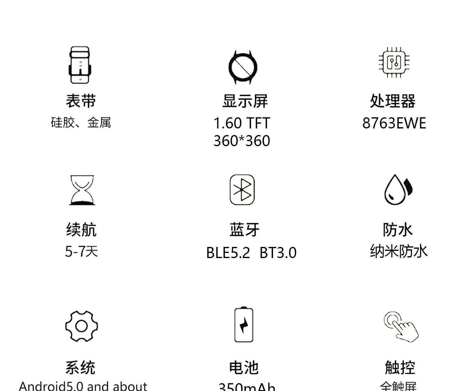 1.6寸TFT屏、分辩率360*360、350mAh电池、双蓝牙芯片通话(播放蓝牙音乐和蓝牙通话)限量款运动推送8+1模式、心率检测、计时器、呼吸训练(在手环查看近期数据记录)、时间日期显示、计步、卡路里、距离带屏显示、常用联系人功能、睡眠监测(睡眠时间、睡眠质量)、语音助手、呼吸训练、床头钟、标准运动功能(计步、距离、卡路里)、GPS轨迹运动、来电提醒,来电、短信、邮件、微信、QQ等消息内容推送、秒表、查找手机、达标提醒、喝水提醒、抬手亮屏、久坐提醒、闹钟提醒、摇一摇拍照、日历