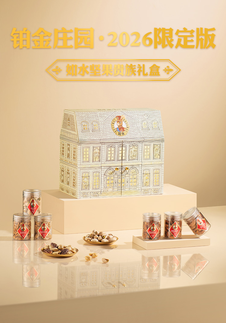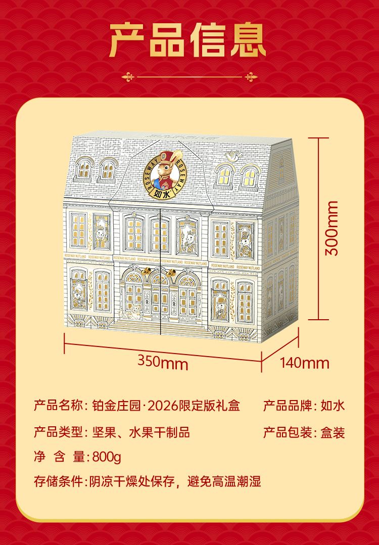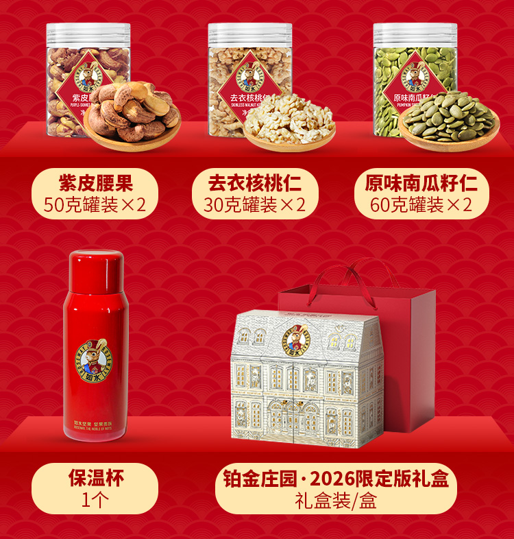 如水铂金庄园·2026限定版礼盒 净含量:800g 如水手剥松籽50g 如水夏威夷果仁50g 如水碧根果仁50g 如水原味腰果仁50g 如水原味扁桃仁60g 如水琥珀核桃仁40g 如水蓝莓干80g 如水蔓越莓干60g 如水开心果40g*2 如水紫皮腰果50g*2 如水去衣核桃仁30g*2 如水原味南瓜籽仁60g*2 如水定制保温杯