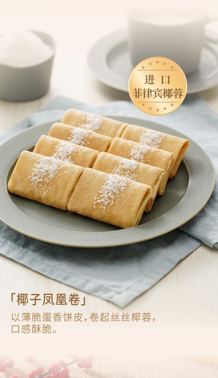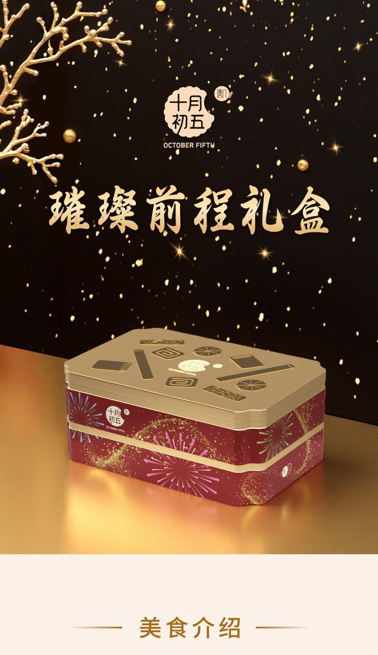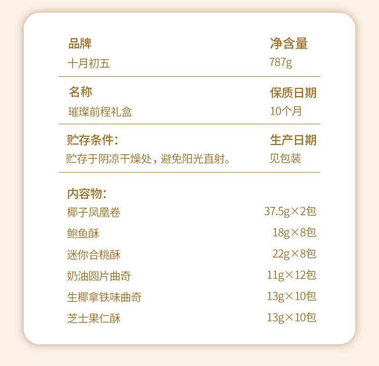 十月初五璀璨前程礼盒 净含量:787g 37.5g椰子凤凰卷X2 22g迷你合桃酥X8 18g鲍鱼酥X8 13g生椰拿铁味曲奇X10 11g奶油圆片曲奇X12 13g芝士果仁酥X10