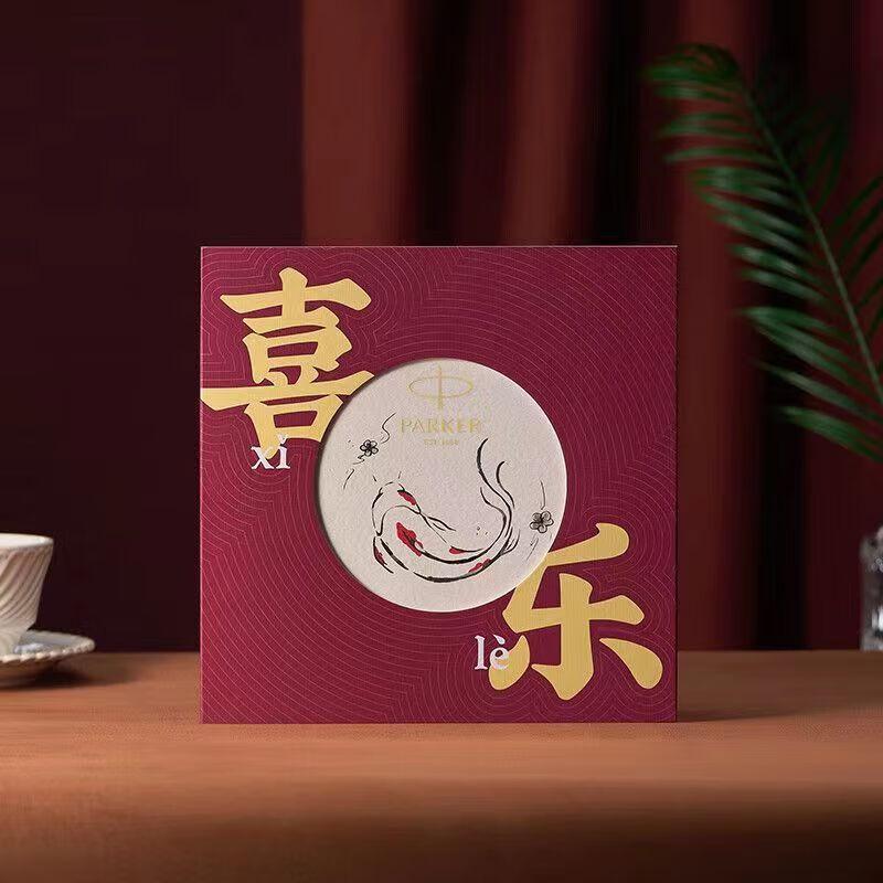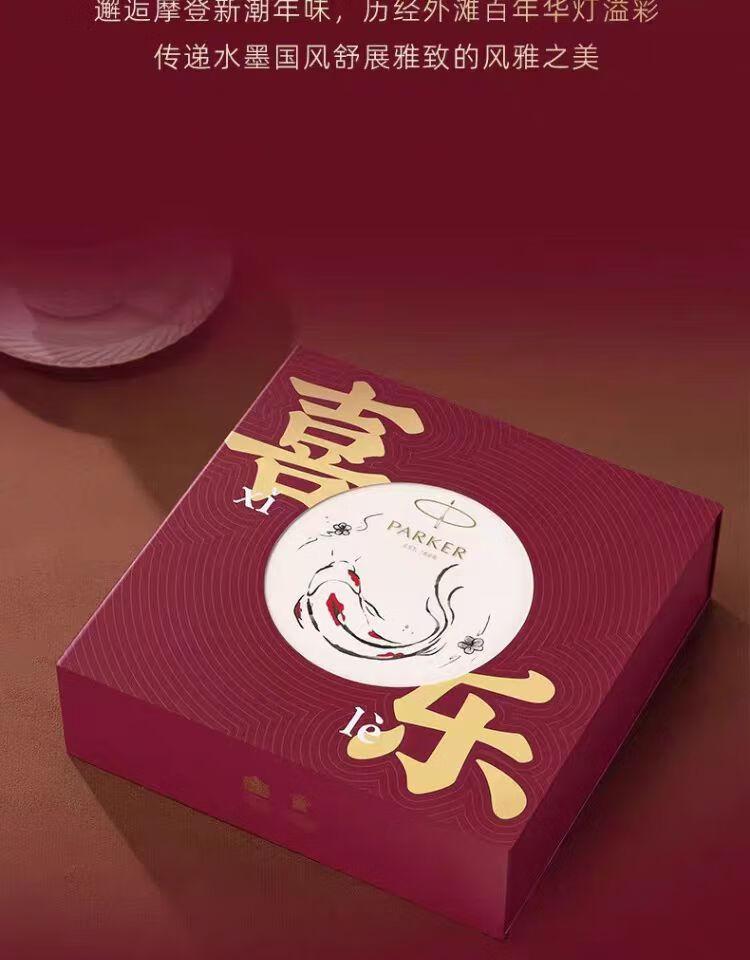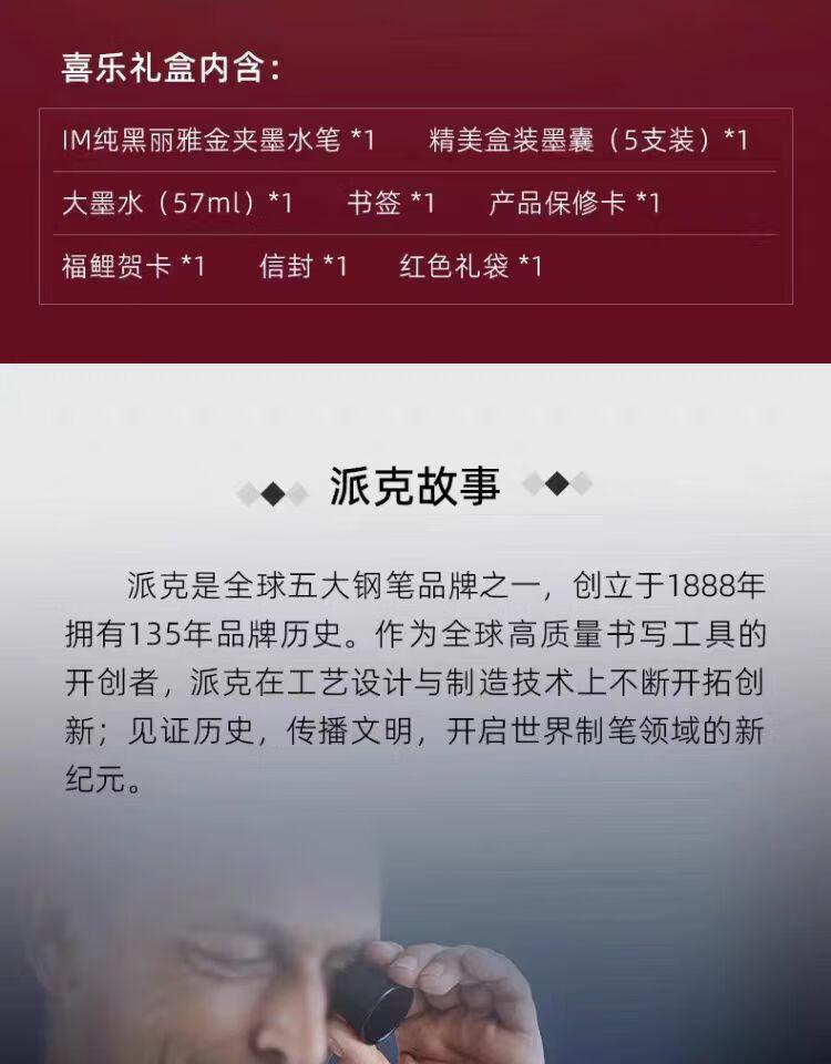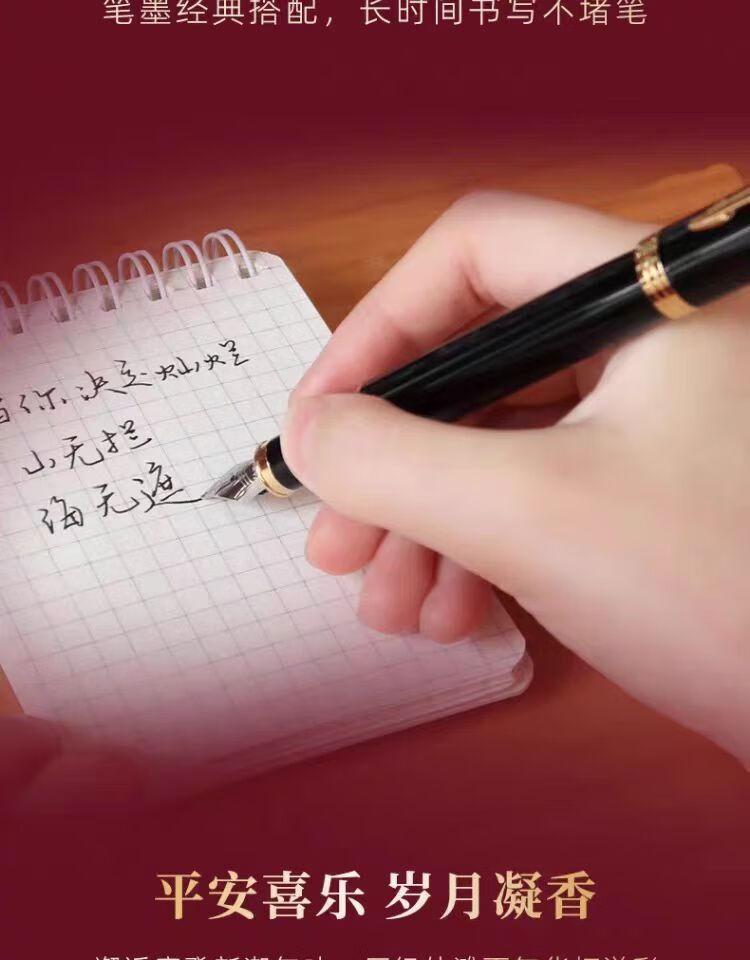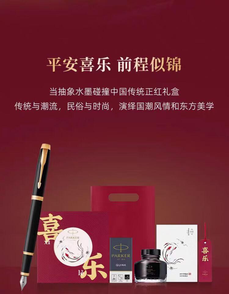 型号:新款IM纯黑丽雅金夹墨水笔+喜乐礼盒 规格:笔长138mm 直径12.6mm 净重约32g 粗细: F尖 笔尖:不锈钢笔尖 材质:铜质笔杆镀黑色丽雅漆,金色抛光笔夹笔环 礼盒:23*23*6.6cm 配置:笔*1、5支装盒装墨胆*1、57ml墨水*1、 瑞兔明信片、锦鲤明信片、信封、书签、手提袋、礼盒 平安喜乐,当抽象水墨碰撞中国传统正红礼盒,传统与潮流,民俗与时尚,演绎国潮风情和东方美学;