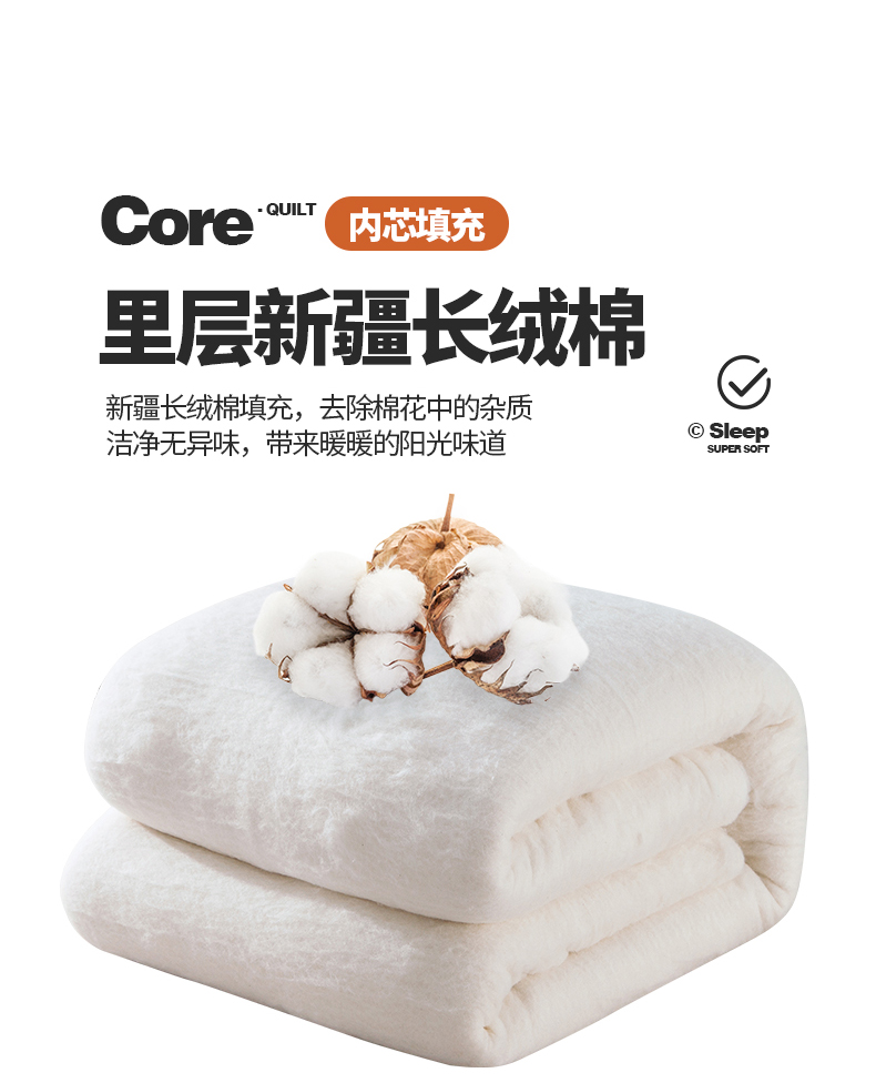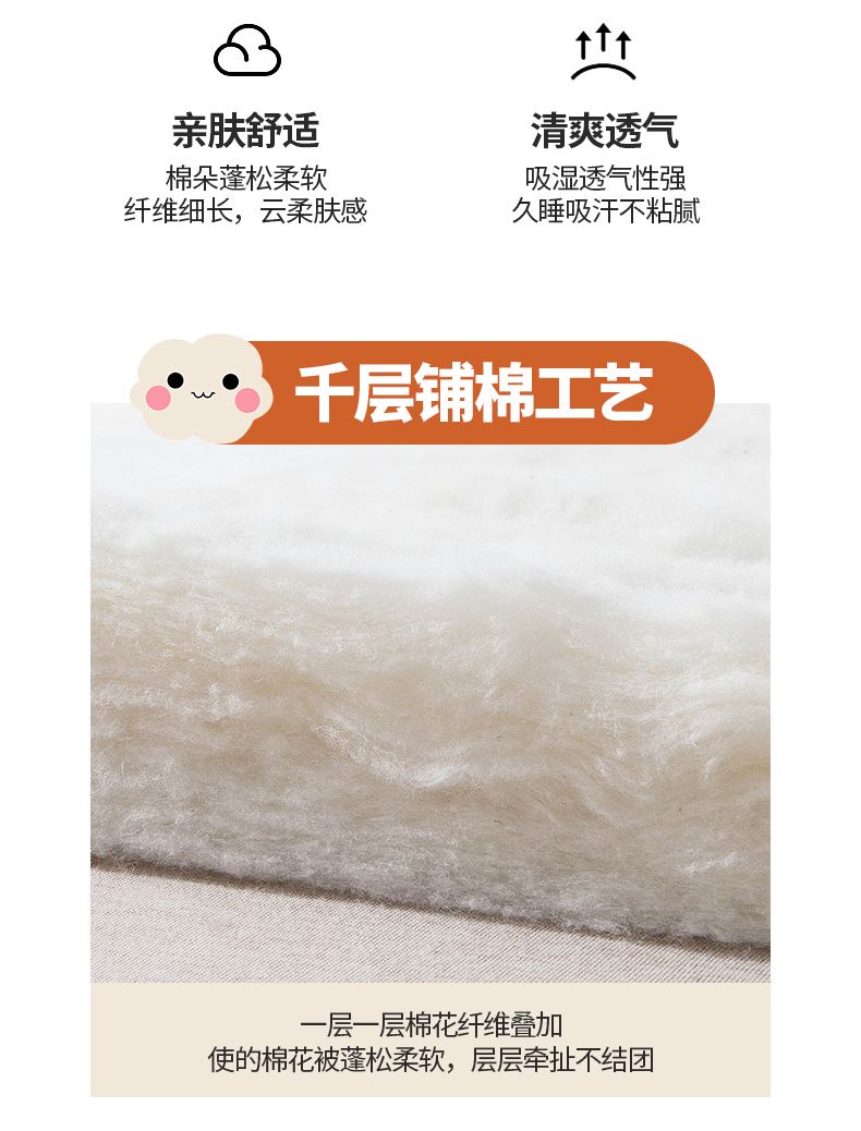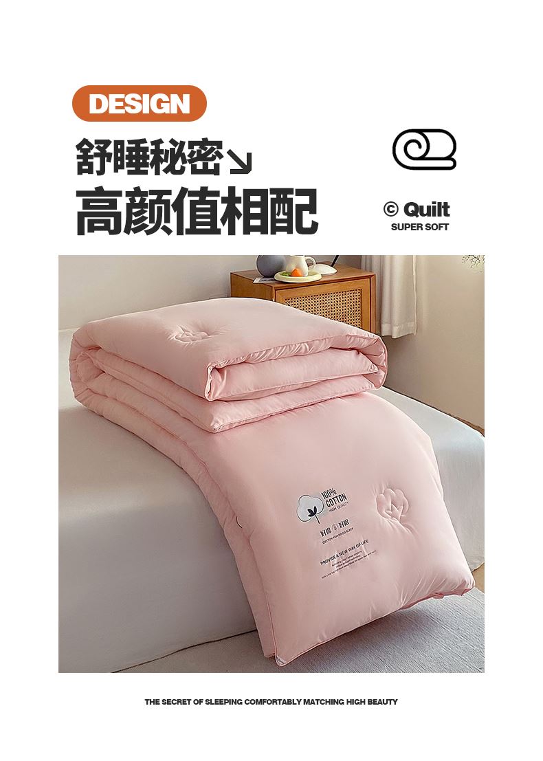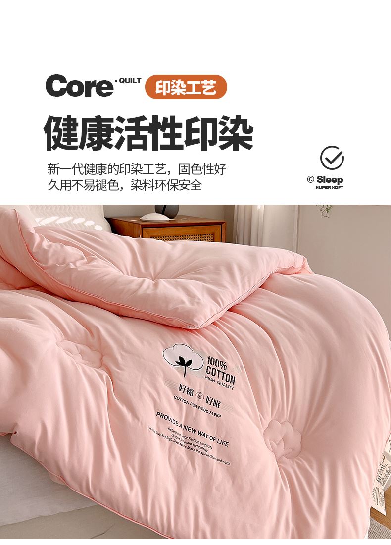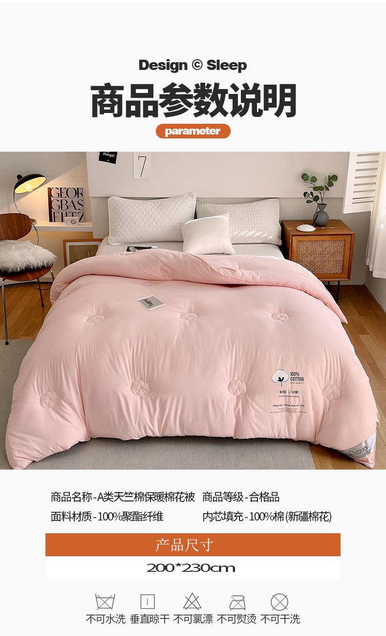 面料:天竺棉(聚酯纤维) 填充:新疆棉花 规格:200cm*230cm 总重量:2800g 包装:精美软包 天竺棉面料,会呼吸的好面料,吸湿透气手感媲美内衣,摸起来细腻柔软,填充选用优质新疆棉花。A类高标准,无刺激,适合敏感肌肤。
