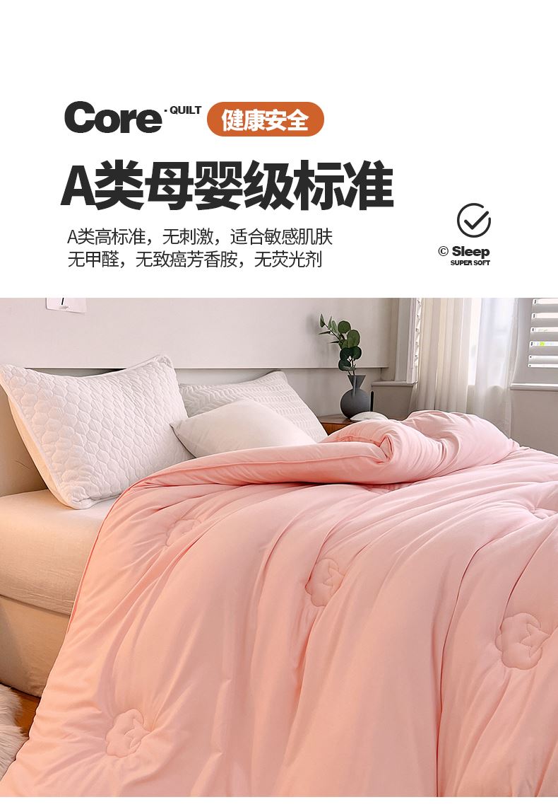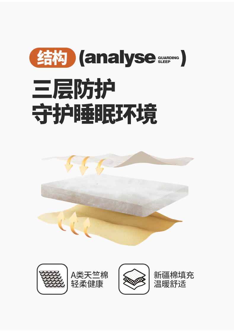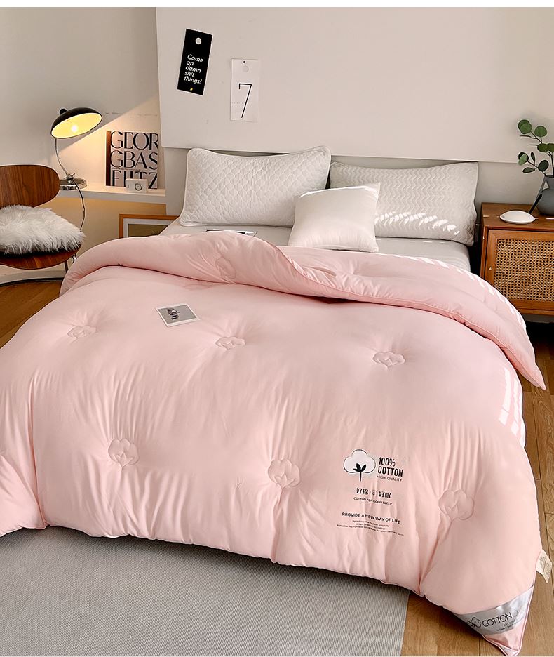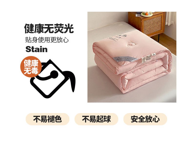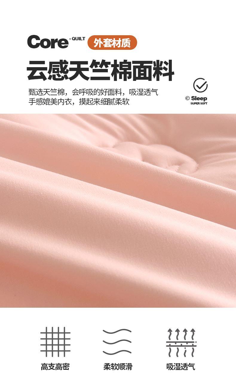 面料:天竺棉(聚酯纤维) 填充:新疆棉花 规格:200cm*230cm 总重量:2800g 包装:精美软包 天竺棉面料,会呼吸的好面料,吸湿透气手感媲美内衣,摸起来细腻柔软,填充选用优质新疆棉花。A类高标准,无刺激,适合敏感肌肤。