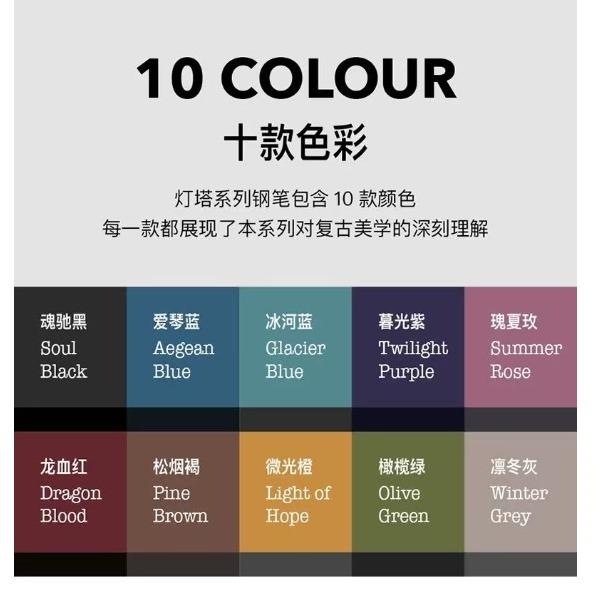 型号:灯塔系列墨水笔 类型:螺纹上墨式墨水笔 重量:墨水/宝珠笔43g/47g 颜色分类:微光橙凛冬灰橄榄绿爱琴蓝龙血红魂驰黑 书写粗细:F尖 套餐类型:官方标配 包装方式:礼盒装 适用场景:送礼书写钢笔笔尖成分:铱金笔 /地区:笔尖种类:标准型 适用人群:商务办公人士 上墨方式:旋转吸墨笔杆材质:金属笔尖嵌入方式:明尖 笔身纹理:格子纹墨水材质:非碳素墨水