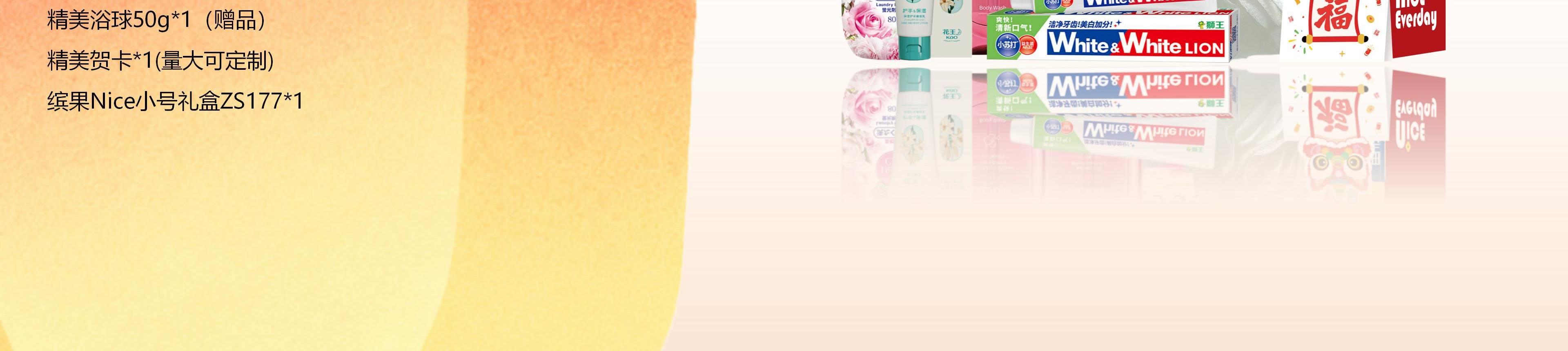 配置明细:(颜色香型随机) 日本进口蝶印水润丝滑洗发露500ml*1 日本进口蝶印水润丝滑沐浴露500ml*1 UYAJOY亚乐花香洗衣凝珠8g*32颗*1 UYAJOY亚乐玫瑰花香柔软洗衣液800g*1 花王(KAO)护手保湿霜50g*1 狮王(Lion)小苏打美白清新牙膏100g*1 狮王(Lion)细齿洁弹力护龈单支装牙刷*1 精美浴球50g*1(赠品) 精美贺卡*1(量大可定制) 缤果Nice小号礼盒ZS177*1