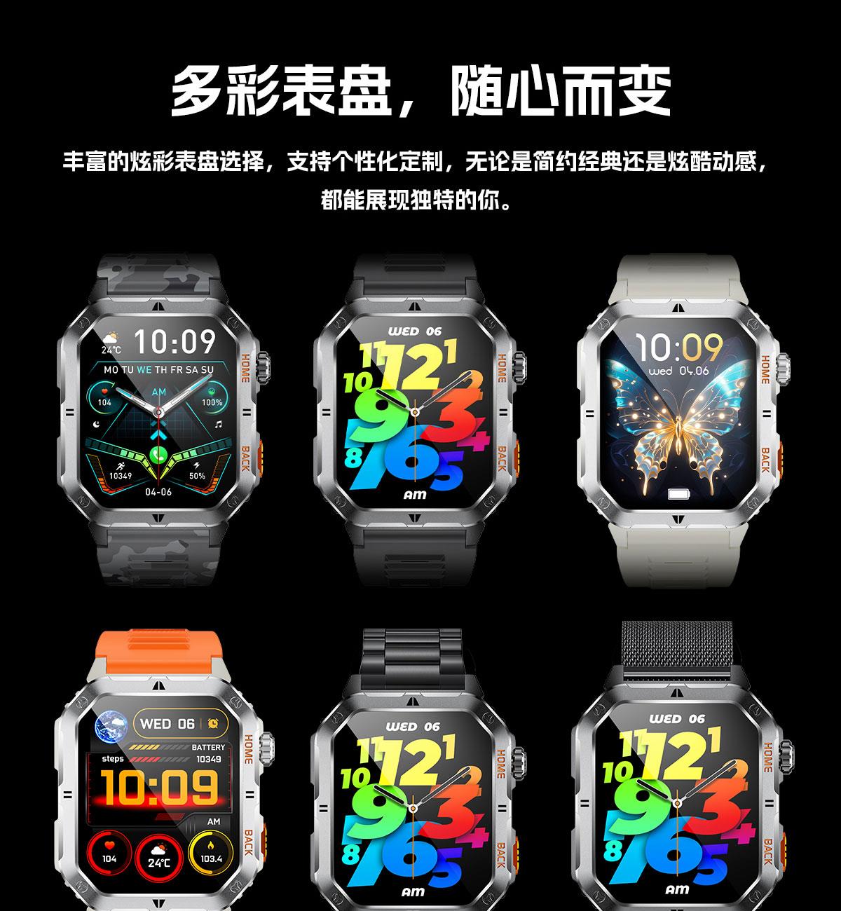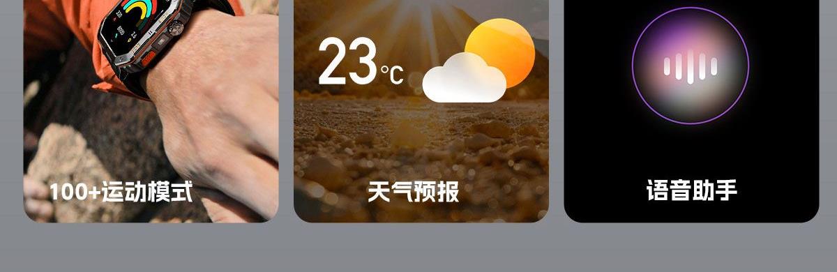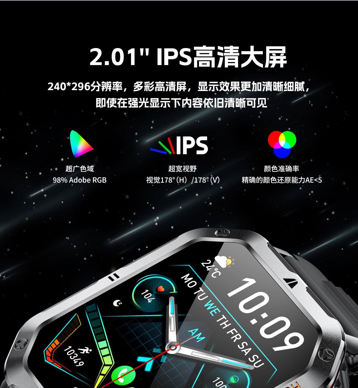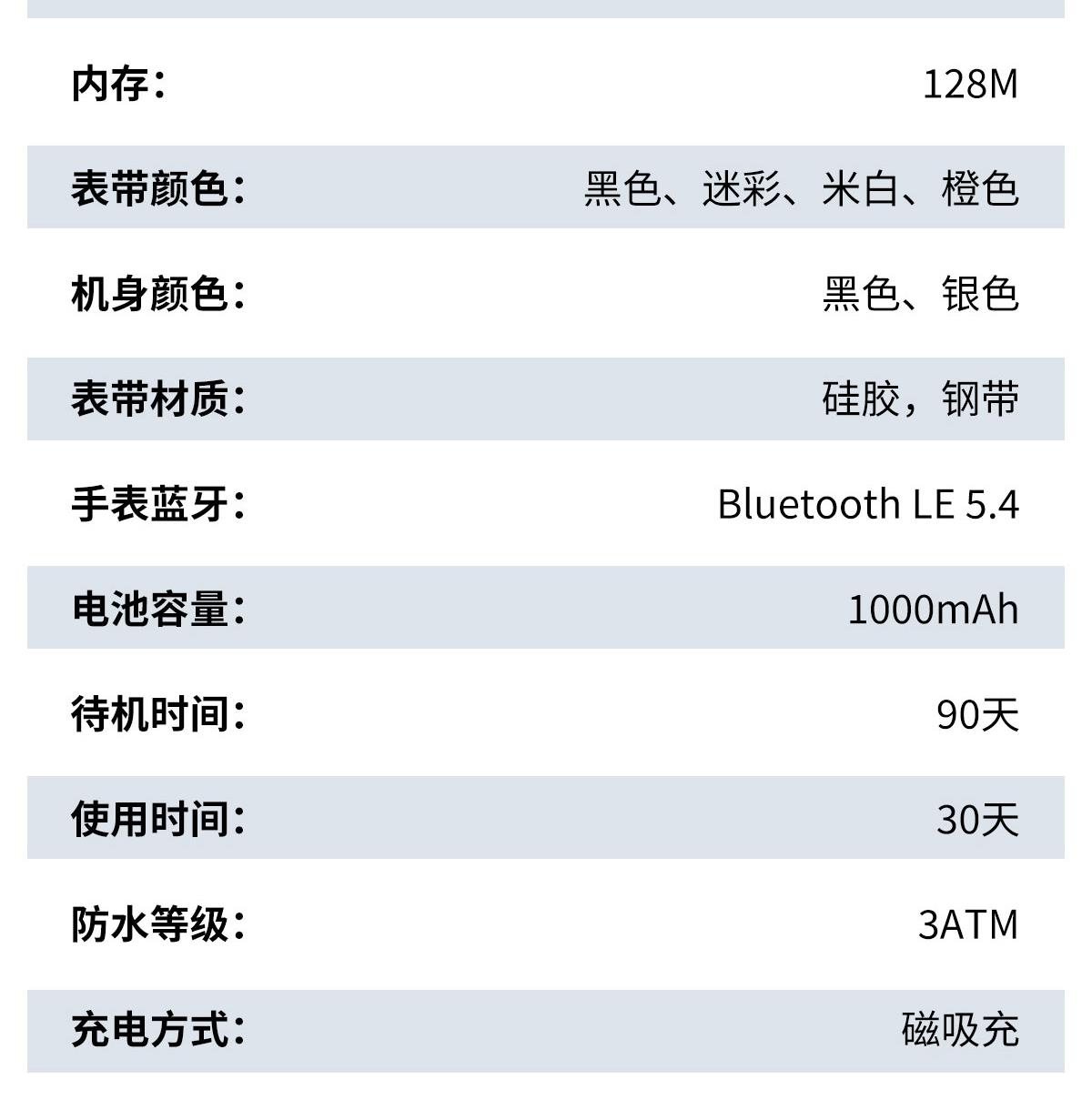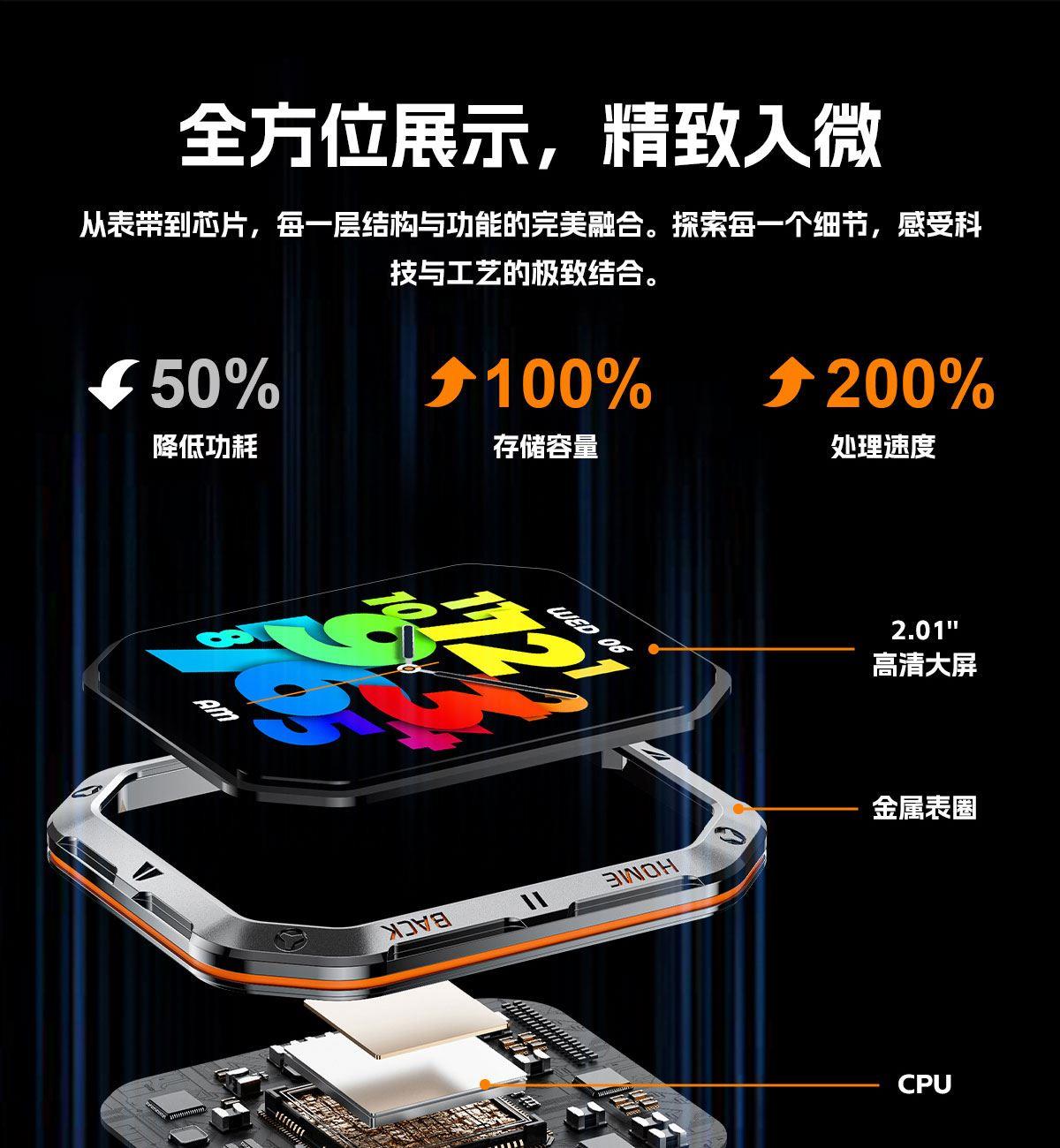 2.01 inch IPS彩屏、240*296、表盘市场、扫码连接、多套UI菜单、语音通话、OTA升级、计步、卡路里、运动模式、抬手亮屏、睡眠监测、来电提醒、消息提醒、久坐提醒、闹钟提醒、秒表、表盘切换、3D动态表盘、音乐播放、呼吸训练、整点测量、心率、血压、血氧、计算器、自定义表盘、亮度调节、天气、独立闹钟、运动轨迹、游戏等新功能