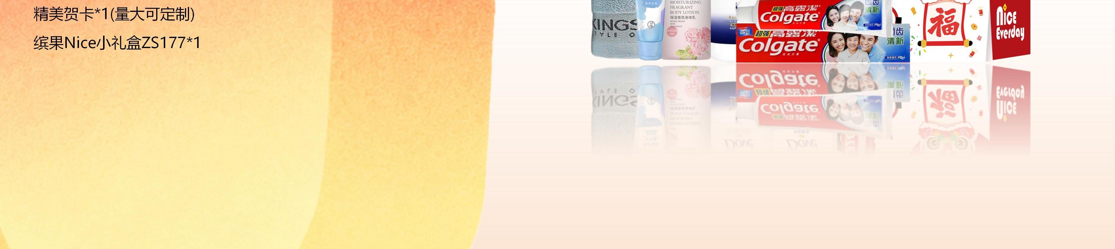 配置明细:(颜色香型随机) 多芬(DOVE) 密集滋养水润洗发乳460g*1 多芬(DOVE) 滋养美肤沐浴乳 460g*1 MissLilly蜜斯莉保湿香氛身体乳200ml*1 曼秀雷敦倍护嫩滑护手霜50g*1 高露洁固齿清新牙膏90g*1 高露洁超洁轻柔牙刷单支装*1 金号毛巾01KA0271A-105g*1 精美贺卡*1(量大可定制) 缤果Nice小礼盒ZS177*1