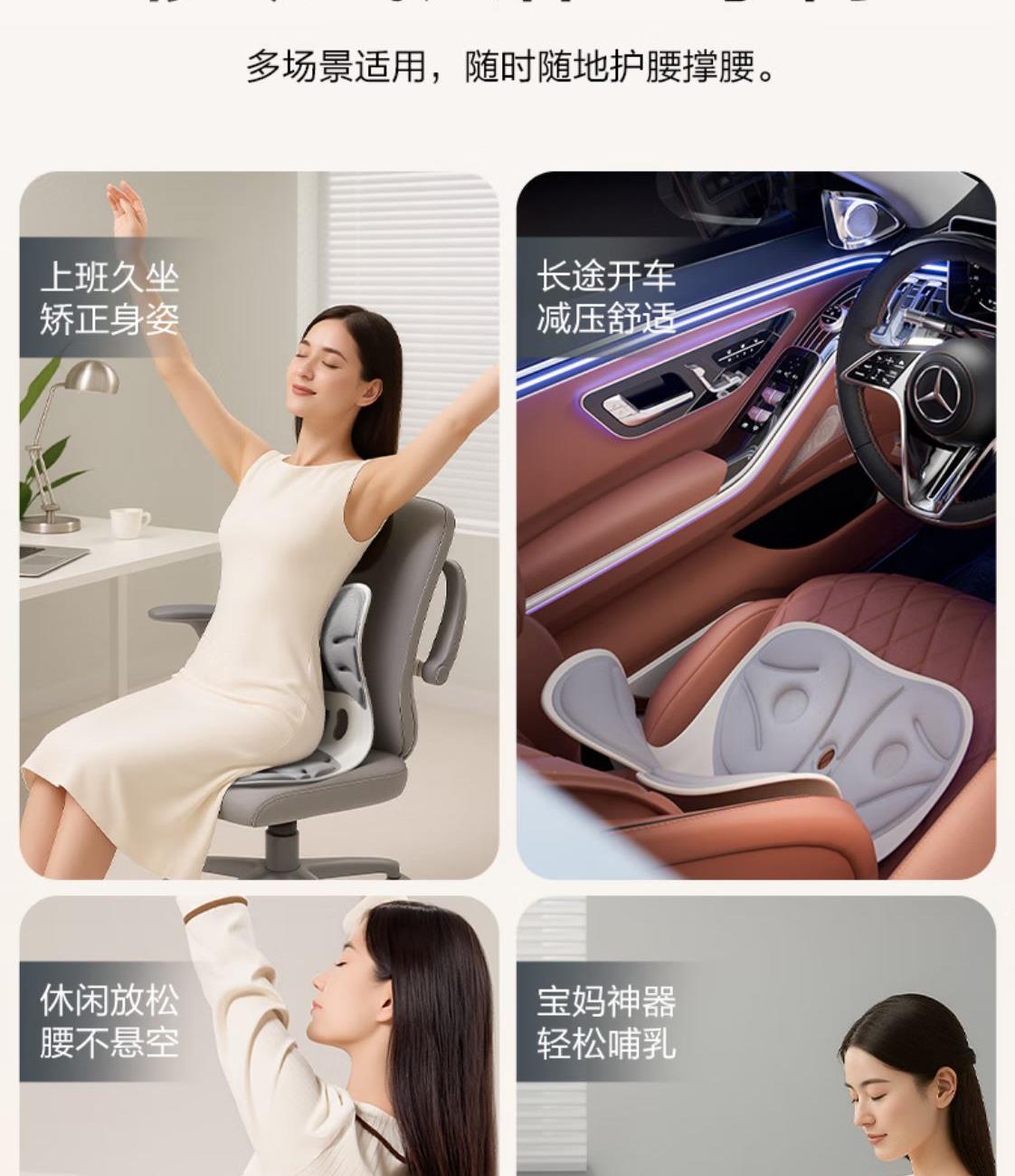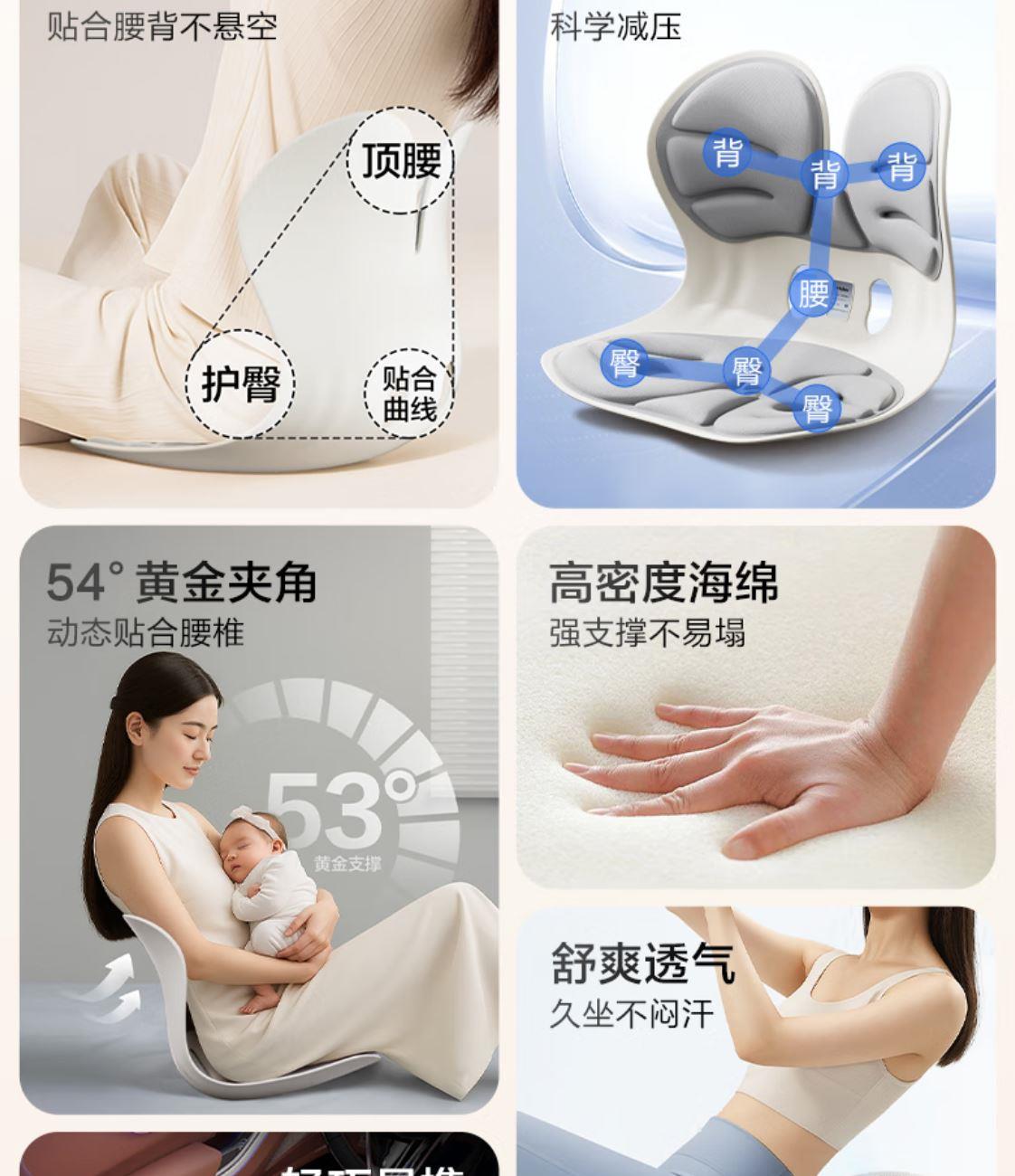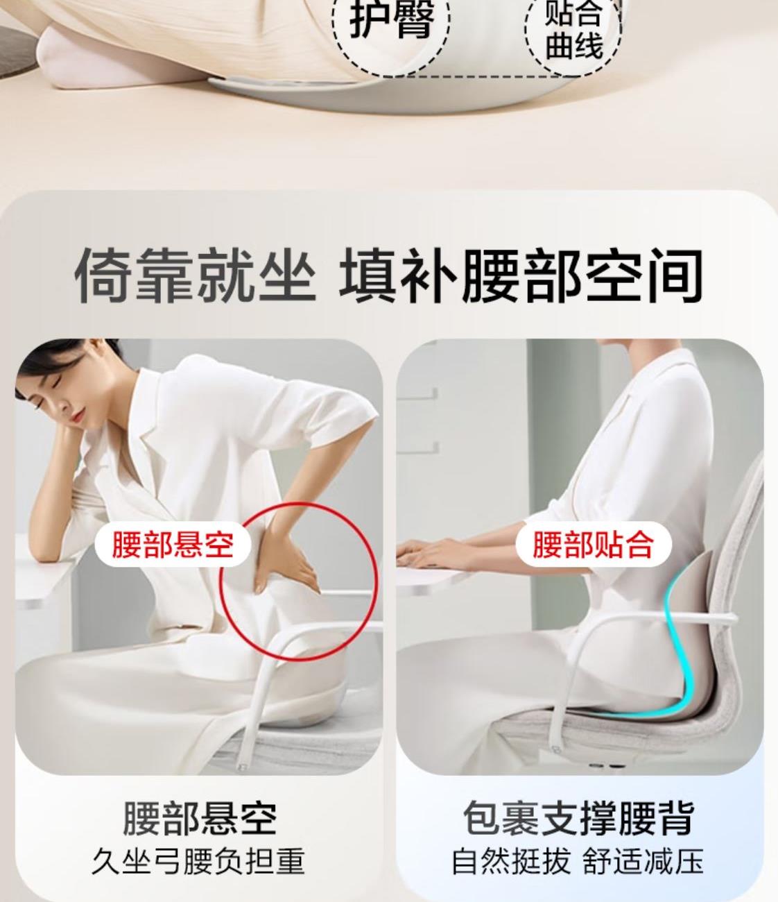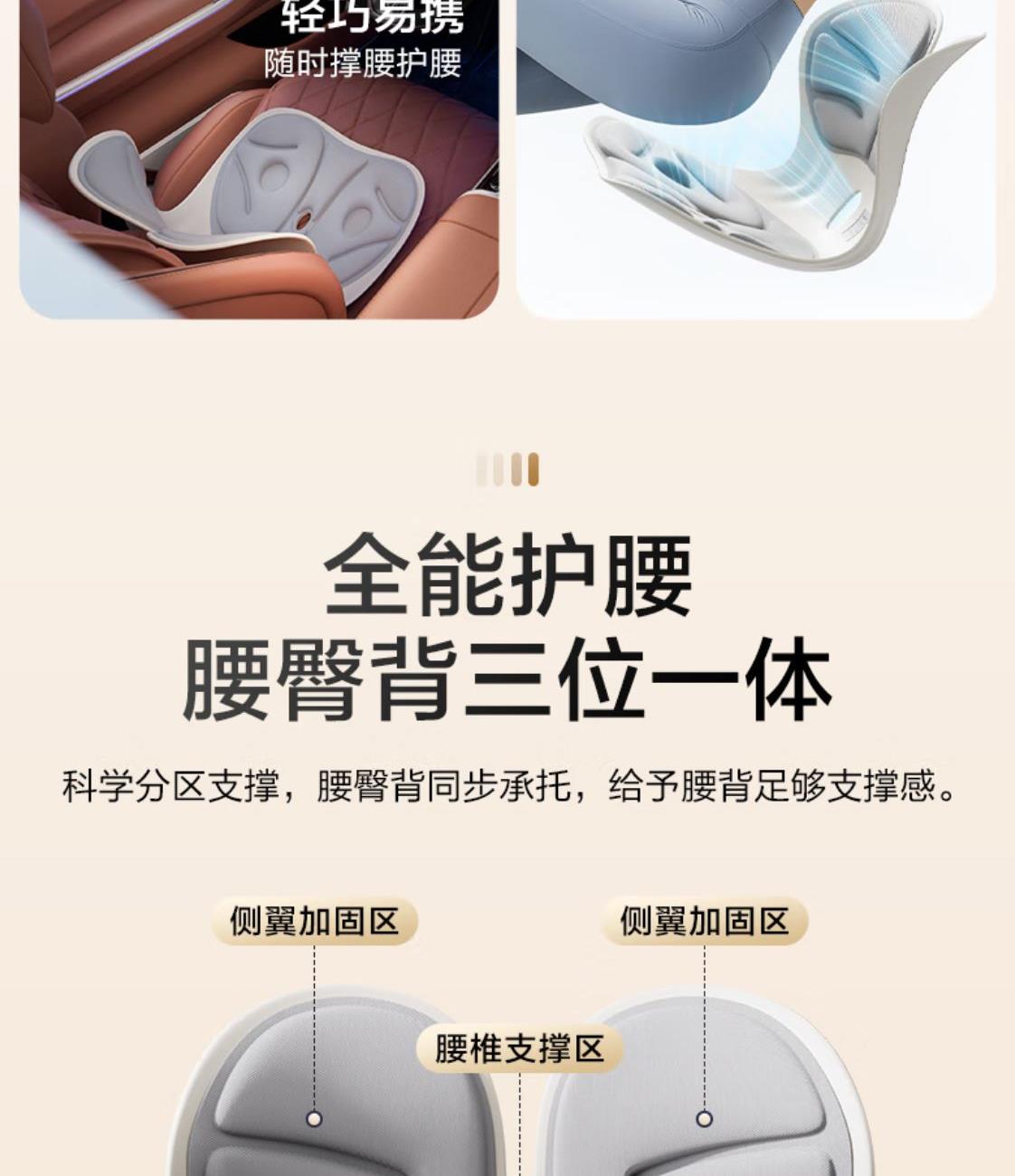 产品净重:1.15kg 产品毛重:1.25kg 产品尺寸:长410mm;宽310mm;高320mm 结构材质:聚丙酯材质 内芯材质:聚氨酯泡沫 包装清单:产品+说明书(含保修卡) 高密度海绵,强支撑不易塌。轻巧易携带 人体工程学设计,久坐不易累 53度黄金撑角,动态贴合,科学撑腰