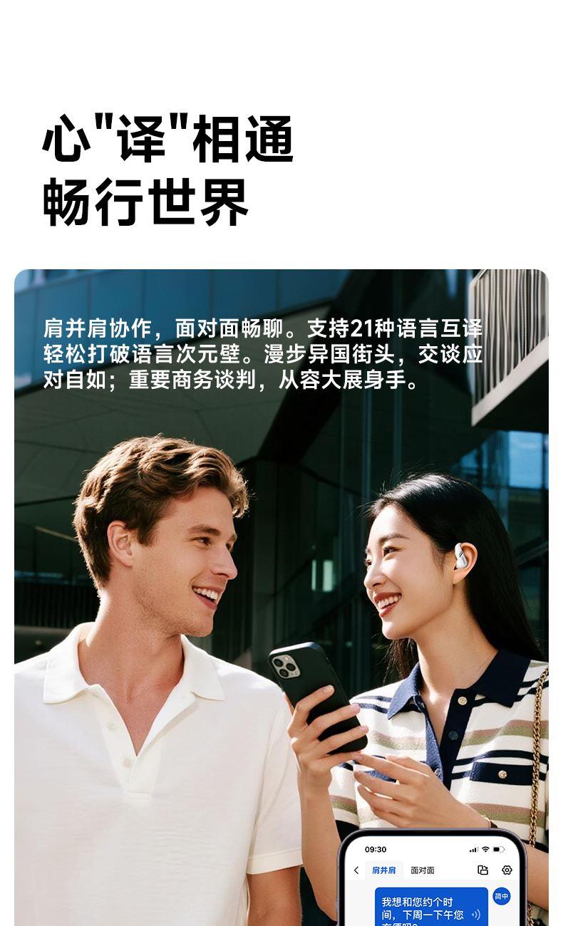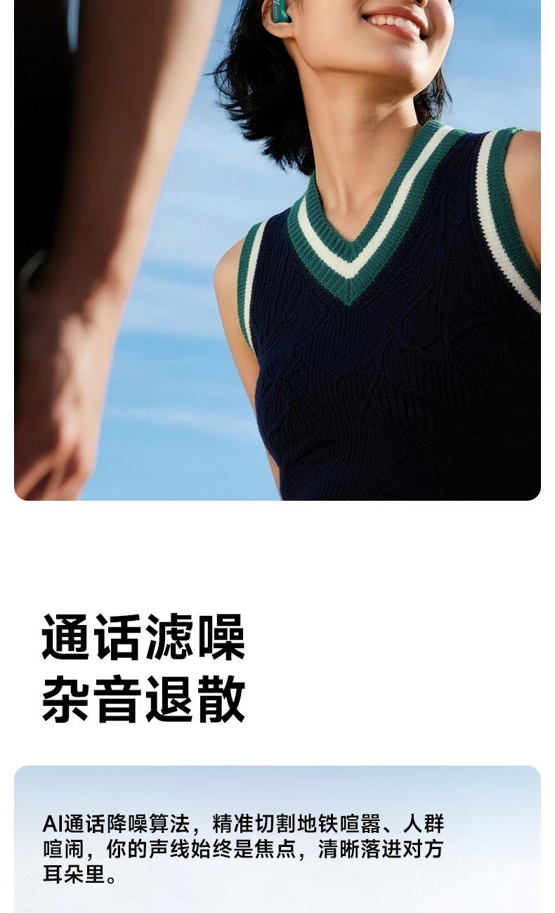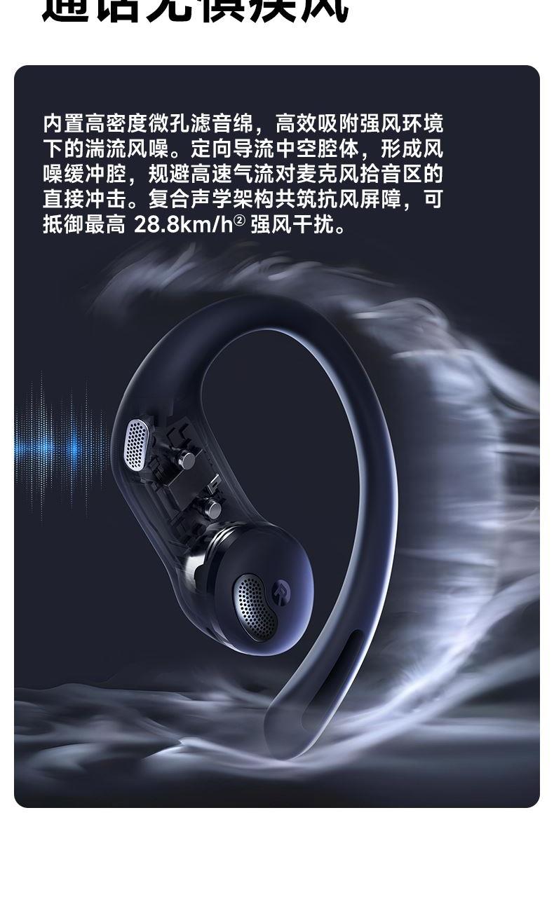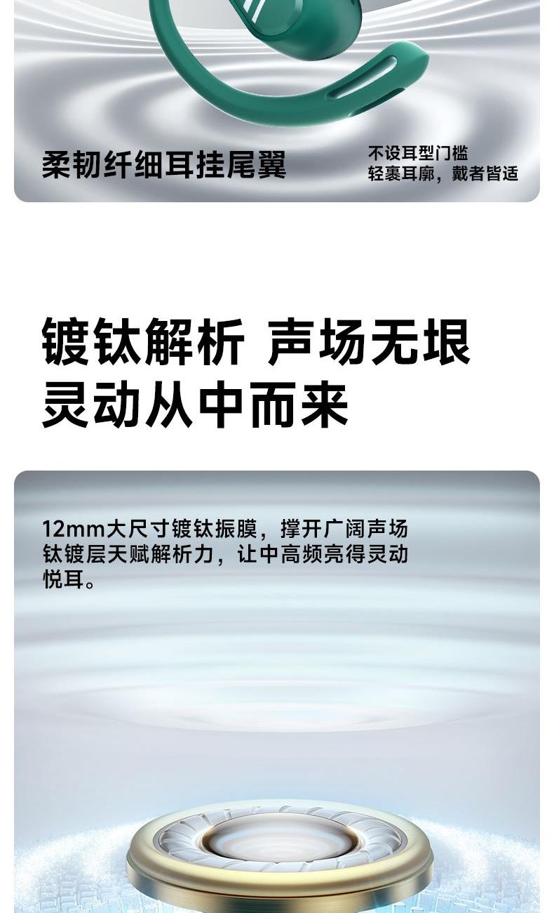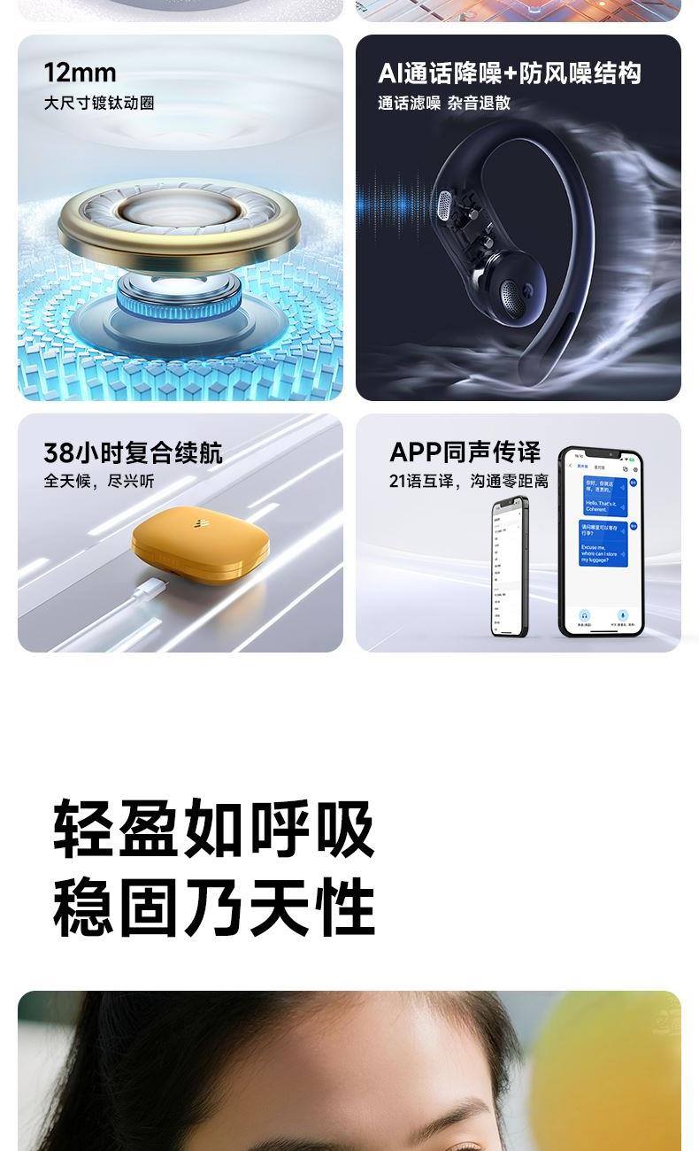 动态低频补偿 稳挂于耳,舒适无感 12mm大尺寸镀钛动圈 AI通话降噪+防风噪结构 APP同声传译