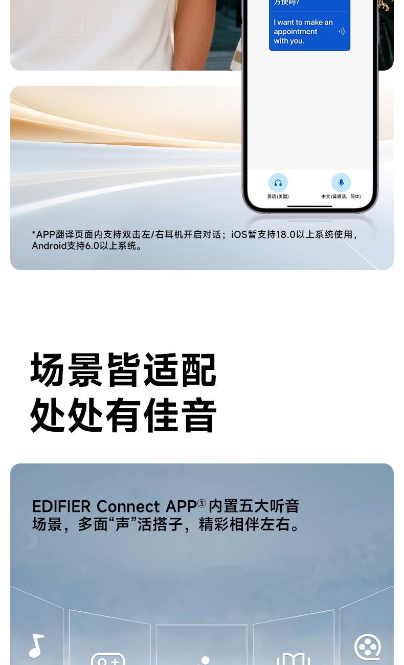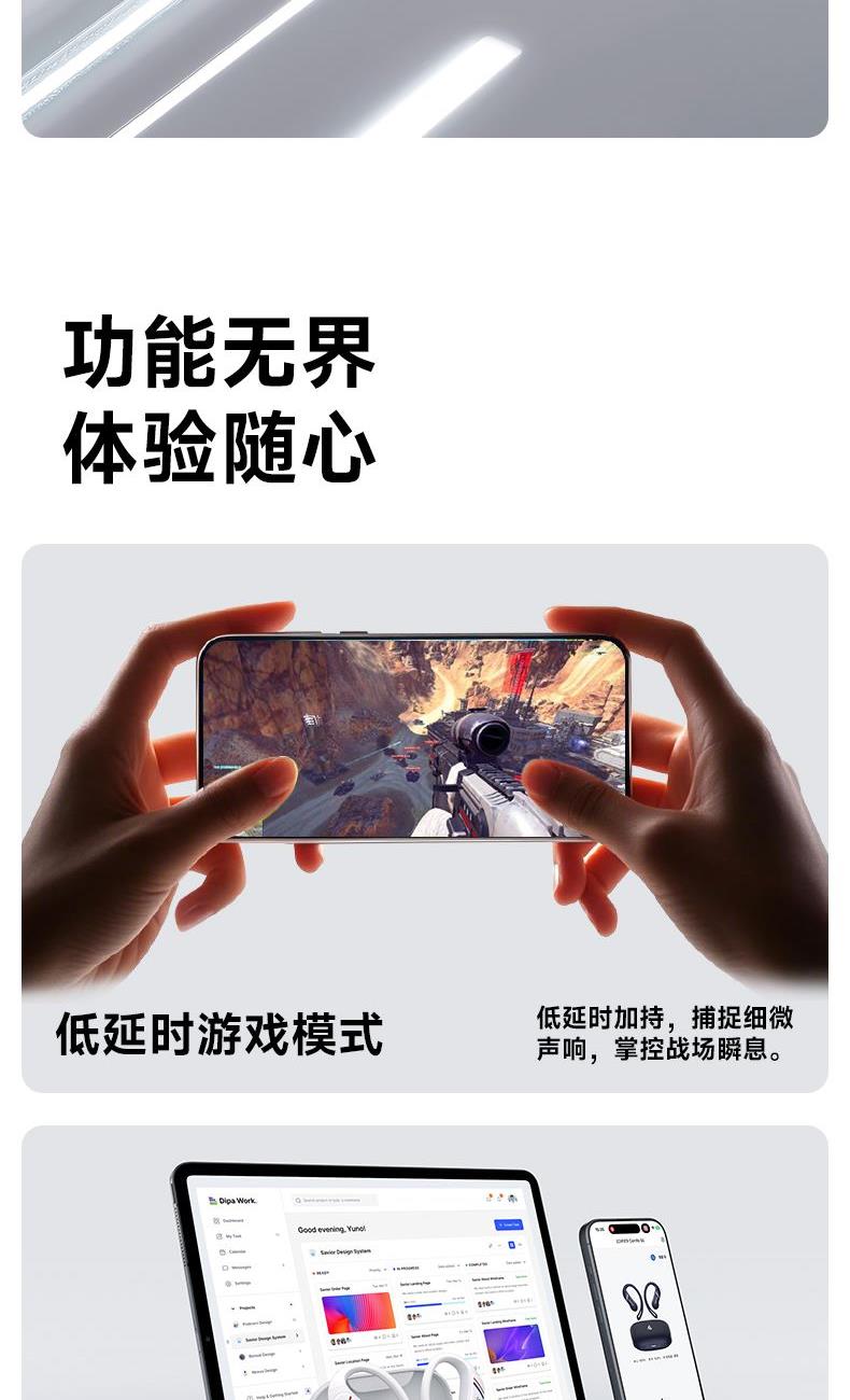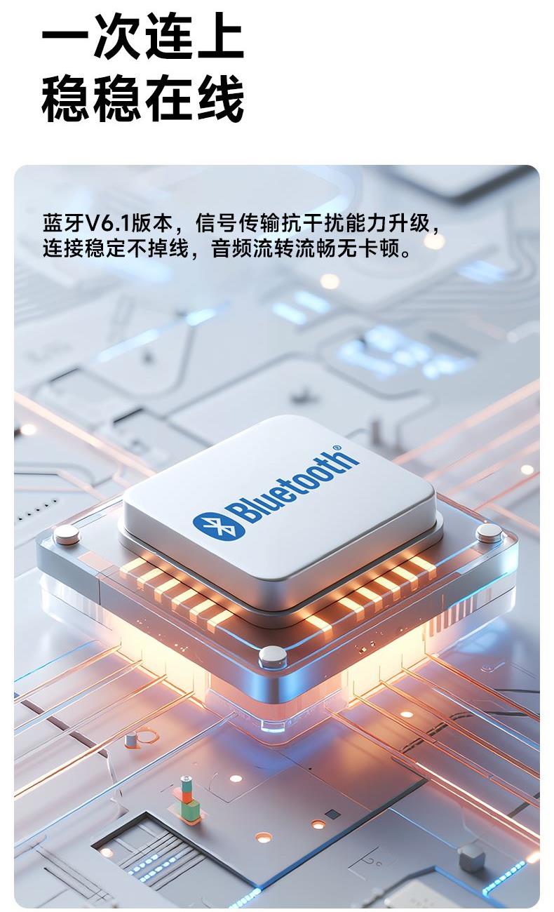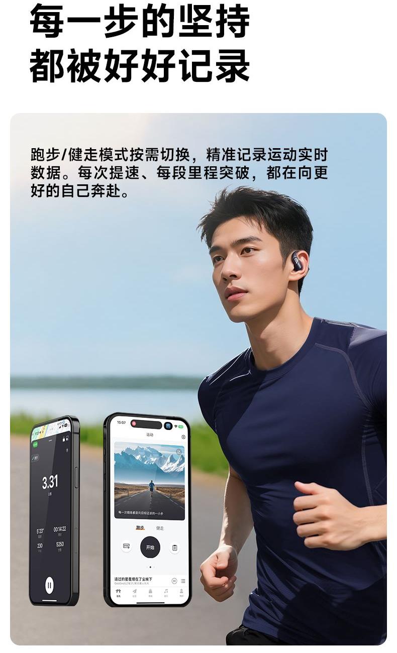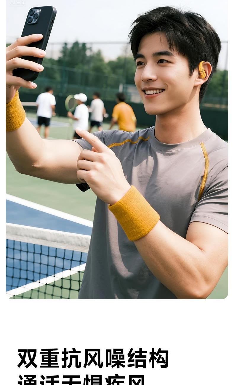 动态低频补偿 稳挂于耳,舒适无感 12mm大尺寸镀钛动圈 AI通话降噪+防风噪结构 APP同声传译