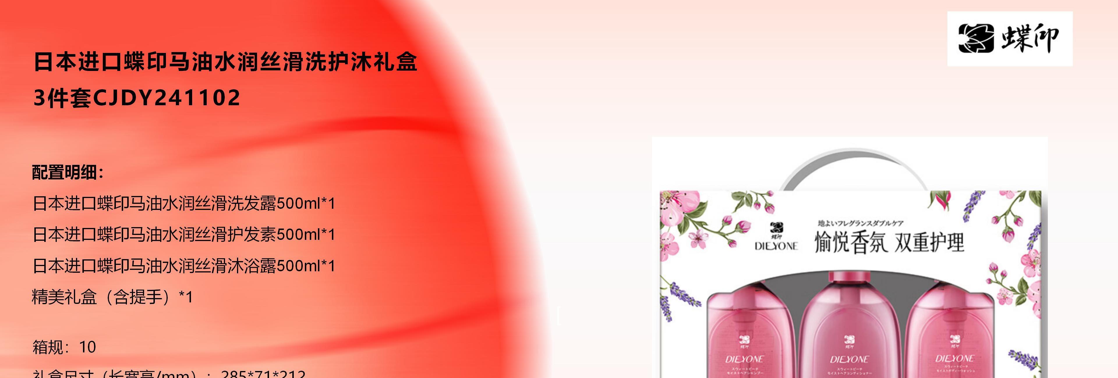 配置明细: 日本进口蝶印马油水润丝滑洗发露500ml*1 日本进口蝶印马油水润丝滑护发素500ml*1 日本进口蝶印马油水润丝滑沐浴露500ml*1 精美礼盒(含提手)*1 礼盒尺寸(长宽高/mm):285*71*212