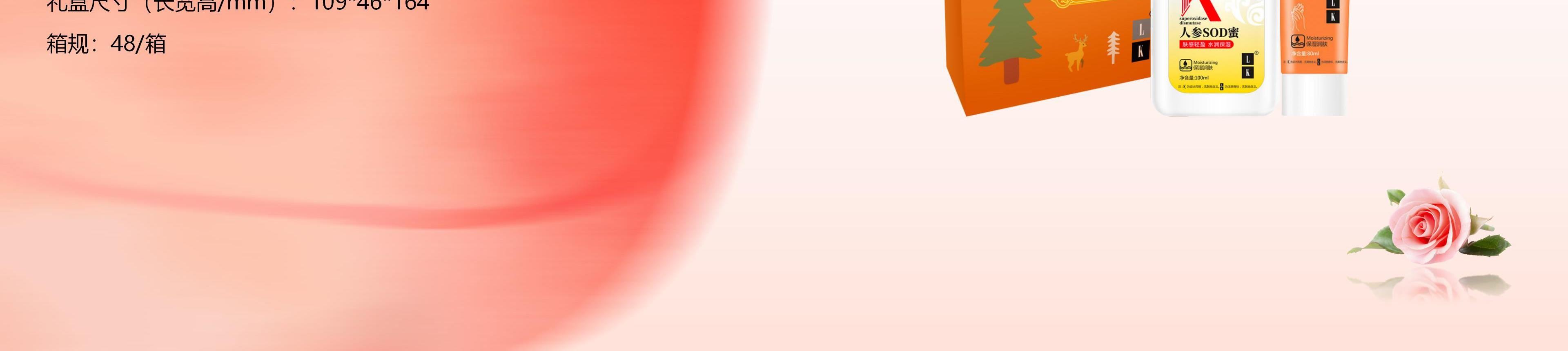 配置明细:香型随机 LK凡士林深层滋润护手霜80g*1 LK人参SOD蜜100g*1 LK精美礼盒*1 礼盒尺寸(长宽高/mm):109*46*164