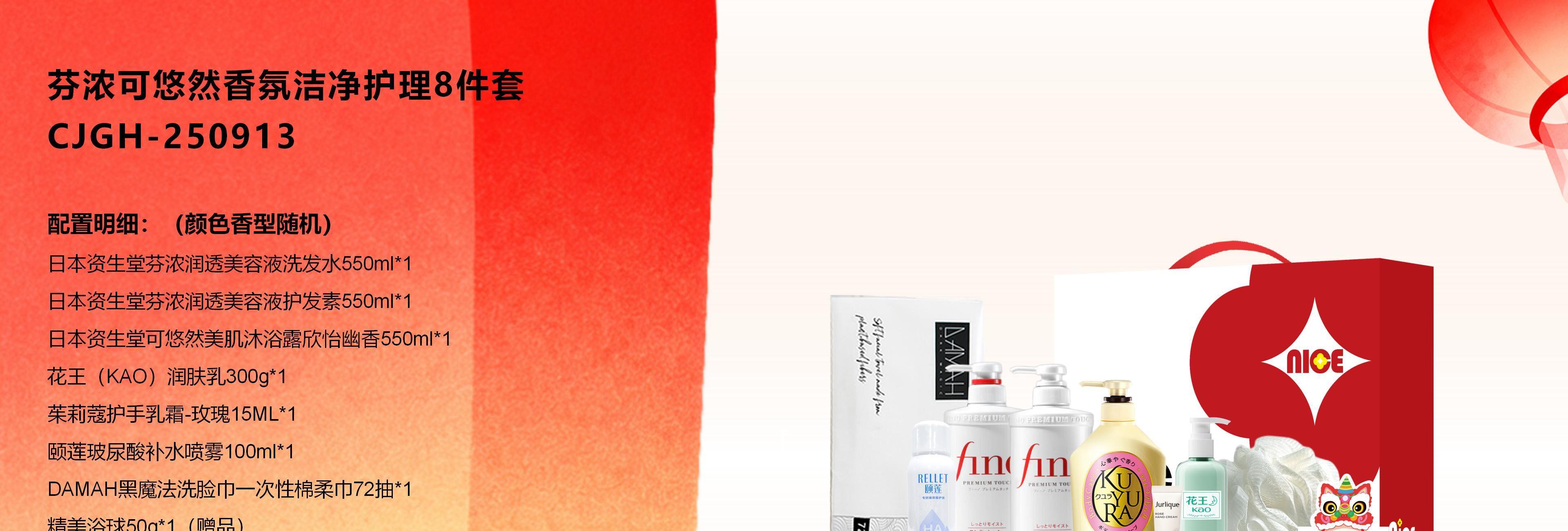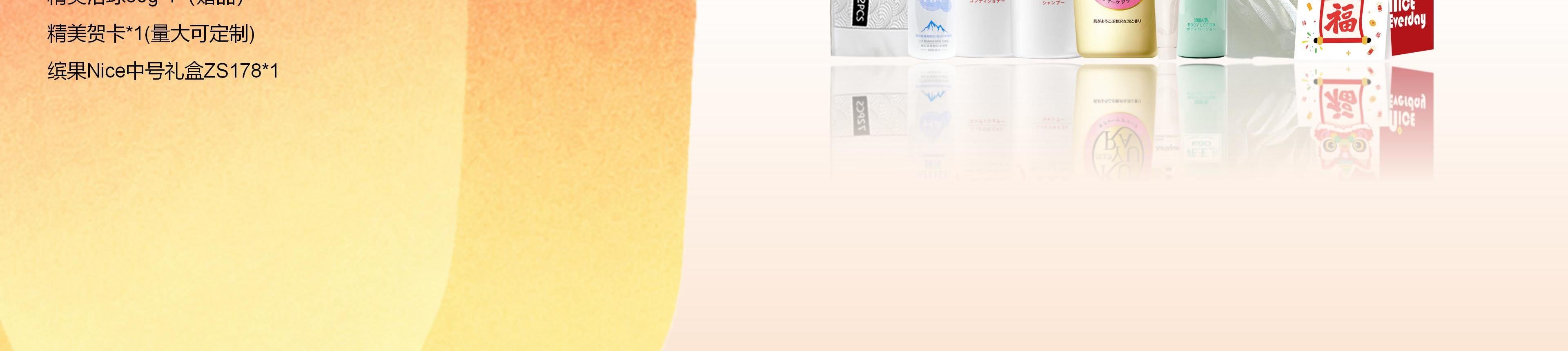 配置明细:(颜色香型随机) 日本资生堂芬浓润透美容液洗发水550ml*1 日本资生堂芬浓润透美容液护发素550ml*1 日本资生堂可悠然美肌沐浴露欣怡幽香550ml*1 花王(KAO)润肤乳300g*1 茱莉蔻护手乳霜-玫瑰15ML*1 颐莲玻尿酸补水喷雾100ml*1 DAMAH黑魔法洗脸巾一次性棉柔巾72抽*1 精美浴球50g*1(赠品) 精美贺卡*1(量大可定制) 缤果Nice中号礼盒ZS178*1