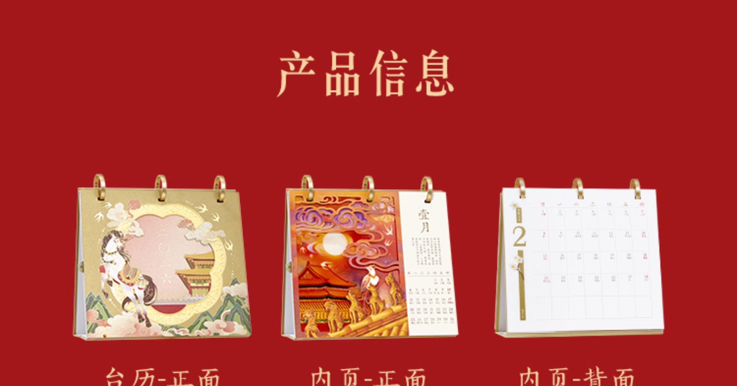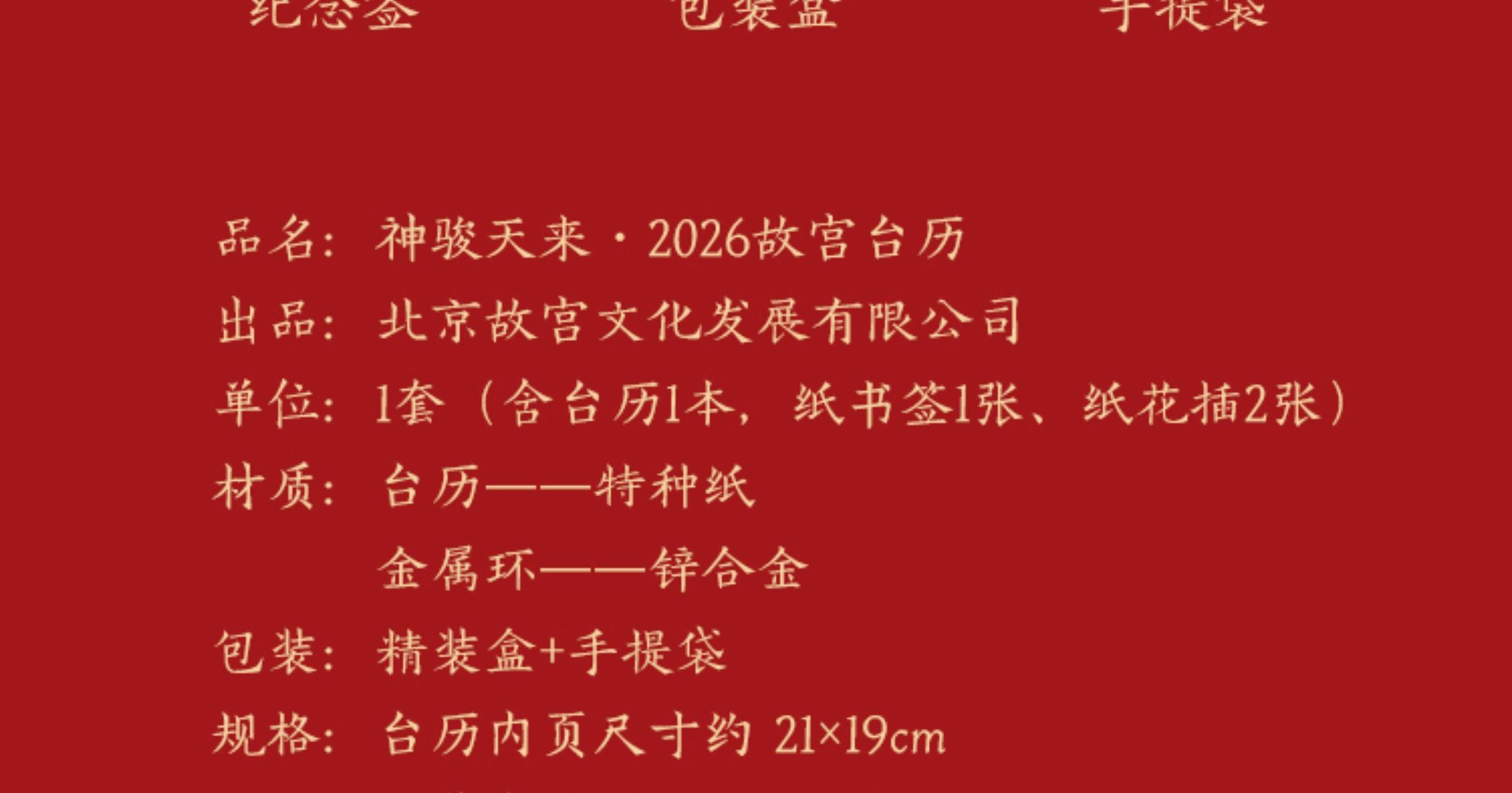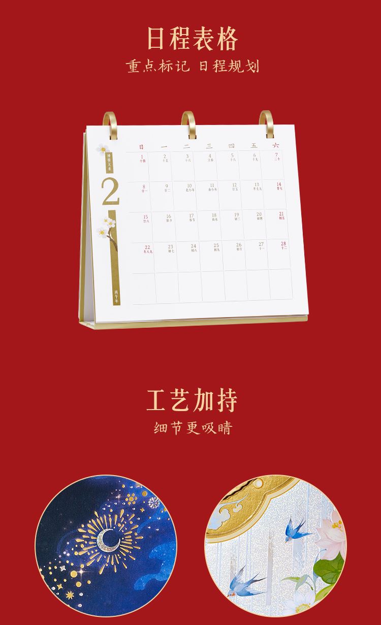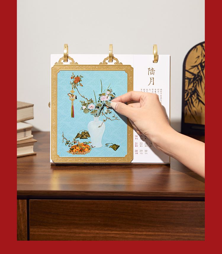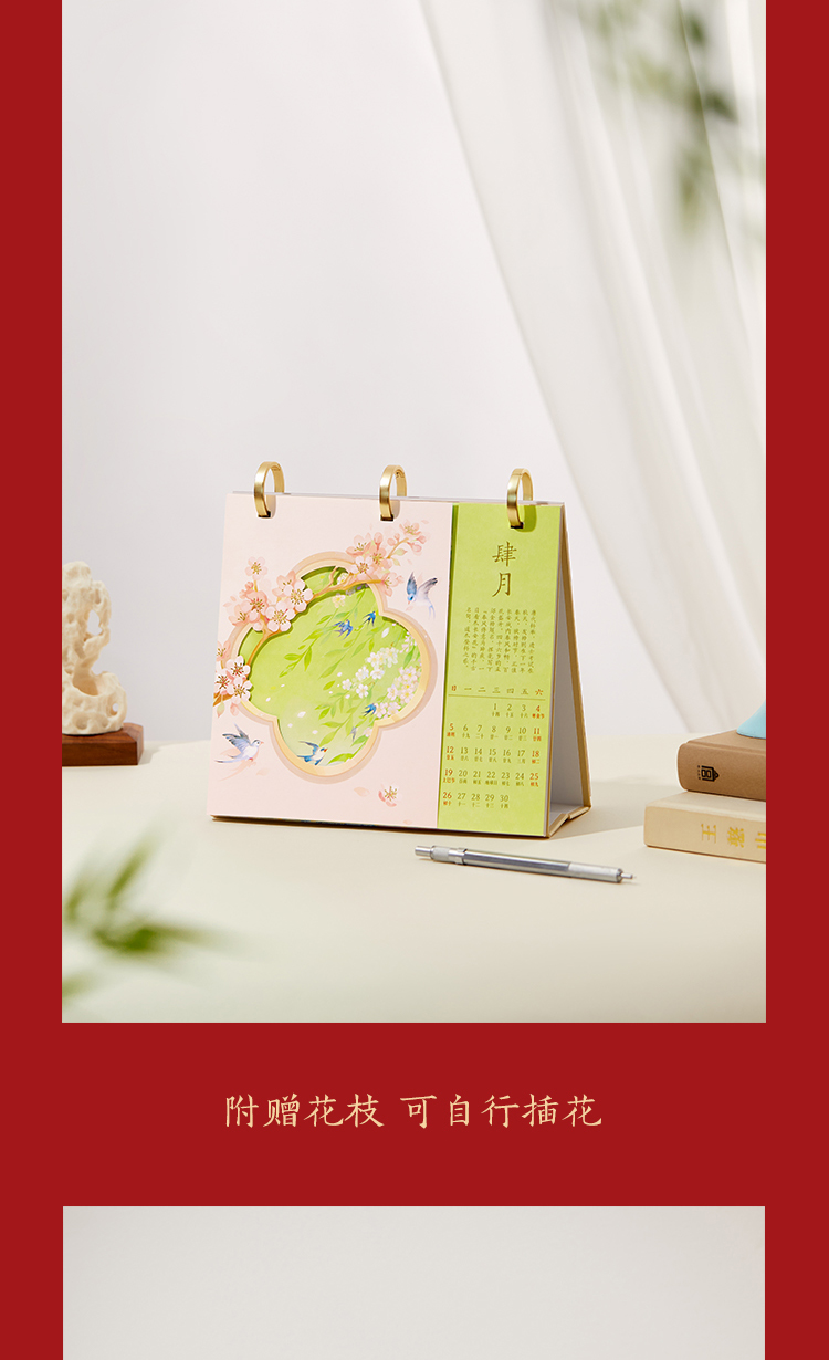 组成:1 套台历包含台历 1 本、纸书签 1 张、纸花插 2 张 材质:台历采用特种纸,金属环为锌合金 包装:配备精装盒与手提袋 规格:台历内页尺寸约 21×19cm,包装盒尺寸约 22.5×22.5×4.2cm 包装:约35x15x5cm